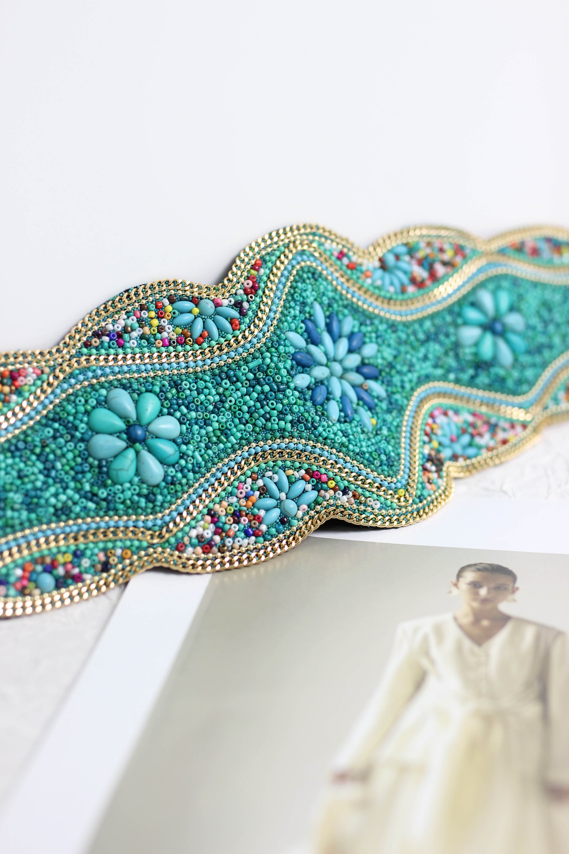 Take Boheimia beads belt to your life and unleash your inner free soal. This belt features a stretch base with turquoise beads and stones detail, snap button closure.