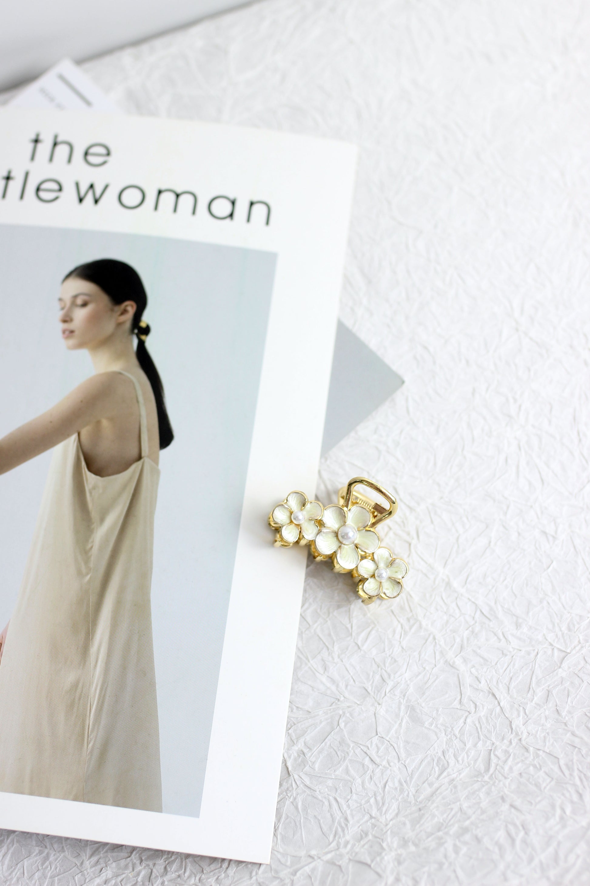 This Floral Hair Clip features a flower detail with gold hardwear, one size, claw closure. Approx. 5cm