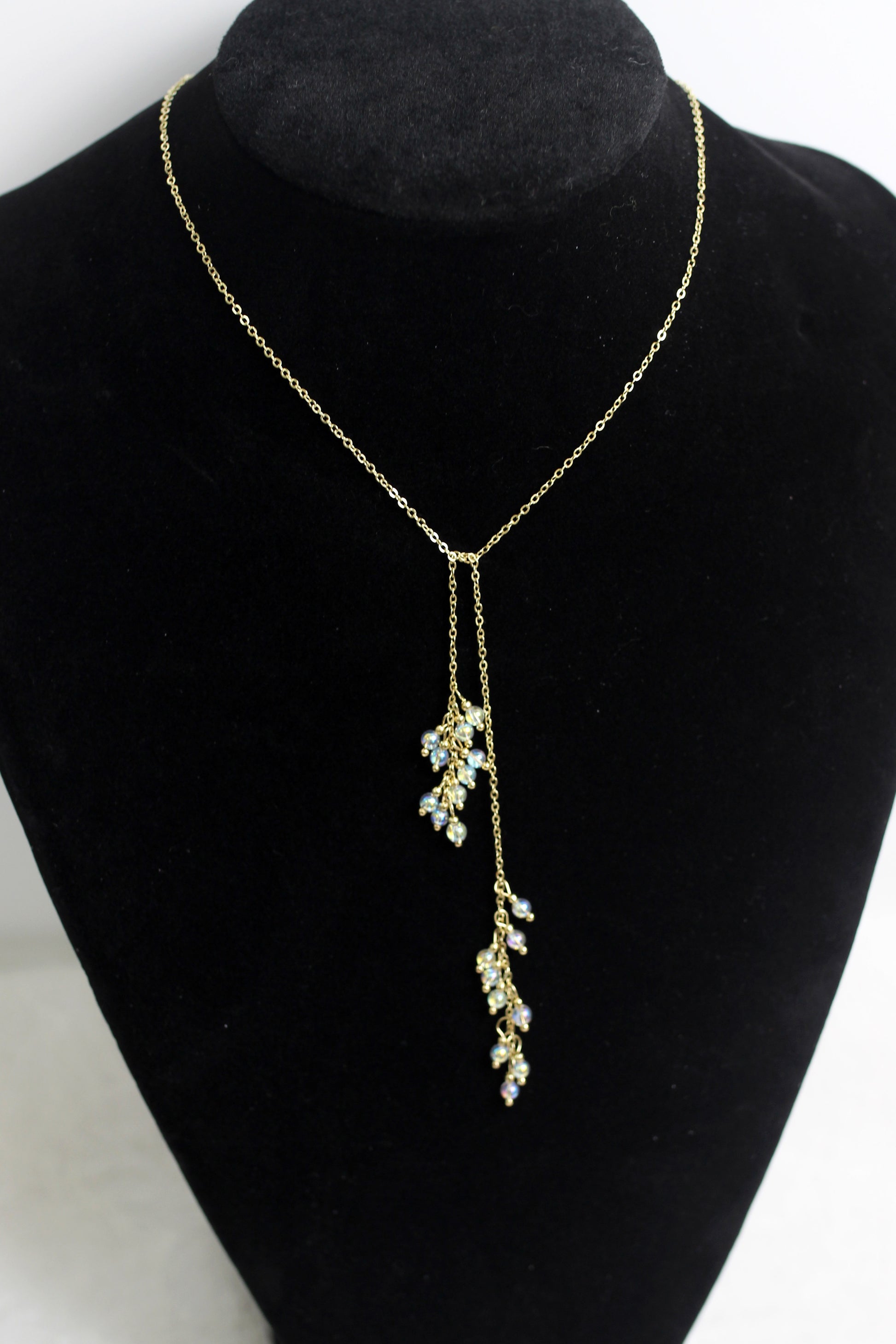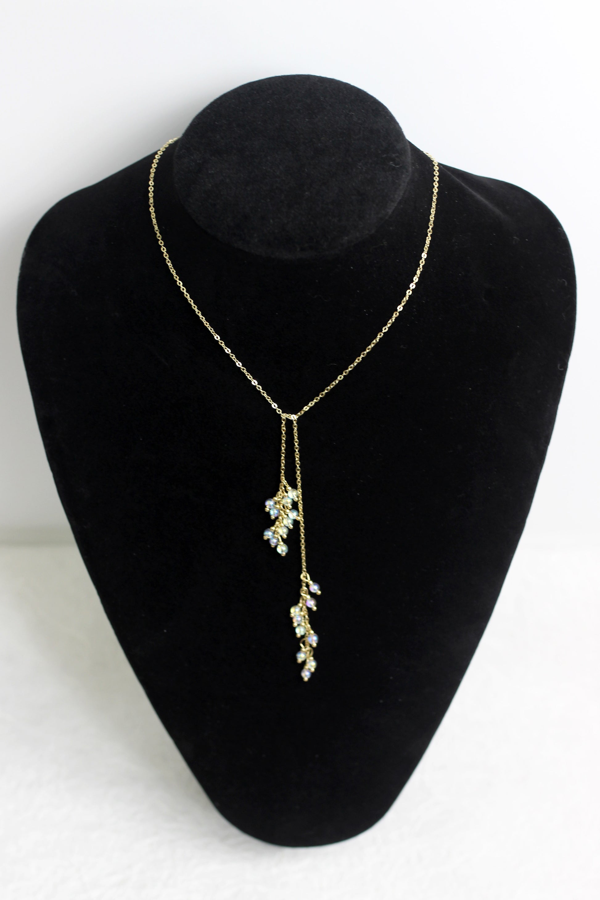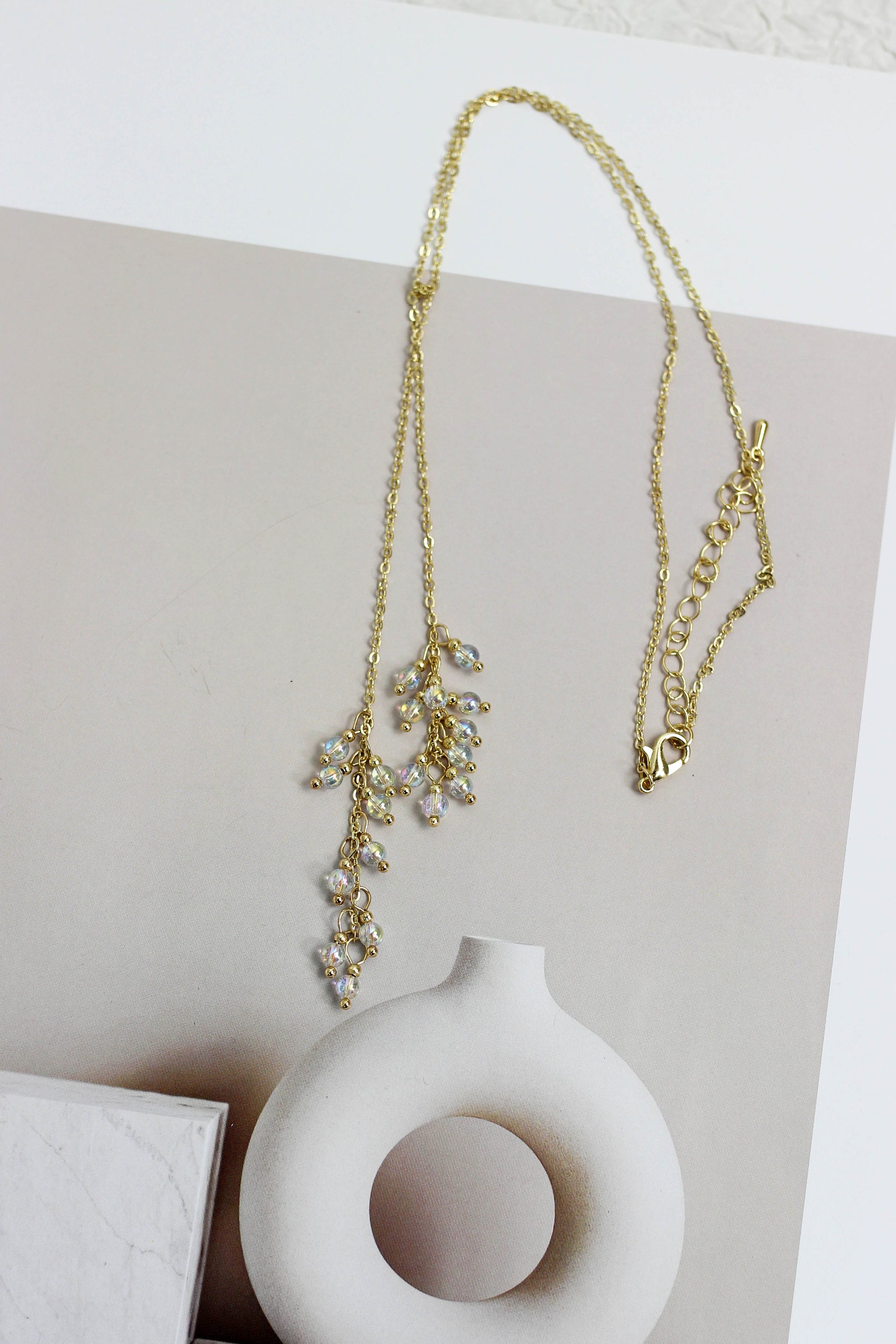 This elegant lariat necklace features a fine gold chain that culminates in two beautiful floral pendants. Each pendant is crafted with delicate gold branches adorned with sparkling crystals, creating a sophisticated and feminine look. The necklace's Y-shape design adds a touch of modernity, making it perfect for both casual and formal occasions. This piece is versatile and stylish, ideal for enhancing any outfit with its refined charm and delicate detailing.