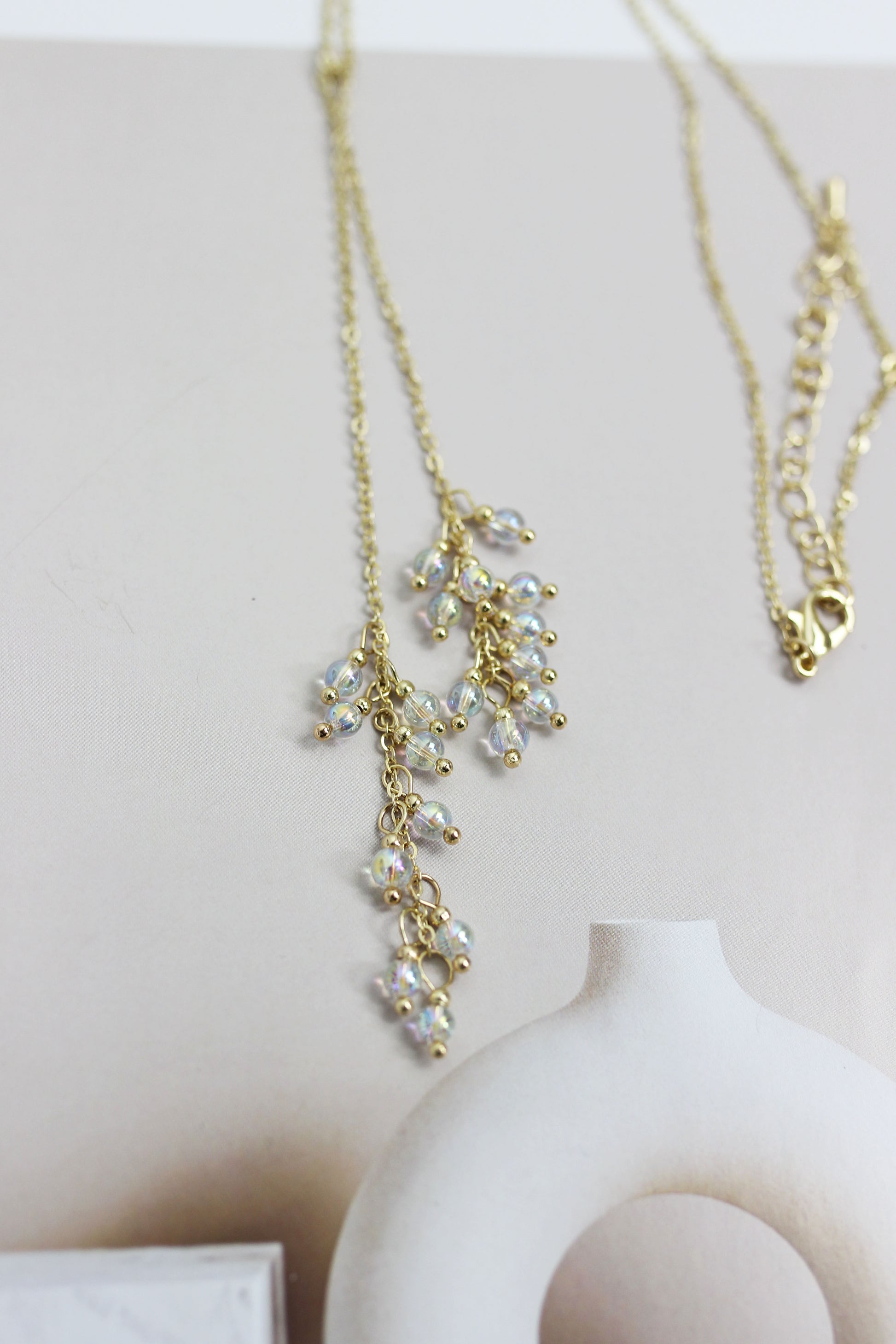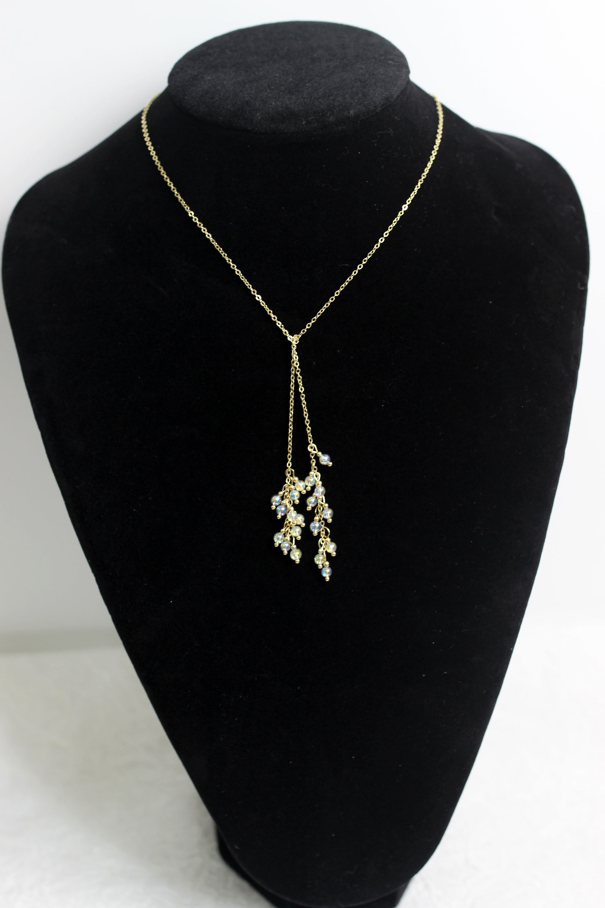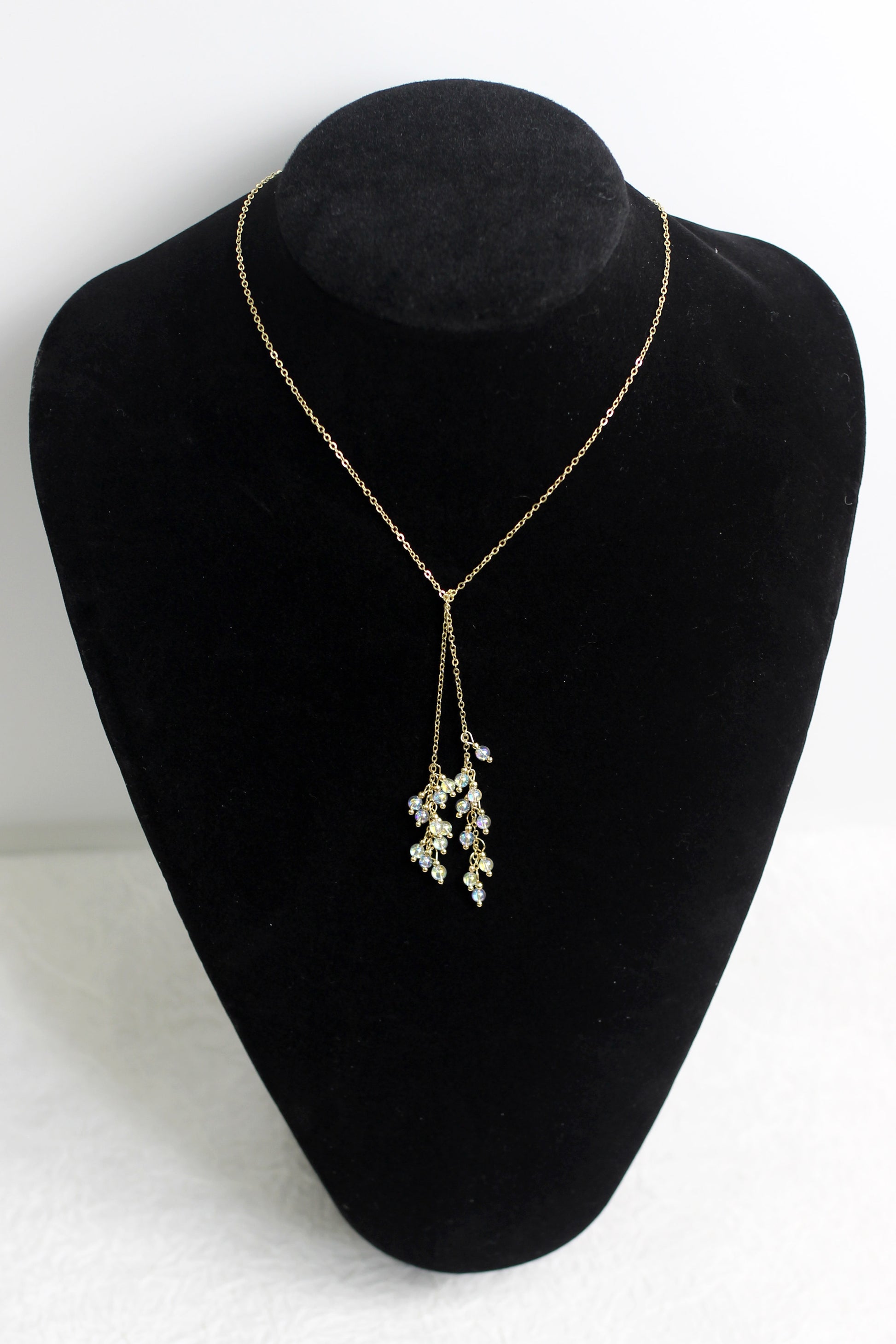 This elegant lariat necklace features a fine gold chain that culminates in two beautiful floral pendants. Each pendant is crafted with delicate gold branches adorned with sparkling crystals, creating a sophisticated and feminine look. The necklace's Y-shape design adds a touch of modernity, making it perfect for both casual and formal occasions. This piece is versatile and stylish, ideal for enhancing any outfit with its refined charm and delicate detailing.