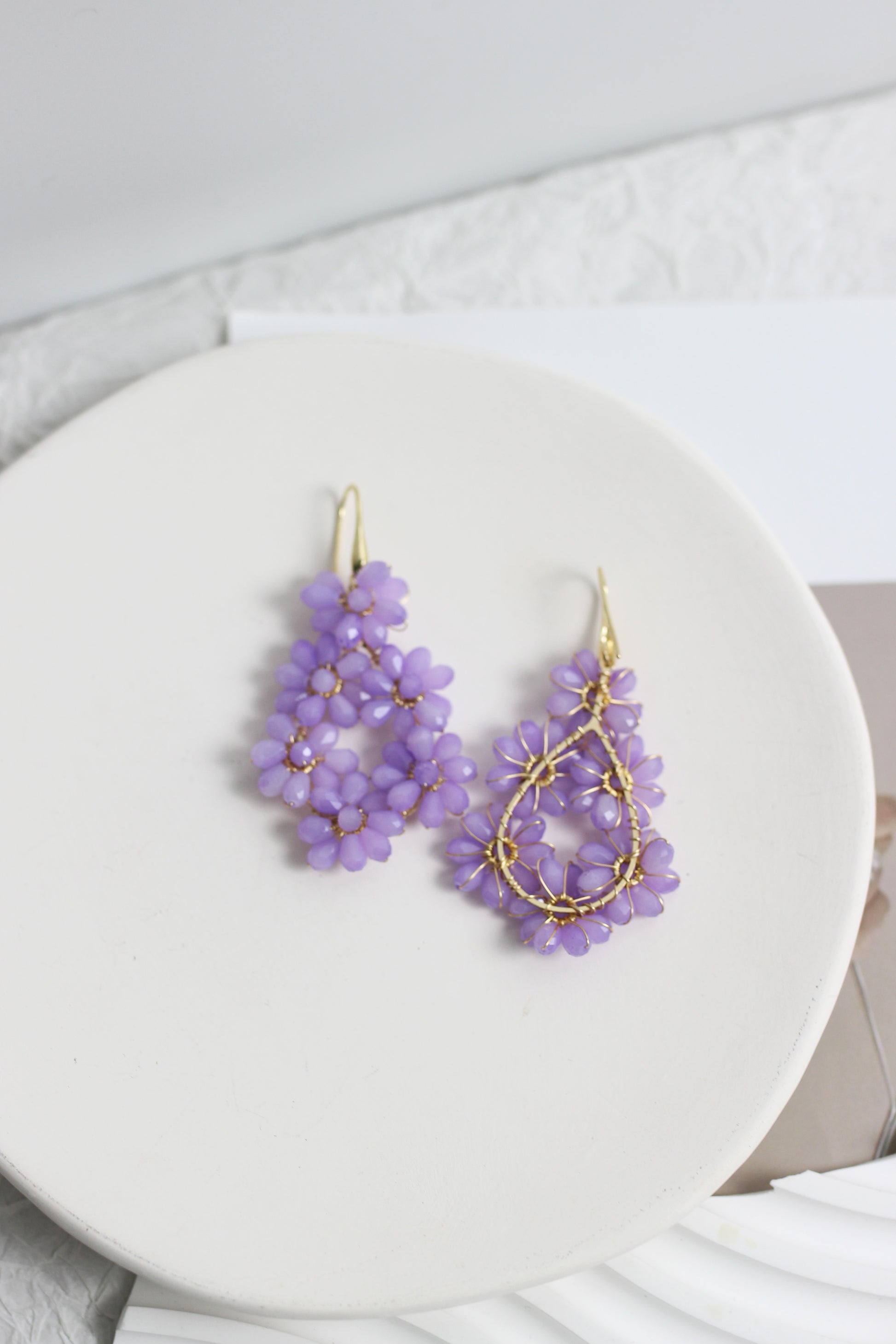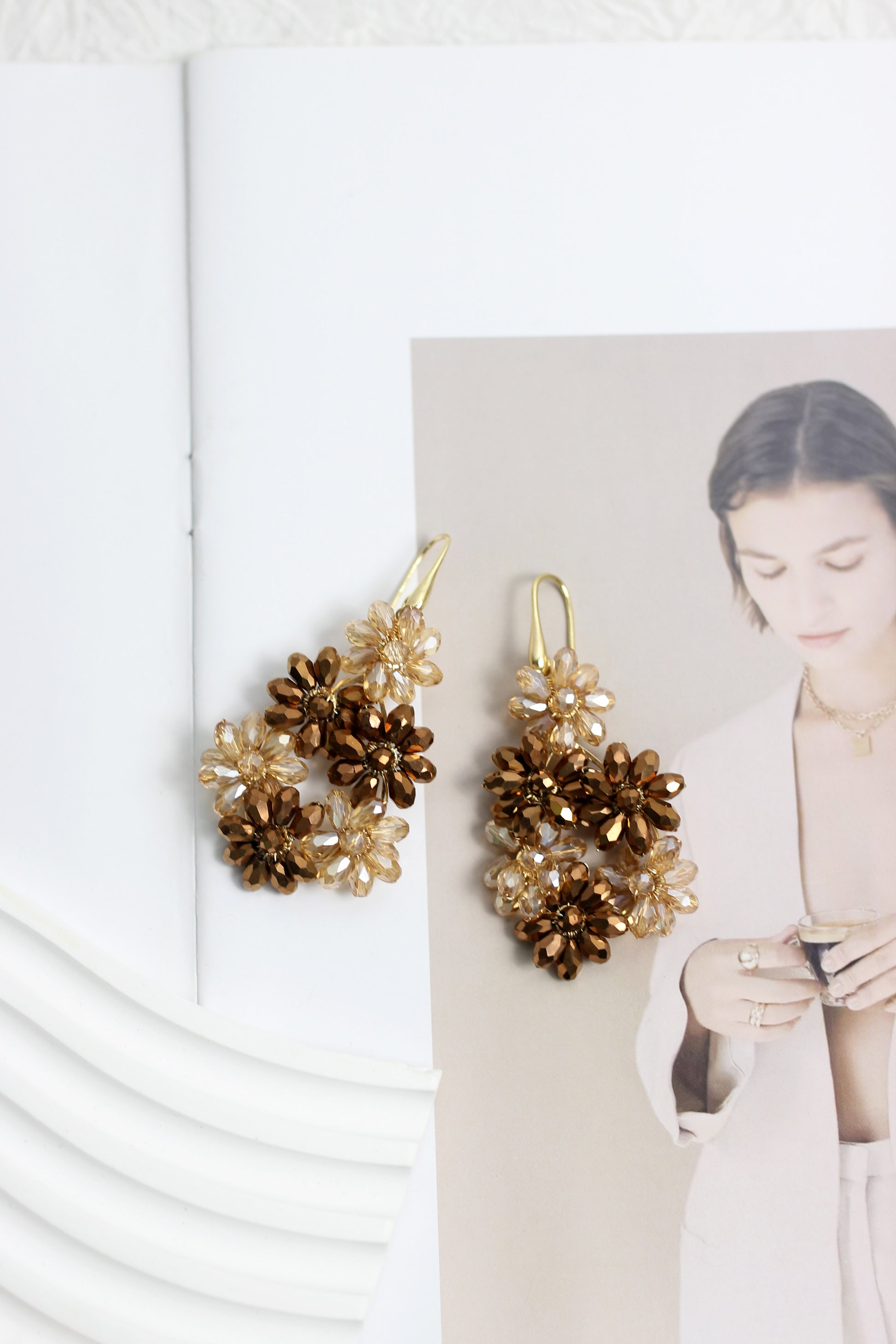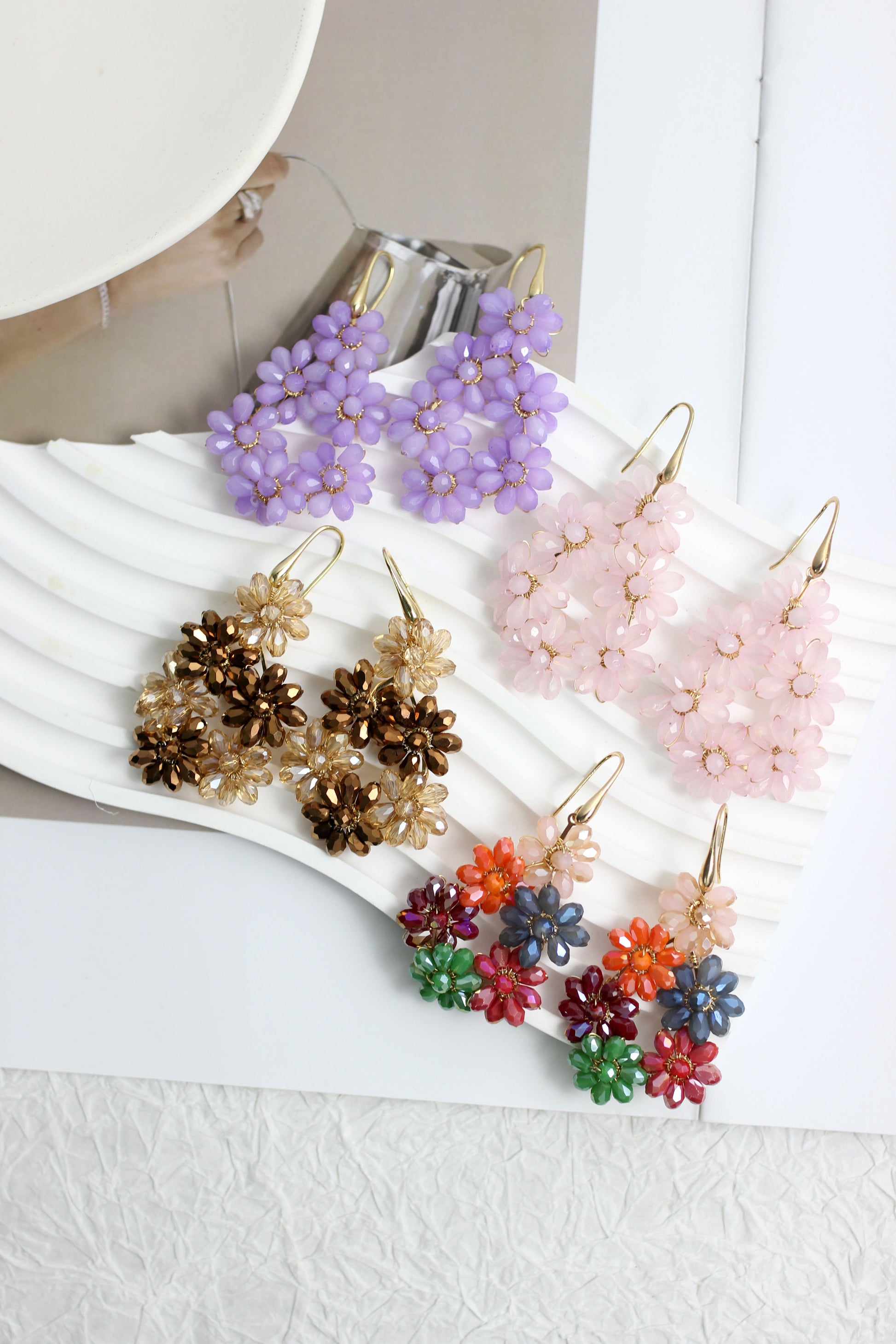 These elegant earrings feature a cluster of delicate flowers arranged in a teardrop shape. Each earring is composed of small, intricately designed flowers with petal-like beads that create a lush and vibrant look. The flowers are set in a gold-tone base, enhancing their intricate detailing and adding a touch of sophistication. The earrings are lightweight, making them comfortable to wear, and are perfect for adding a floral accent to any outfit.