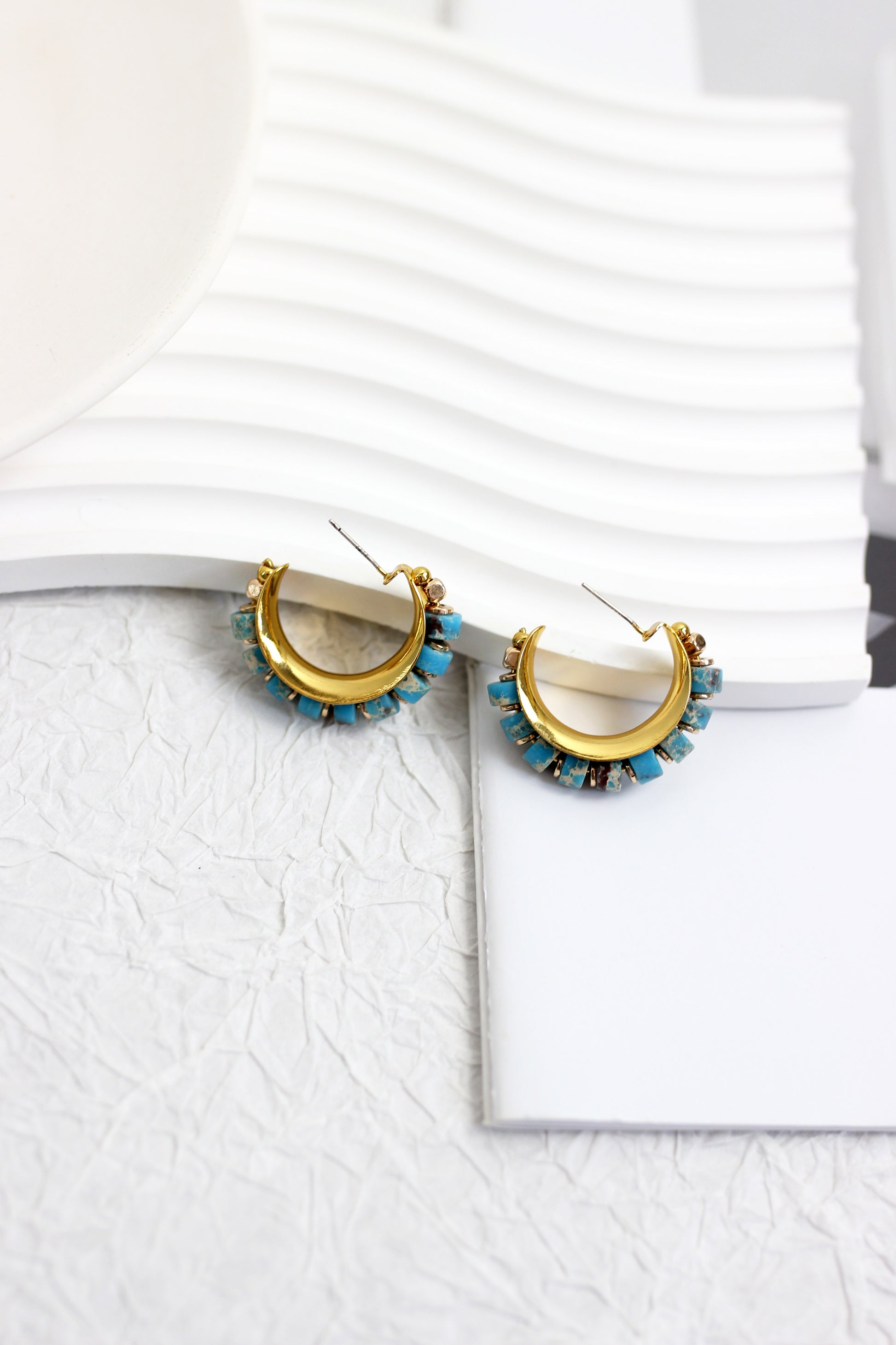 These stylish hoop earrings feature a striking combination of turquoise stones and gold-tone metal. The hoops are adorned with smooth turquoise beads, giving them a vibrant and earthy appeal. The beads are set along the outer edge of the gold-tone hoop, creating a beautiful contrast and adding a pop of color. Perfect for adding a touch of bohemian chic to any outfit, these earrings are versatile enough for both casual and dressy occasions.
