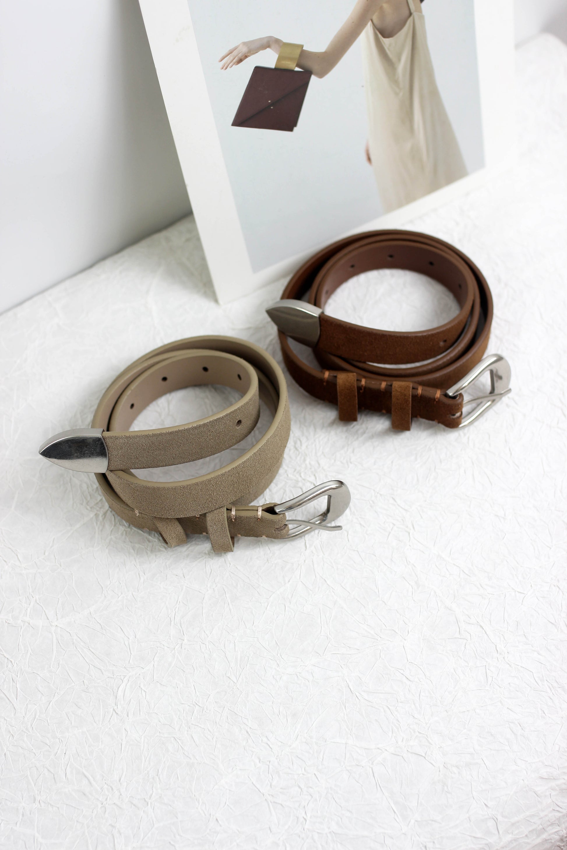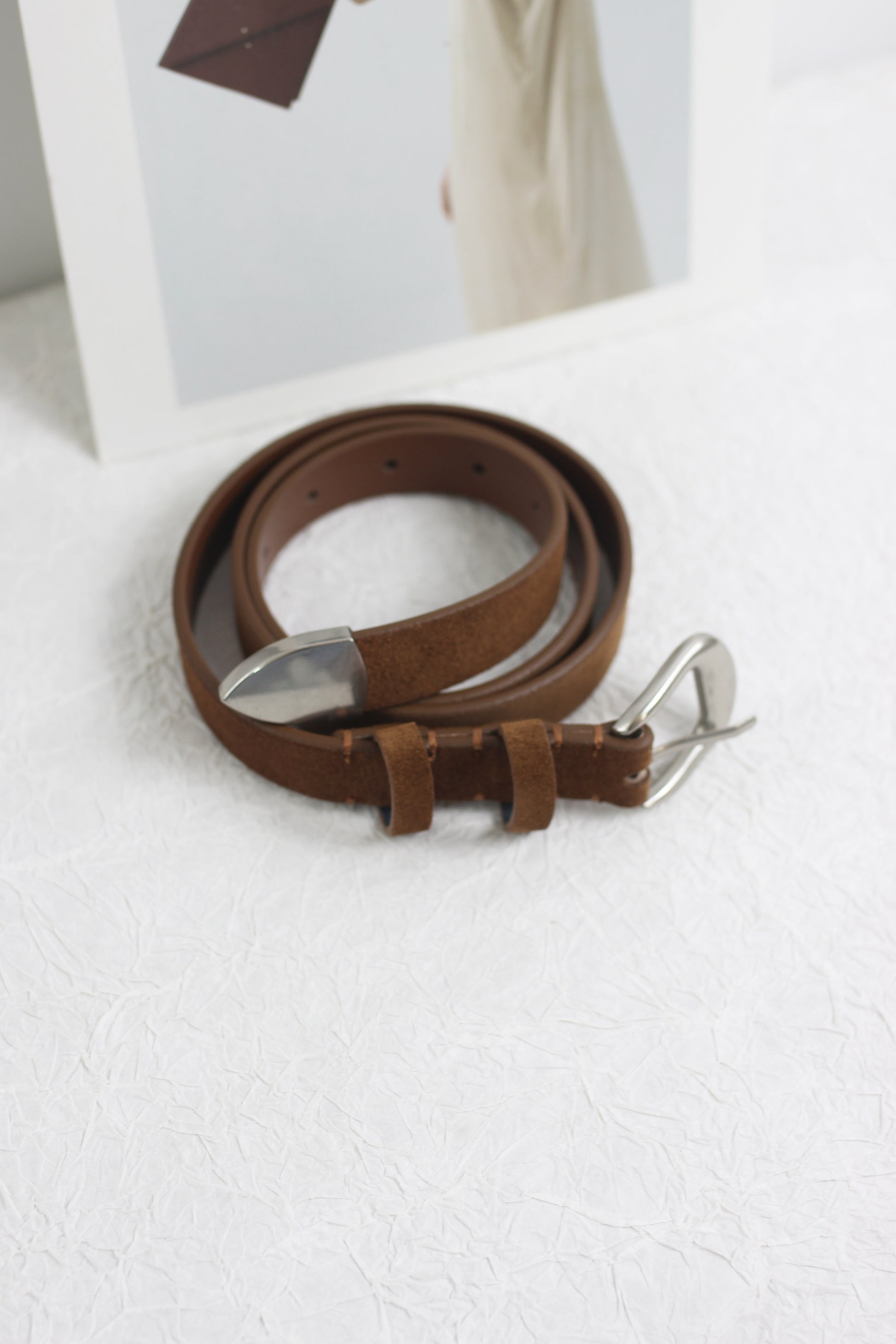 This Classic Suede Belt is a timeless accessory that adds a touch of sophistication to any outfit. Crafted from high-quality suede, it features a sleek metal buckle and a pointed tip for a refined look. The belt's minimalist design makes it versatile enough to pair with both casual and formal attire, offering a polished finish to your ensemble.
