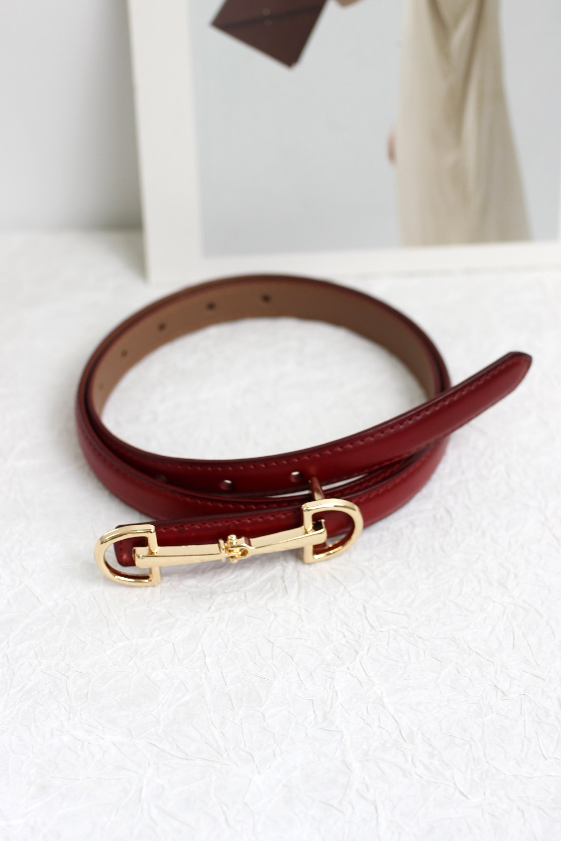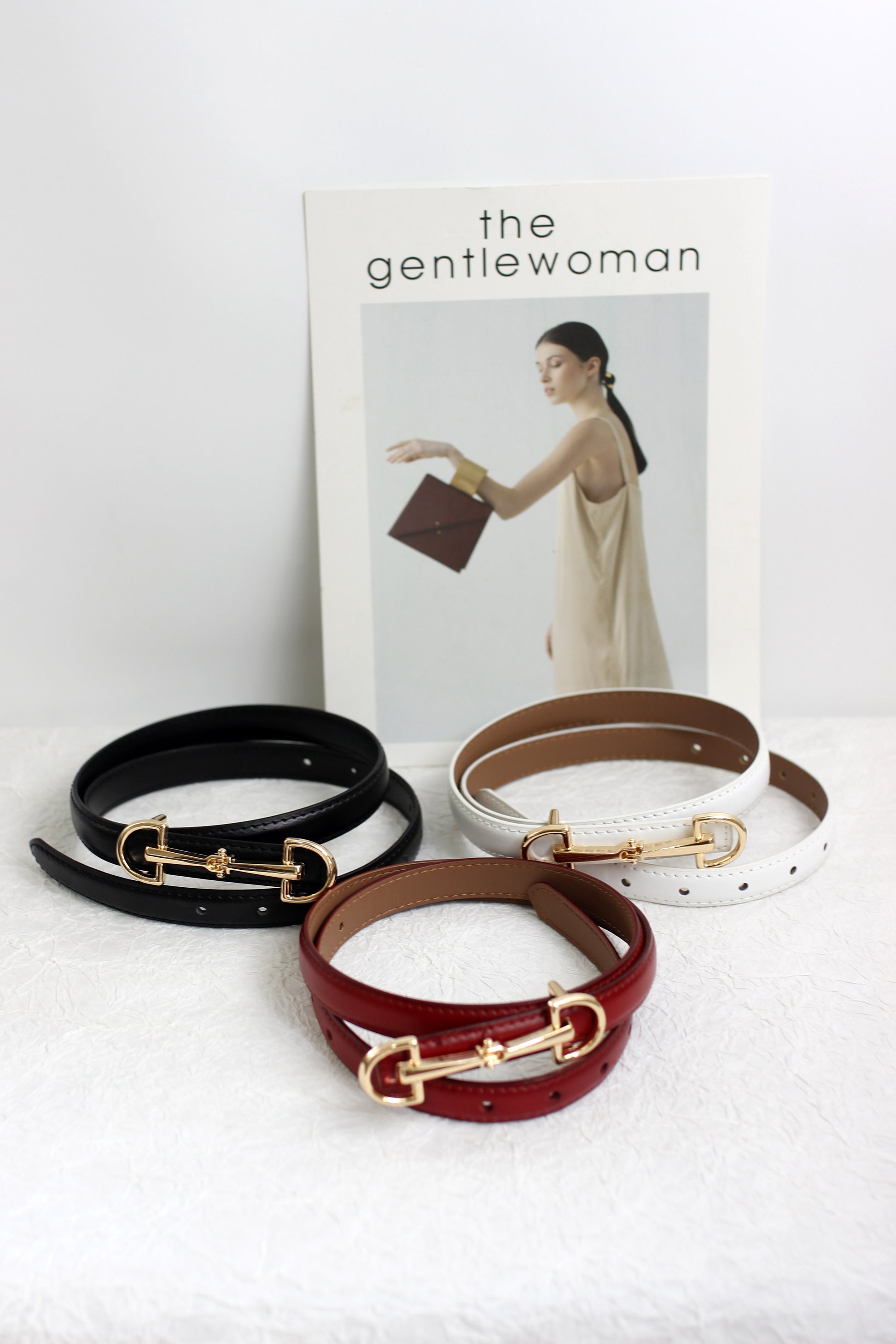 This slim leather belt features a sleek design, perfect for adding a sophisticated touch to any outfit. Crafted from premium leather, it showcases an equestrian-style buckle in a gold finish, offering a subtle yet elegant detail. The belt is versatile and available in black, brown, and white, making it an excellent choice for pairing with both casual and formal wear. The adjustable holes ensure a customized fit, while the durable metal buckle adds a polished finish. Ideal for complementing dresses, skirts, and trousers.