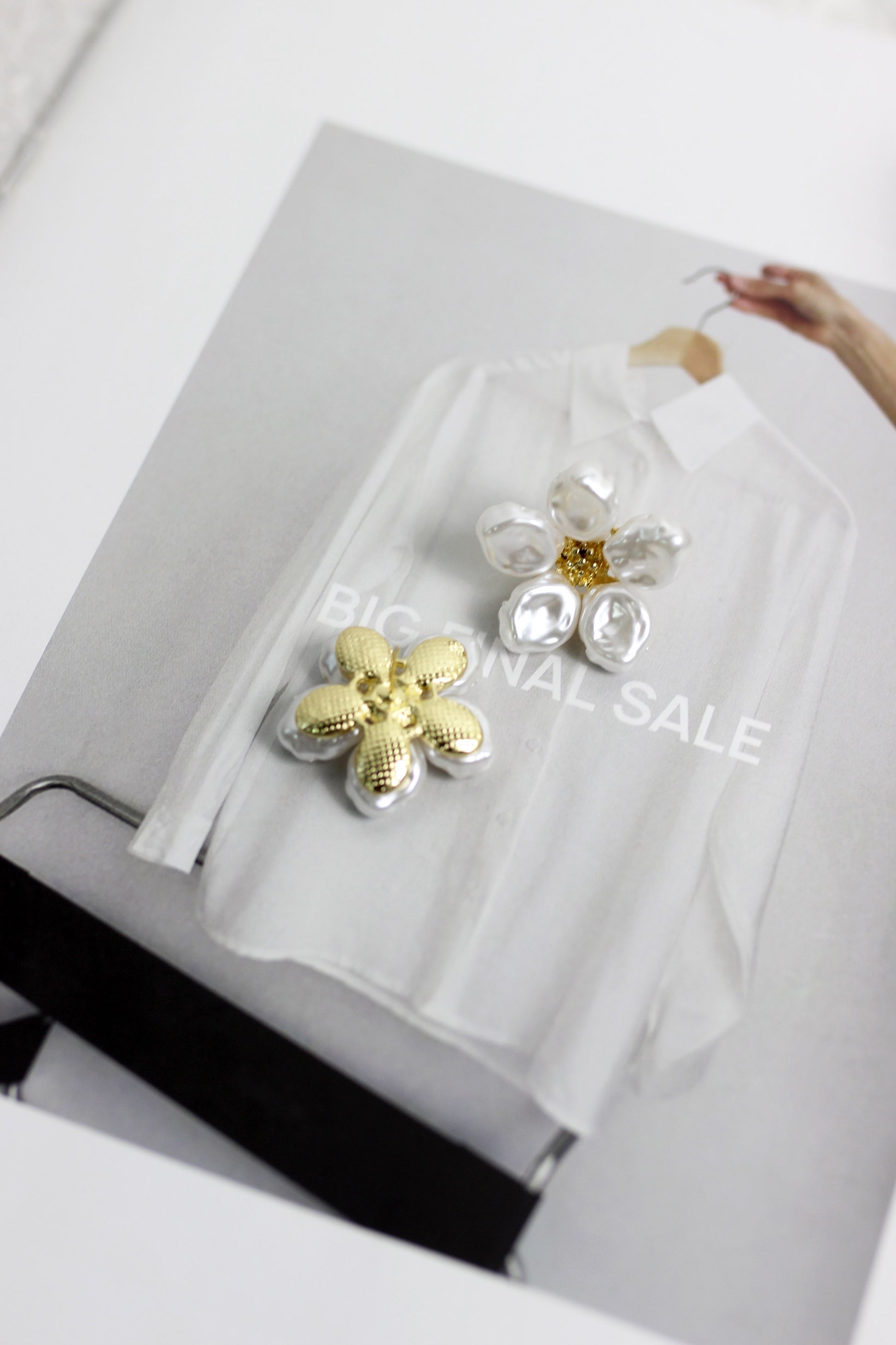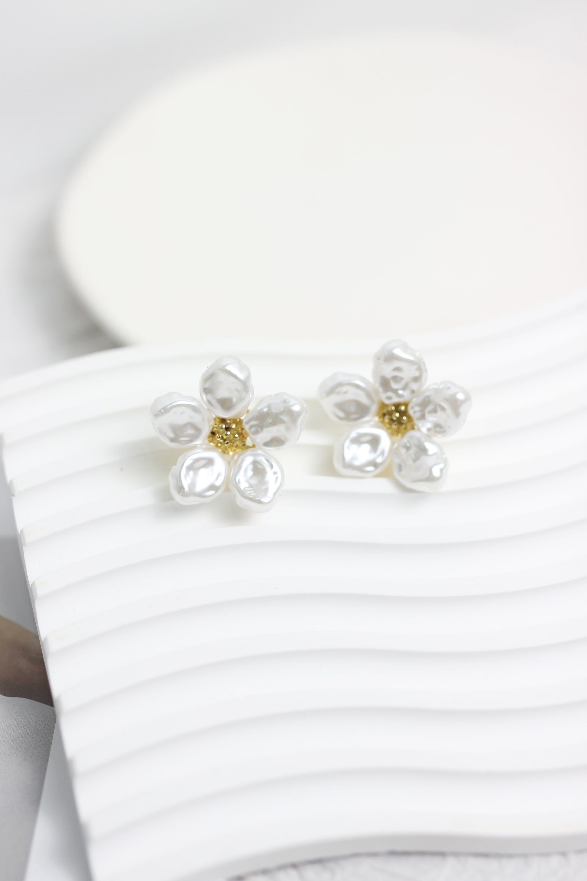 These earrings feature translucent floral motifs with a central golden detail that adds a luxurious touch. The design incorporates a modern twist on classic floral jewelry, offering a fresh and stylish accessory choice. These earrings are perfect for adding a subtle yet elegant statement to any outfit, ideal for both daywear and special evenings out. The combination of delicate floral shapes with metallic accents makes them versatile for pairing with a range of ensembles, enhancing the wearer's elegance with a contemporary flair.
