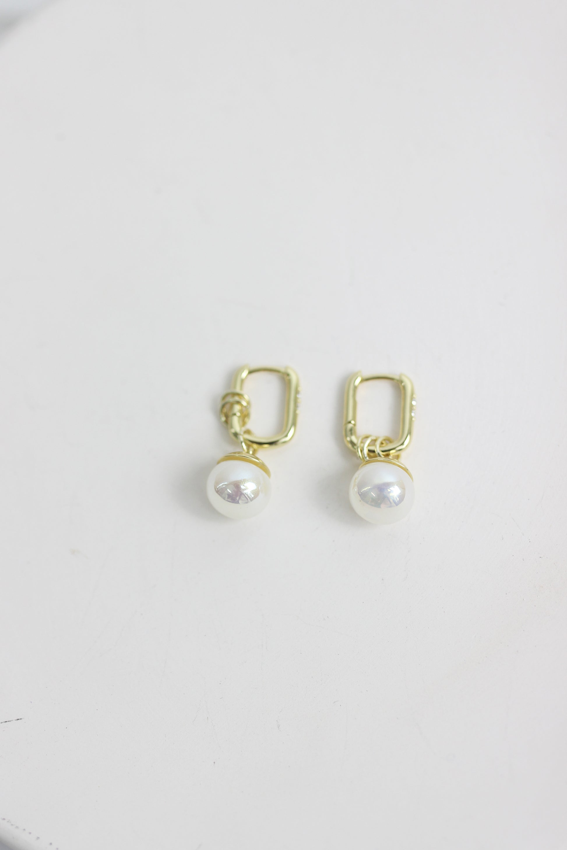 A pair of elegant gold hoop earrings adorned with a single pearl drop on each. The design features a small, rectangular-shaped hoop with a smooth gold finish, embellished with tiny sparkling stones, adding a touch of luxury. The pearl drop is attached to the hoop, giving the earrings a timeless and classic look.