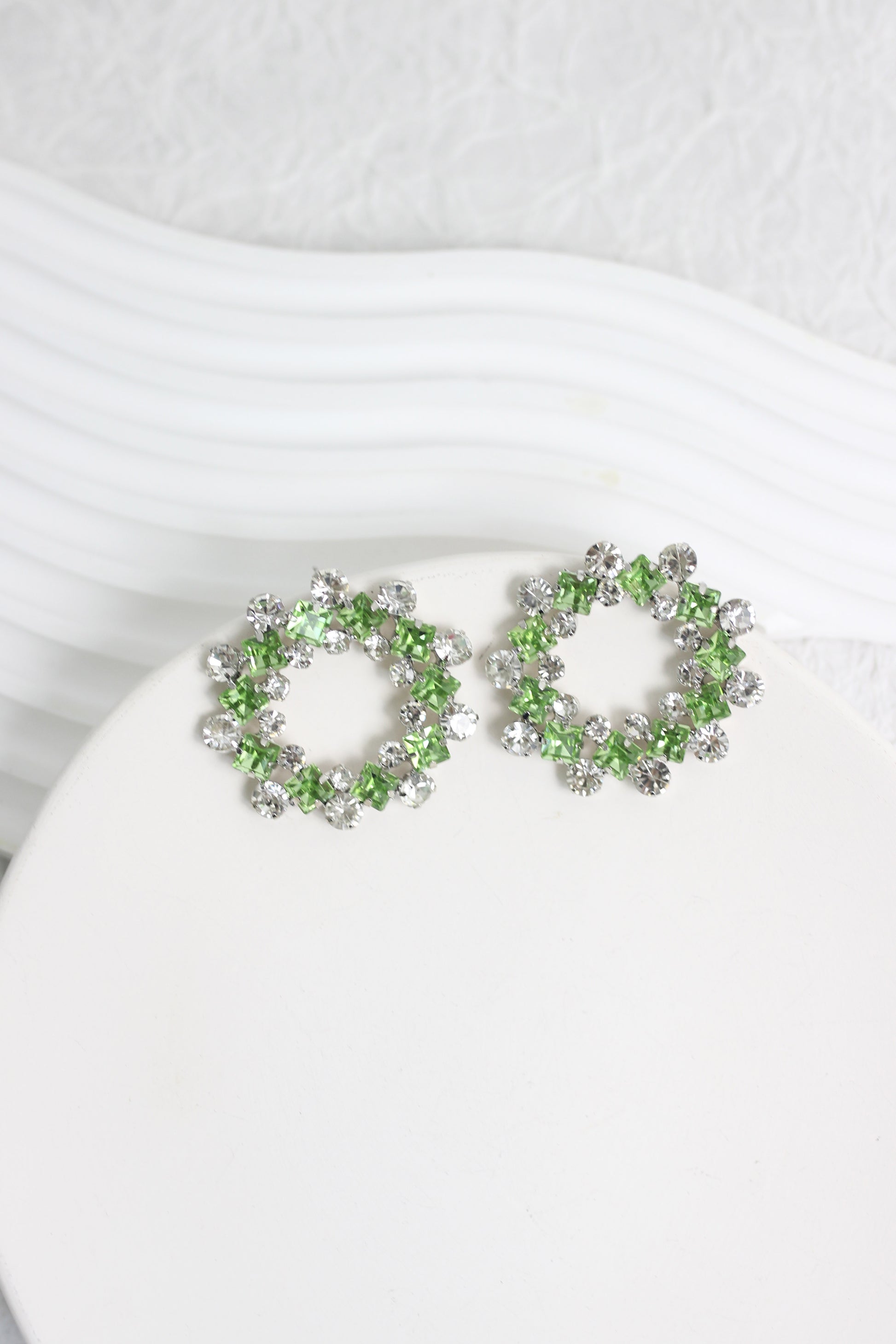 Festive wreath-shaped earrings, designed with dazzling stones that capture the holiday spirit. Each earring forms a complete circle of shimmering gemstones, adding a touch of elegance and sparkle to any holiday outfit. The intricate arrangement of gems resembles a delicate wreath, making them the perfect accessory for Christmas celebrations or seasonal gatherings. Key elements include wreath design, holiday jewelry, sparkling gemstones, and elegant festive accessories.