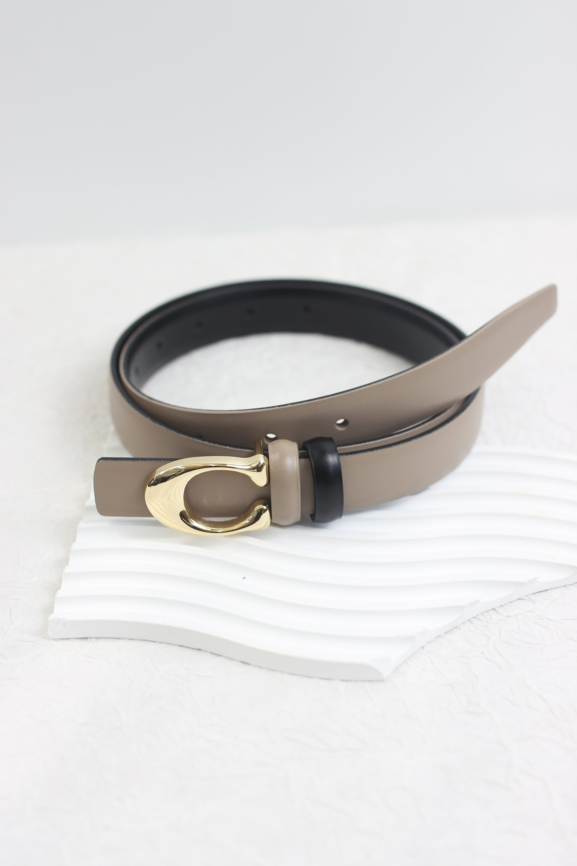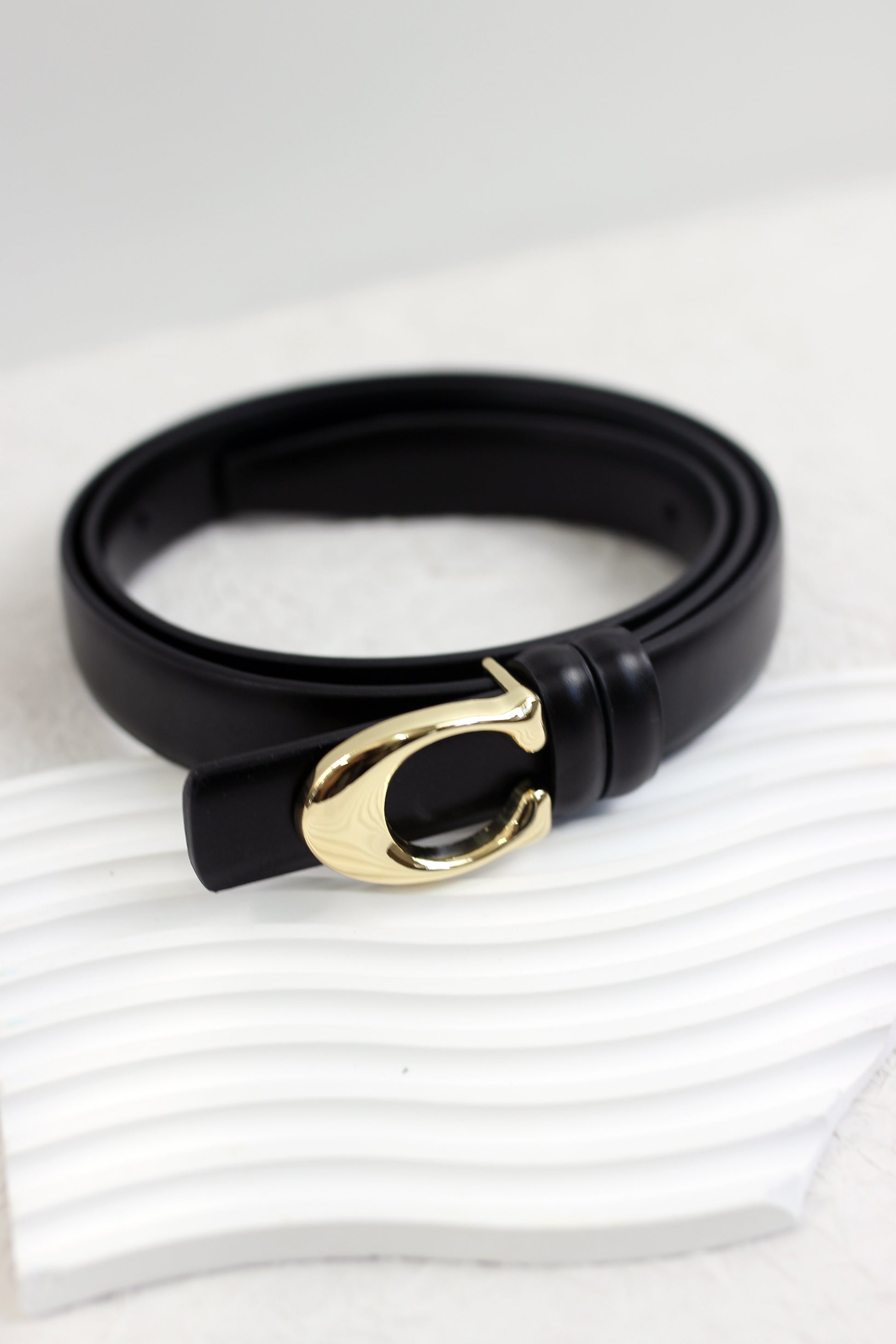 These stylish belts, available in classic black and versatile taupe, are crafted from premium leather, offering durability and a smooth finish. Each belt features a distinctive gold-tone buckle, designed in a sleek hook shape that adds a touch of modern elegance to the accessory. The belts are perfect for cinching at the waist of a dress or threading through the loops of your favorite jeans. Their simple yet chic design makes them a great addition to both casual and professional outfits.