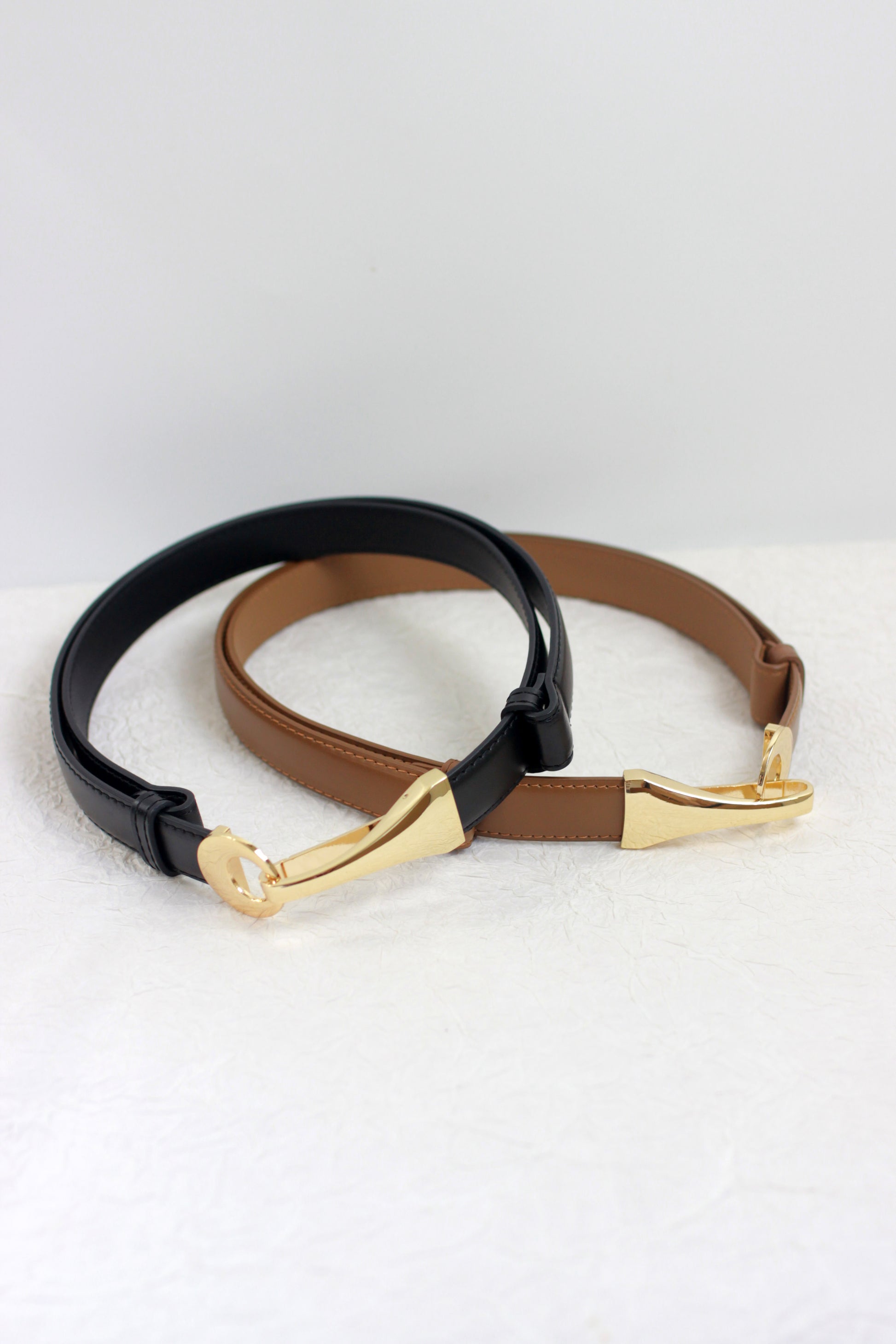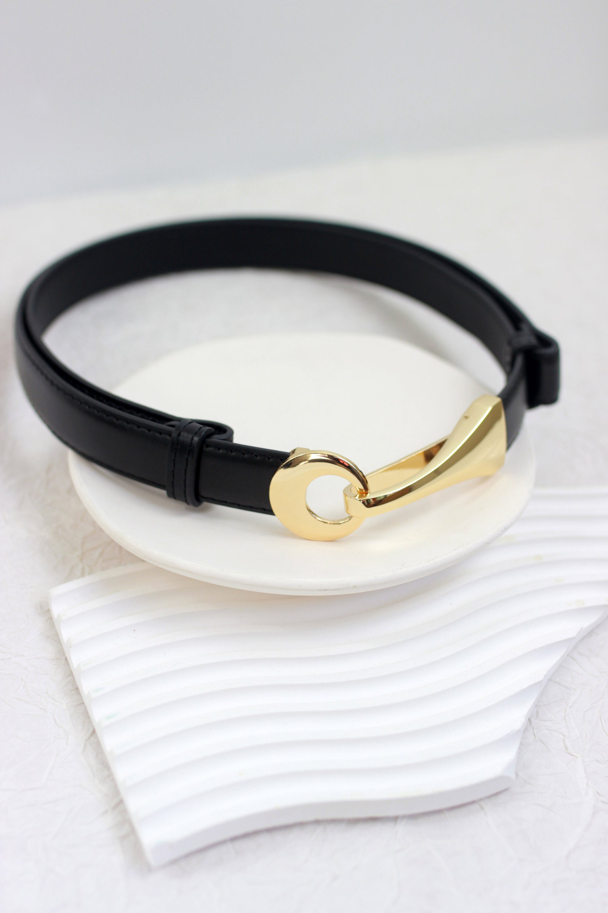 This elegant leather belt features a distinctive gold-tone buckle, adding a refined touch to any outfit. Made from high-quality leather, it offers durability and a comfortable fit, making it perfect for both casual and formal wear. The minimalist design and sleek buckle create a timeless look that complements various styles, whether paired with jeans or a suit. With its premium materials and classic appeal, this belt is a versatile wardrobe essential for elevating any ensemble.