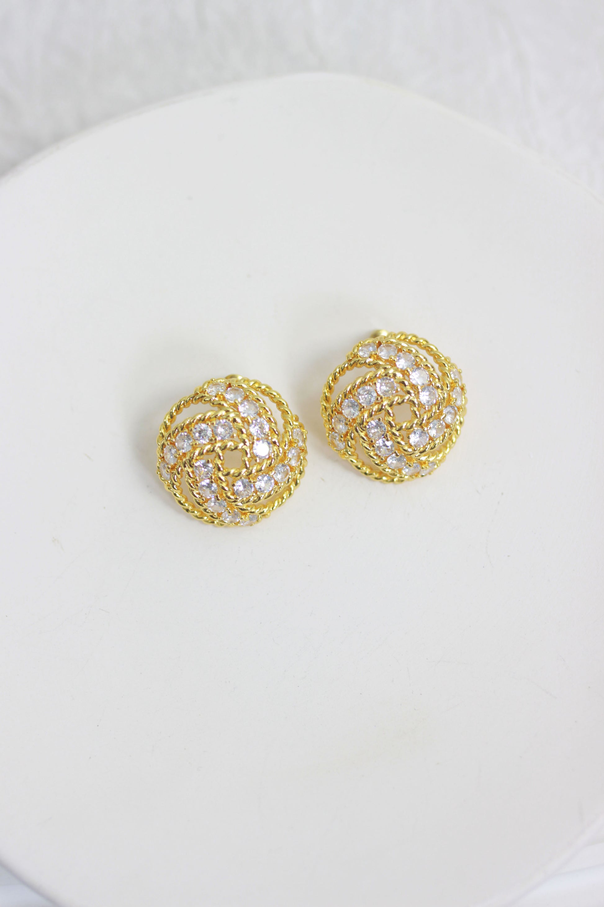 These exquisite earrings feature a stunning design of braided gold strands interwoven with sparkling crystals, forming a knot-like appearance that exudes elegance and sophistication. The gold finish provides a warm, luxurious base that enhances the brilliance of the embedded crystals, making these earrings a perfect choice for formal events and special occasions. The intricate craftsmanship and radiant shine ensure these earrings catch the eye and add a glamorous touch to any ensemble.