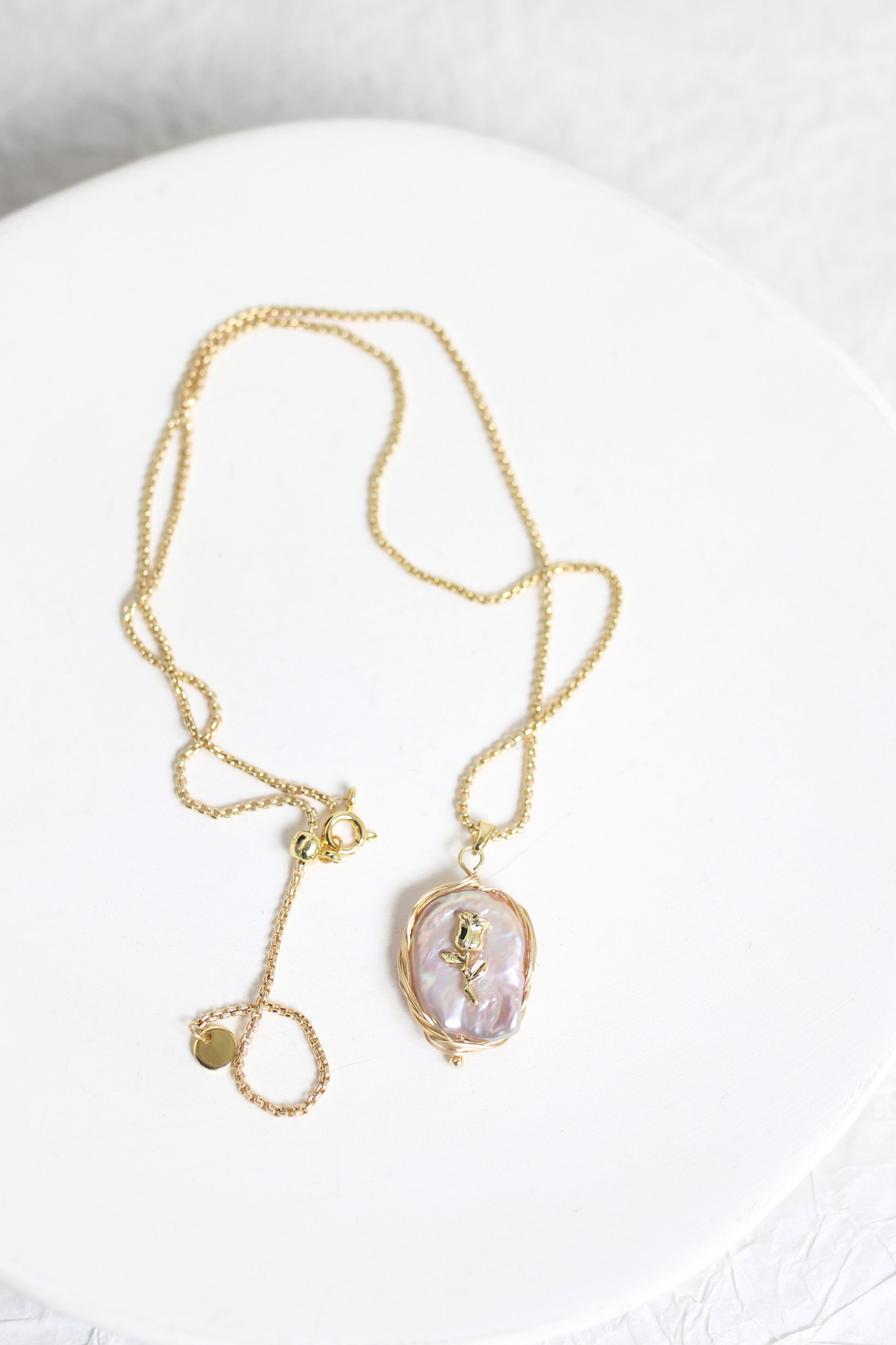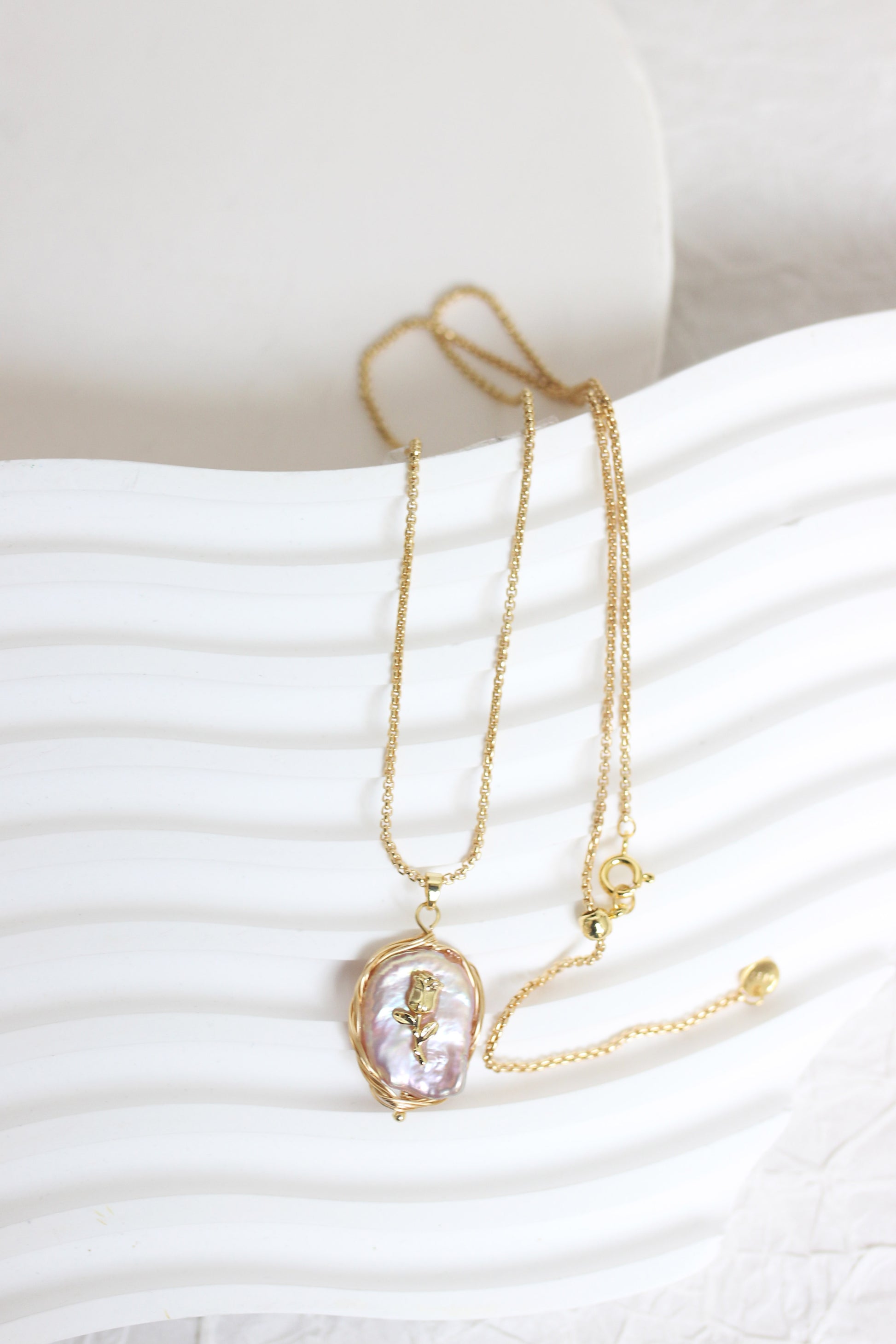 This handcrafted pendant necklace features a natural freshwater pearl set in a delicate copper frame with a gold-plated finish. The pendant is beautifully adorned with a rose flower detail, adding a touch of elegance and femininity. Designed with a durable and adjustable chain, this necklace is perfect for daily wear, special occasions, and gifting. The lightweight yet luxurious design makes it a timeless accessory for any jewelry collection.