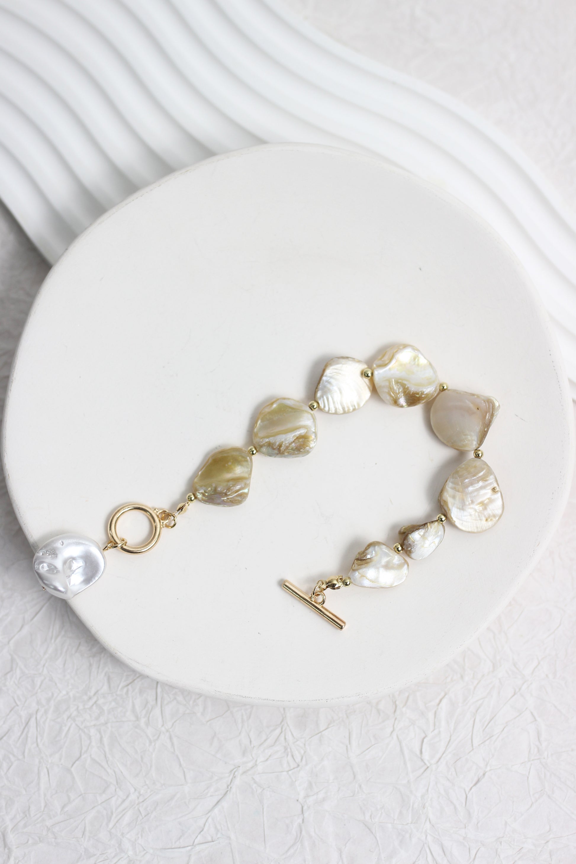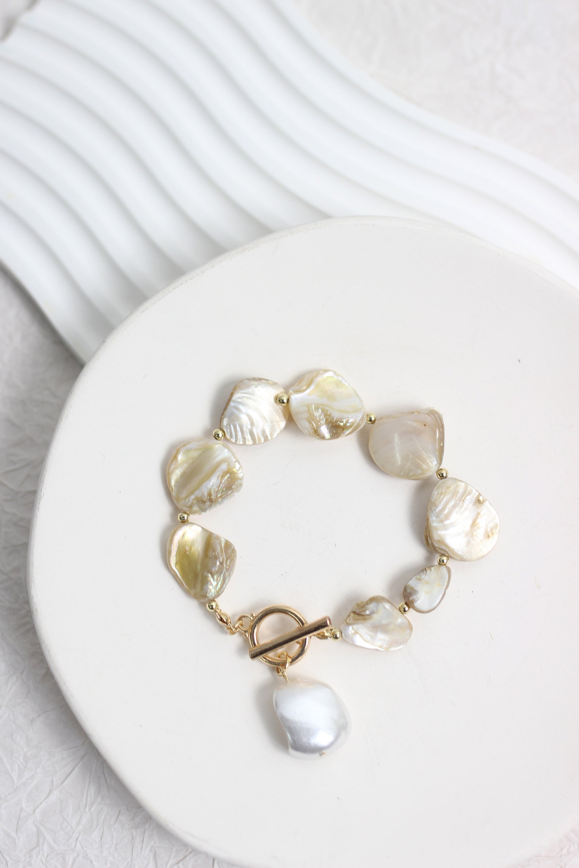 This natural shell bracelet is a stylish and versatile accessory that will add a touch of elegance to any outfit. The gold hardware with pearl toggle clasp closure.