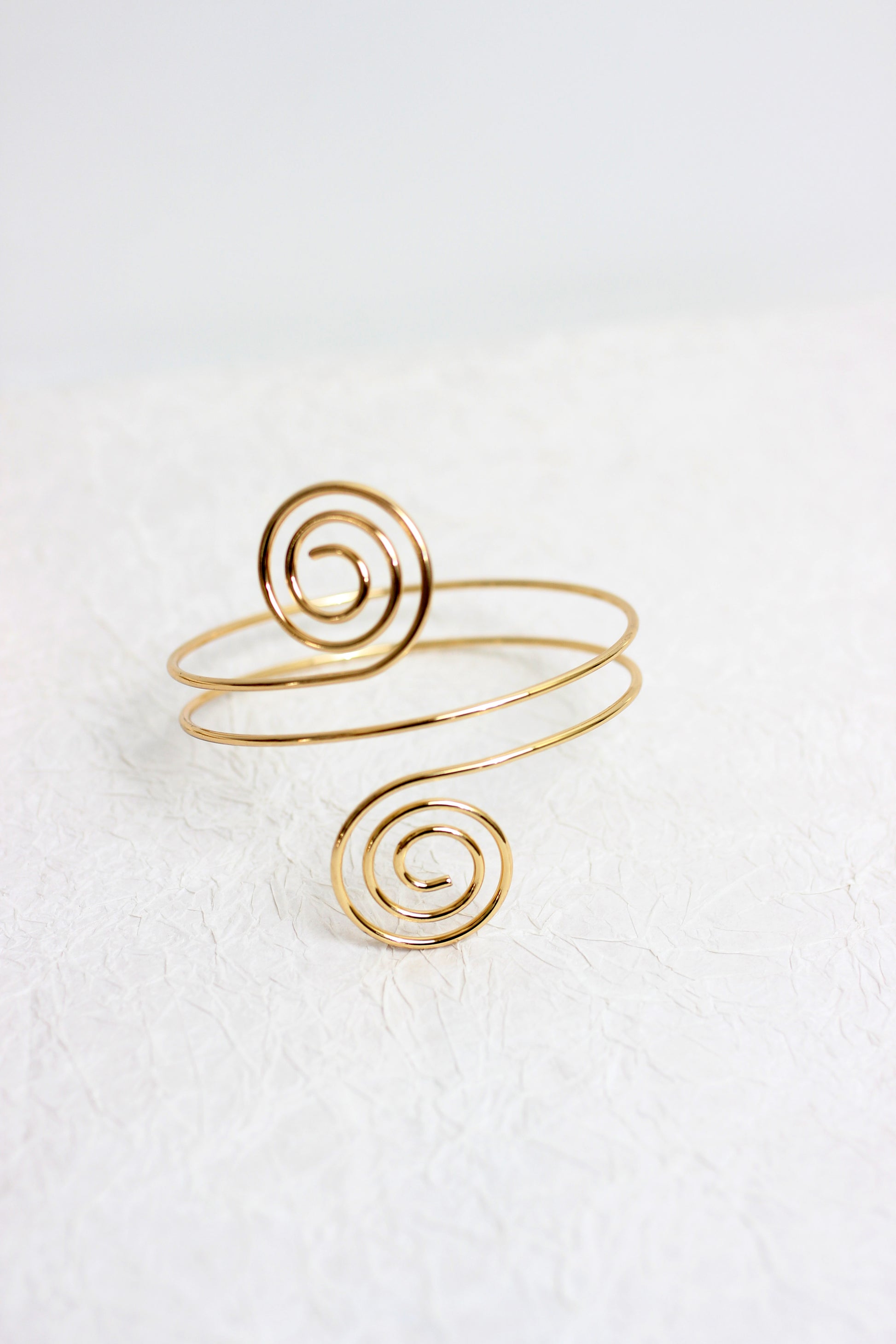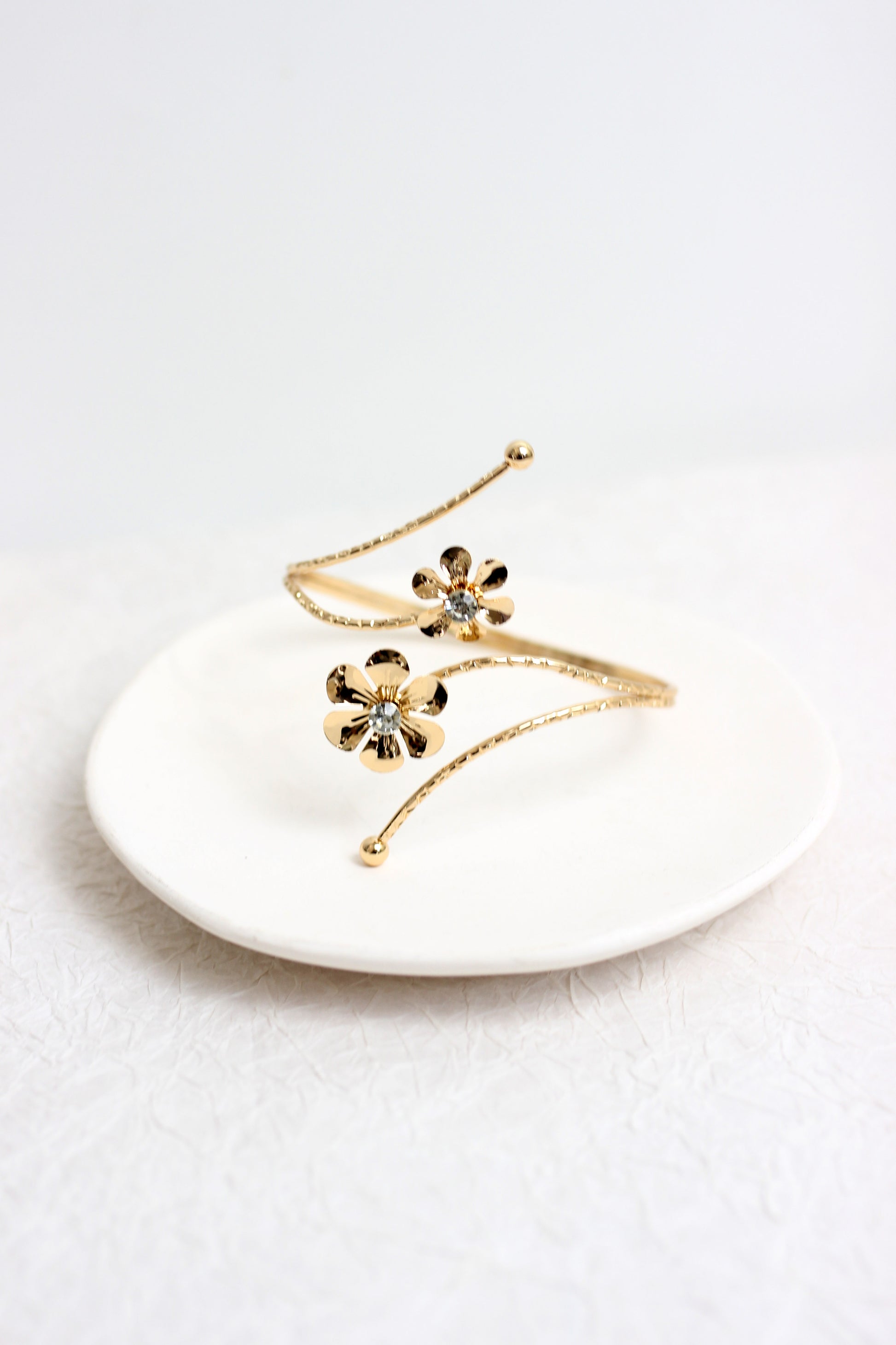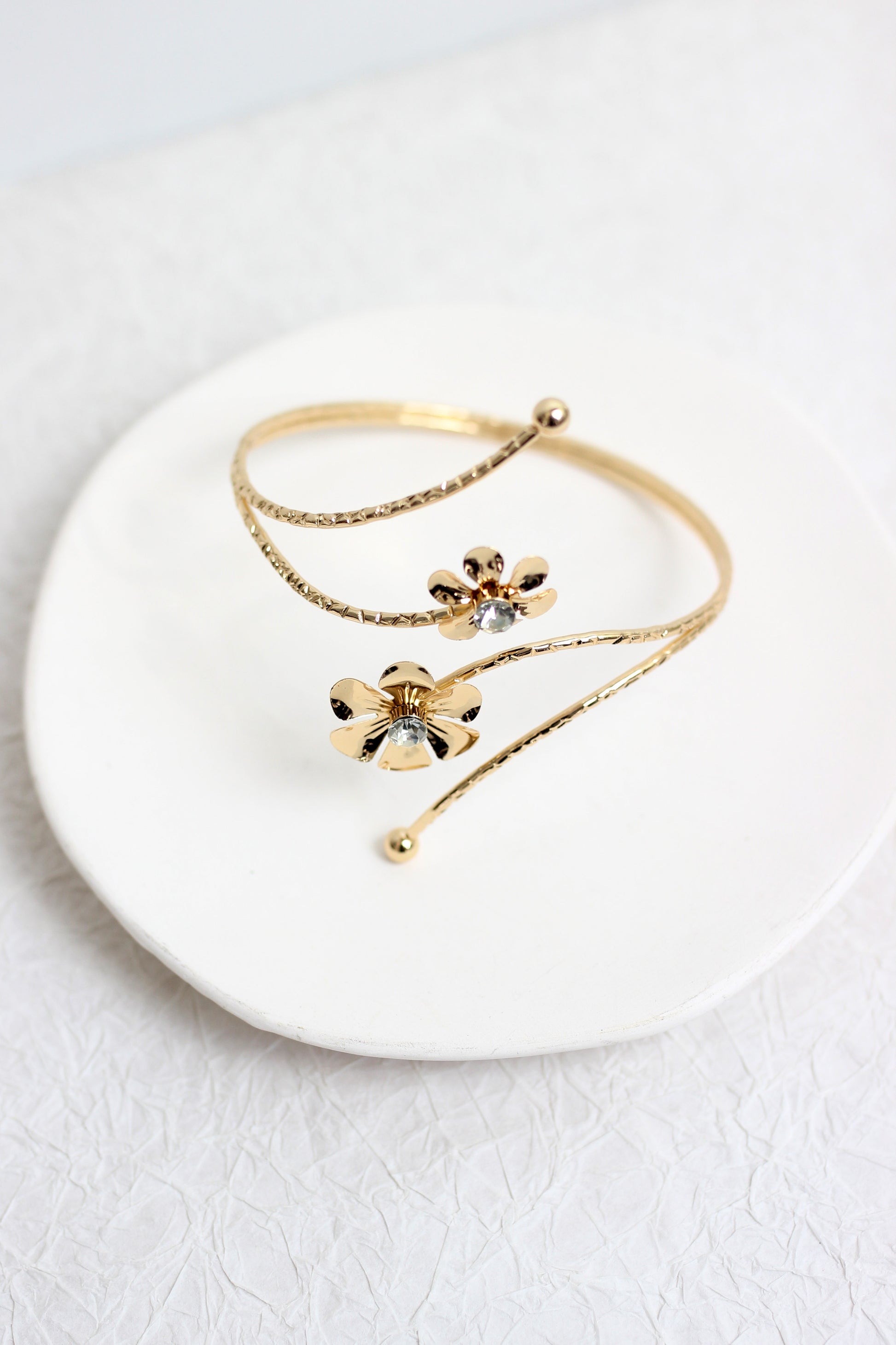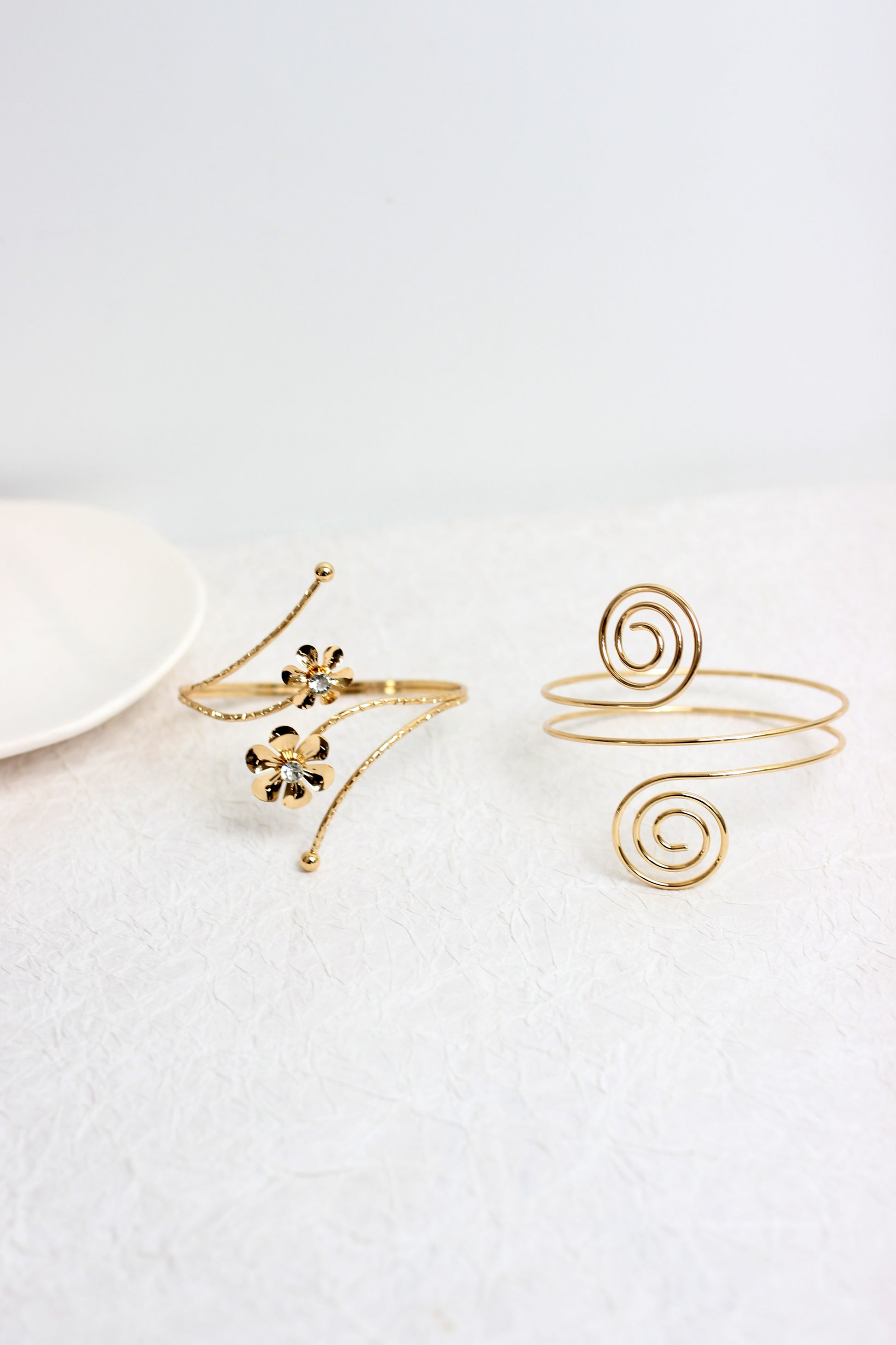 A stylish gold-tone bracelet set featuring two unique cuff designs. One bracelet showcases a minimalist spiral wrap, adding a modern and elegant touch, while the other features a floral motif with crystal accents, offering a delicate and feminine look. Crafted with a lightweight open cuff design, these bracelets provide an adjustable fit for all wrist sizes. Perfect for casual wear, evening occasions, or layering with other accessories, this versatile jewelry set adds a statement touch to any outfit.