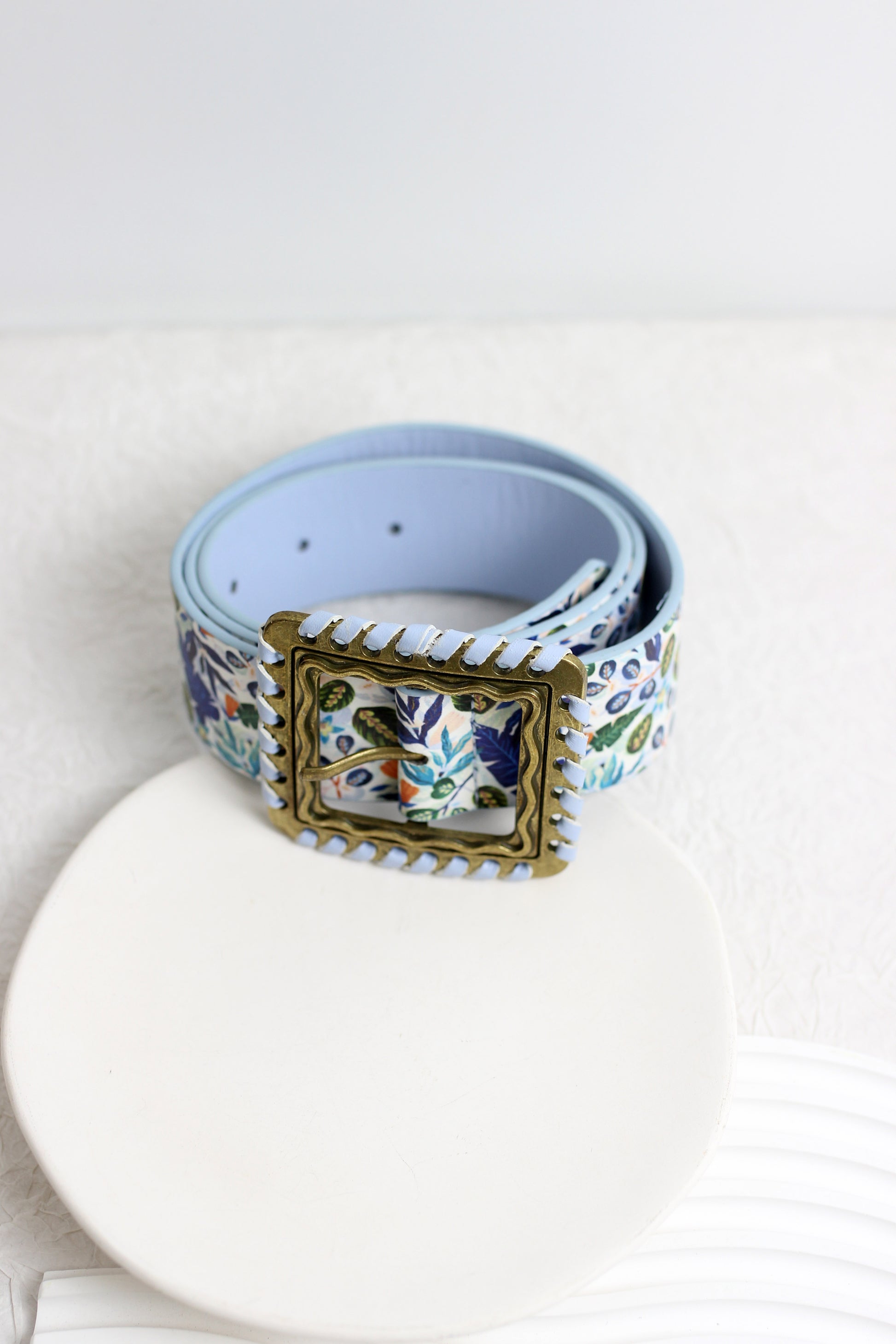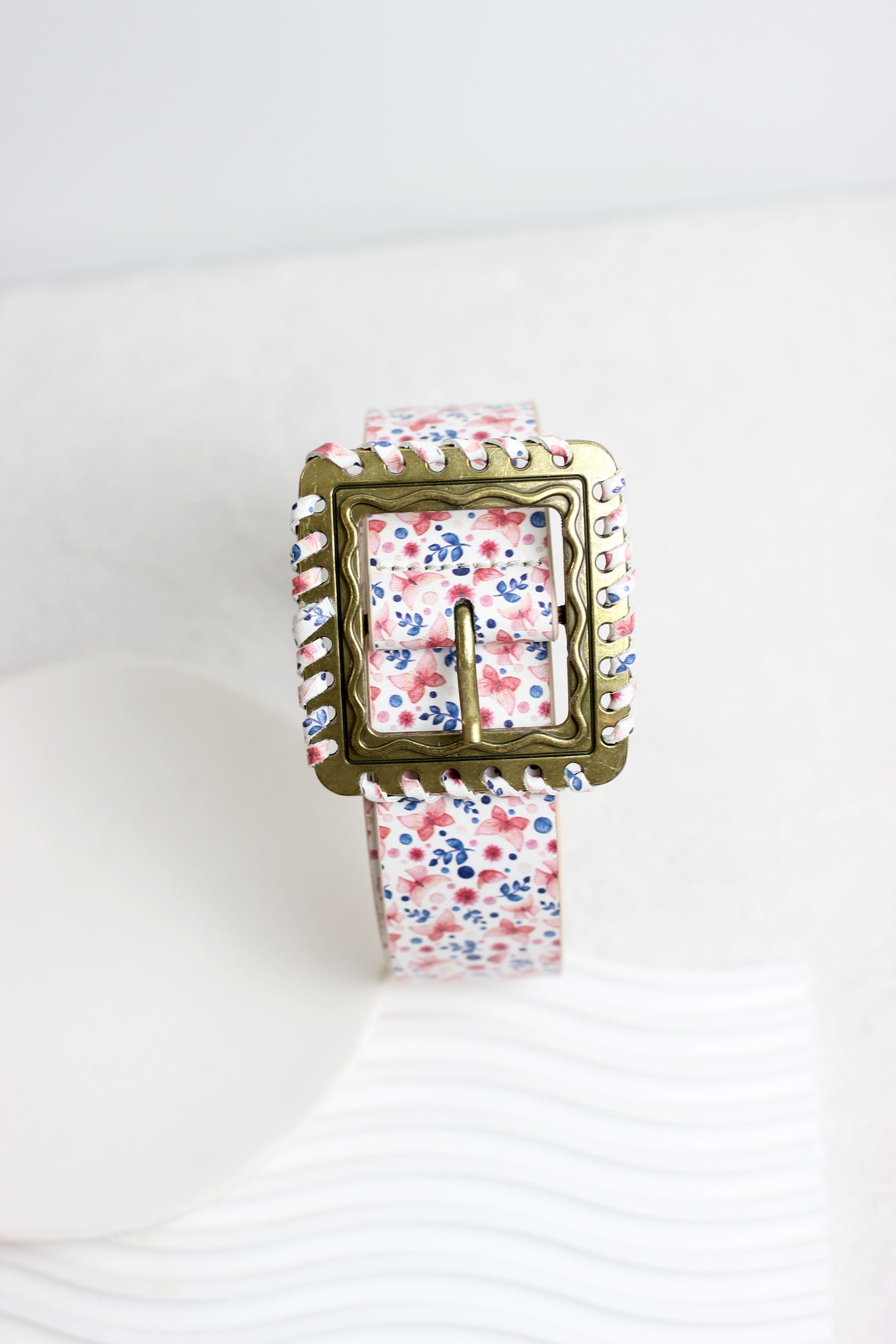 A stylish vintage-inspired wide belt, featuring a floral print design and an antique bronze square buckle with woven detailing for a unique bohemian look. Made from durable faux leather, this belt offers a soft and comfortable fit, perfect for casual outfits, dresses, jeans, and skirts. The adjustable length ensures a customizable fit, making it a versatile accessory for any wardrobe. Available in pastel shades with delicate floral patterns, this statement belt adds a touch of elegance and charm to any ensemble.