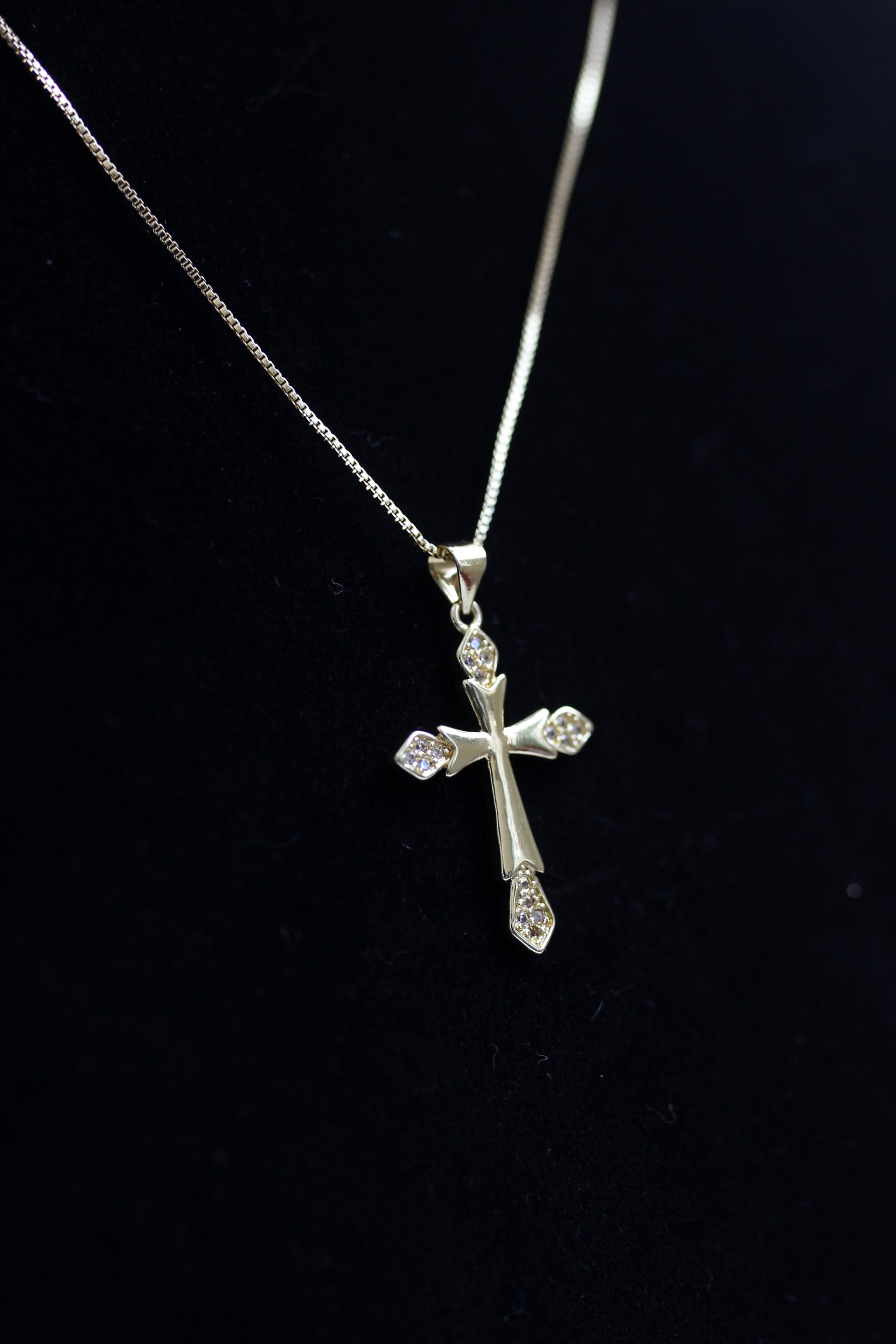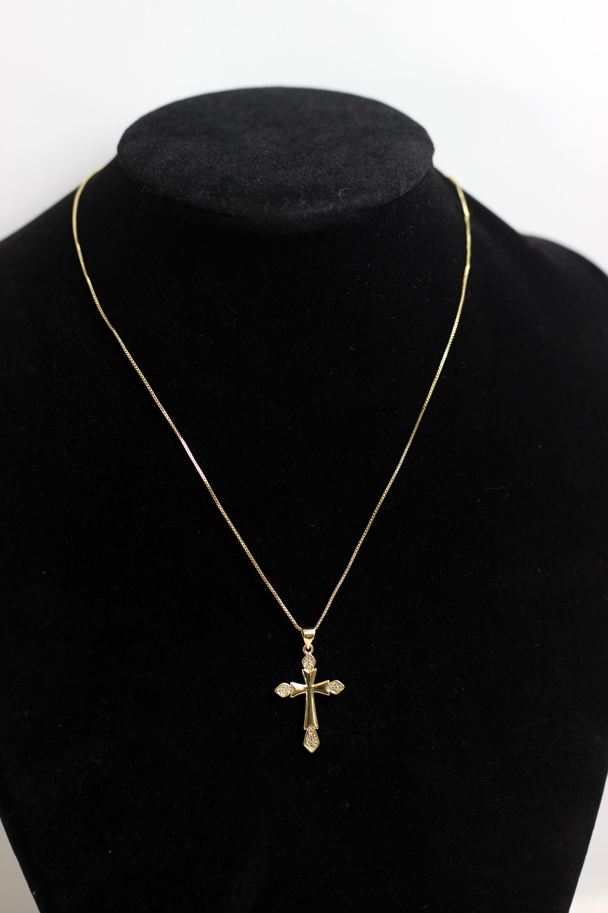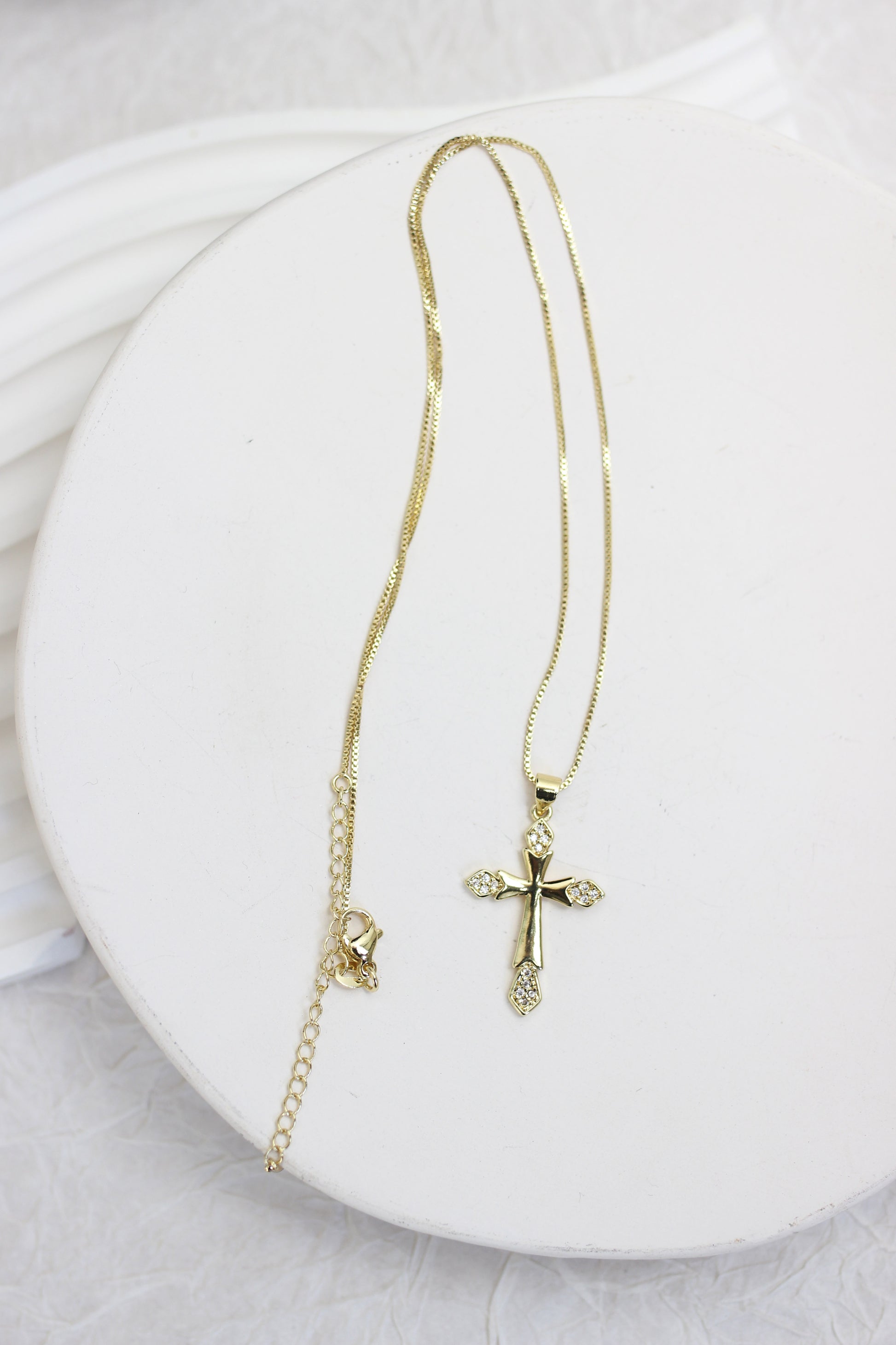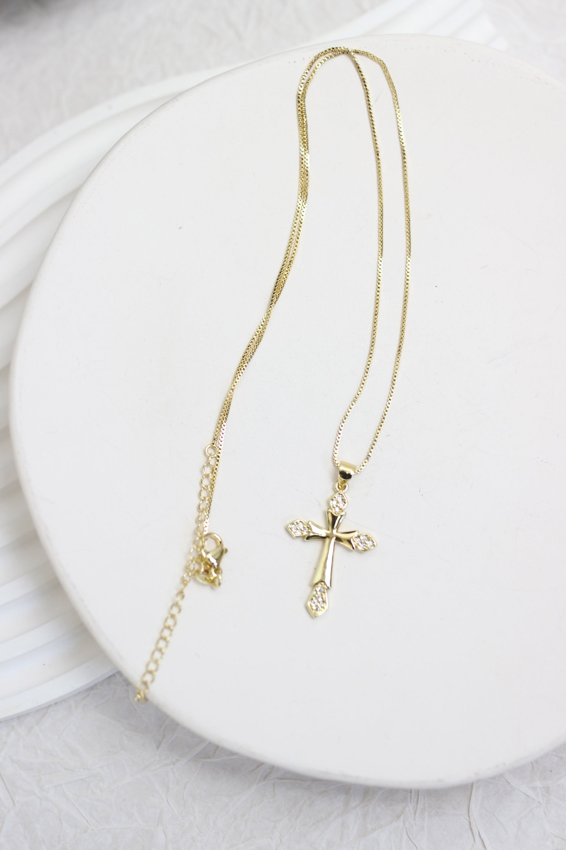 This gold-plated cross pendant necklace is a timeless and elegant accessory designed for both men and women. Featuring a delicate box chain with an adjustable length, this Christian religious jewelry piece is adorned with sparkling rhinestones at the four ends of the cross, adding a touch of sophistication. Made from high-quality alloy with gold plating, this faith-inspired pendant necklace is lightweight, durable, and perfect for daily wear or special occasions.