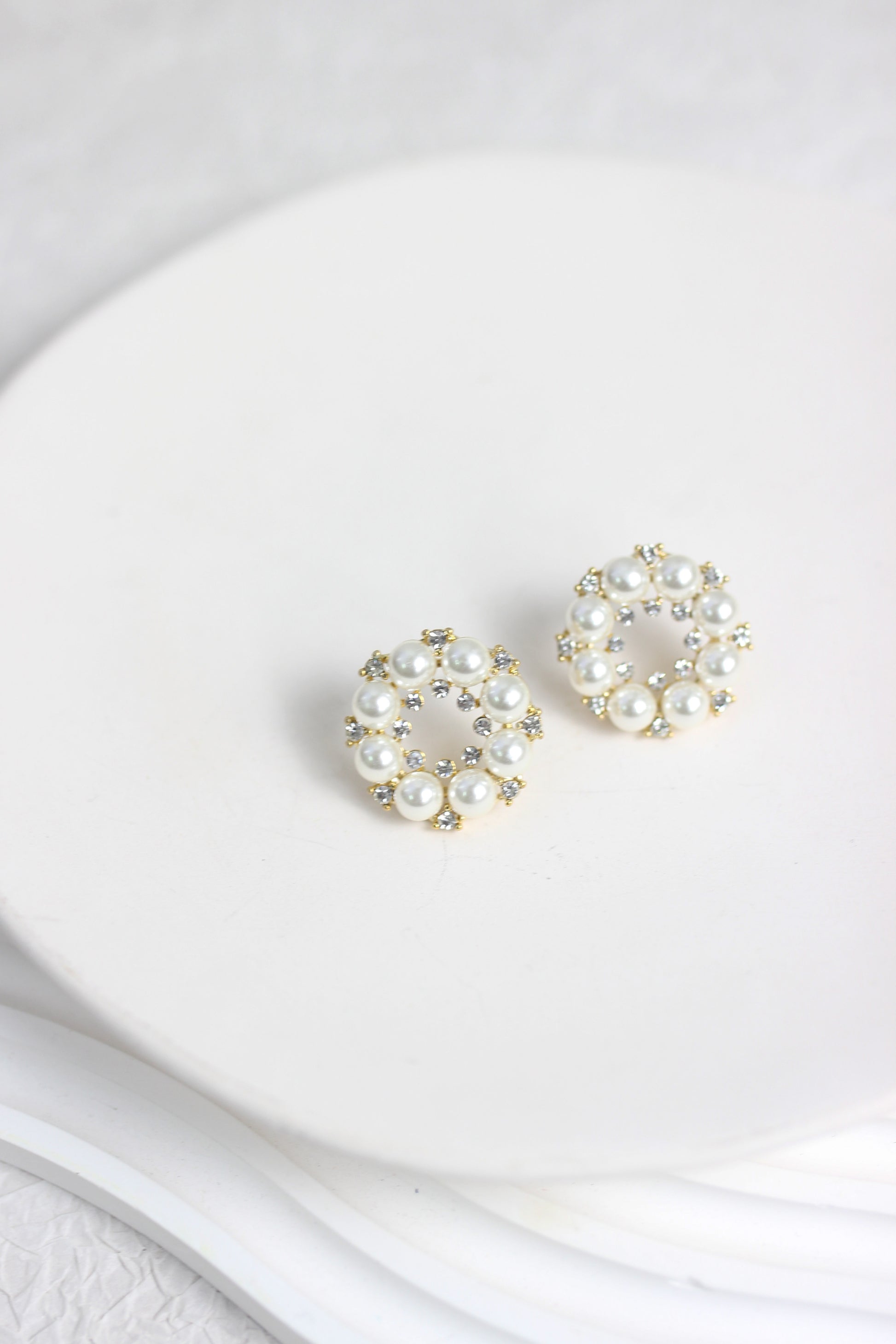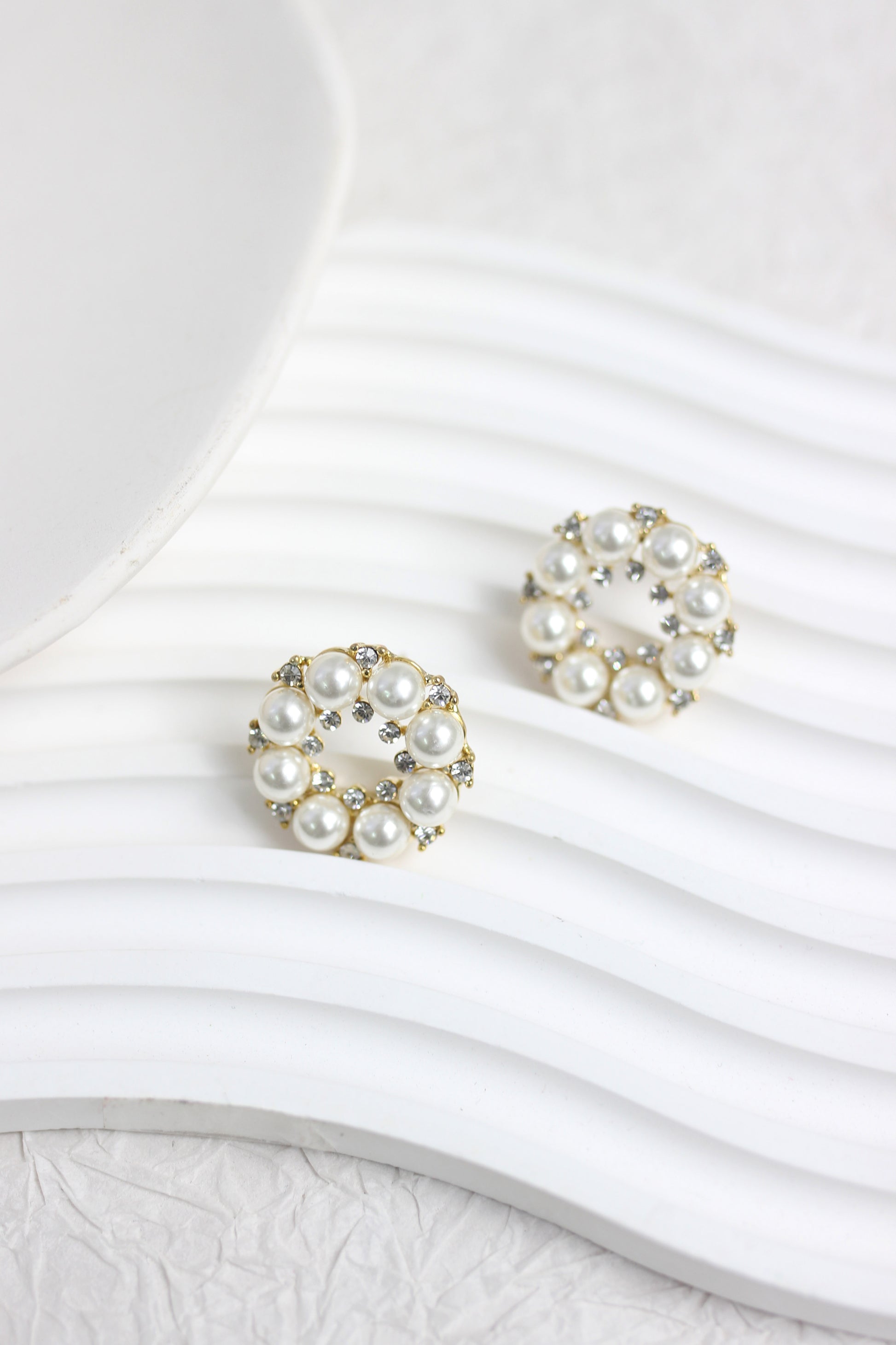 These chic pearl and rhinestone earrings feature a classic round design with faux pearls and sparkling rhinestones set in a gold-tone finish. Perfect for formal occasions, weddings, parties, and everyday elegance. Lightweight and stylish, these vintage-inspired stud earrings add a touch of glamour to any outfit.