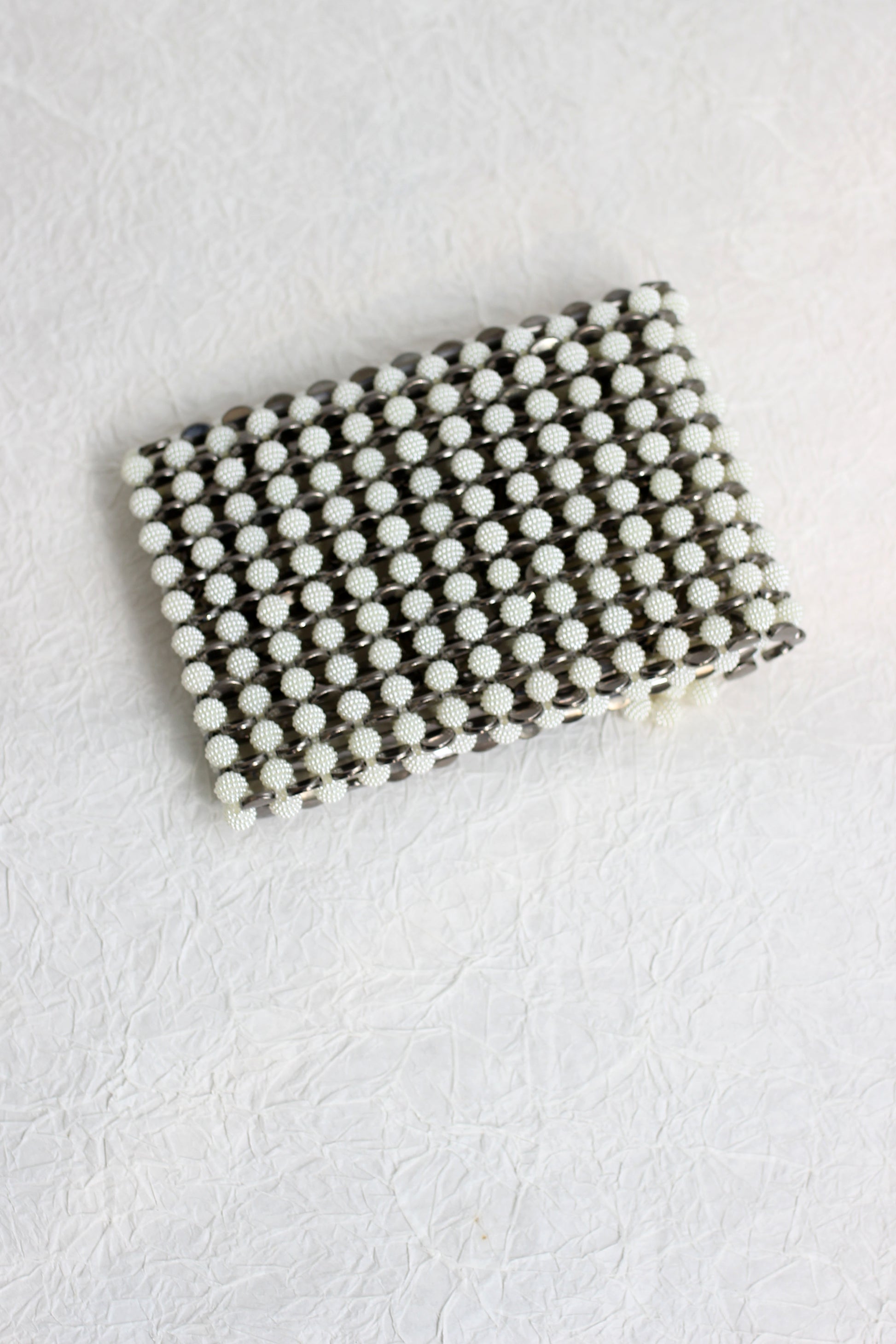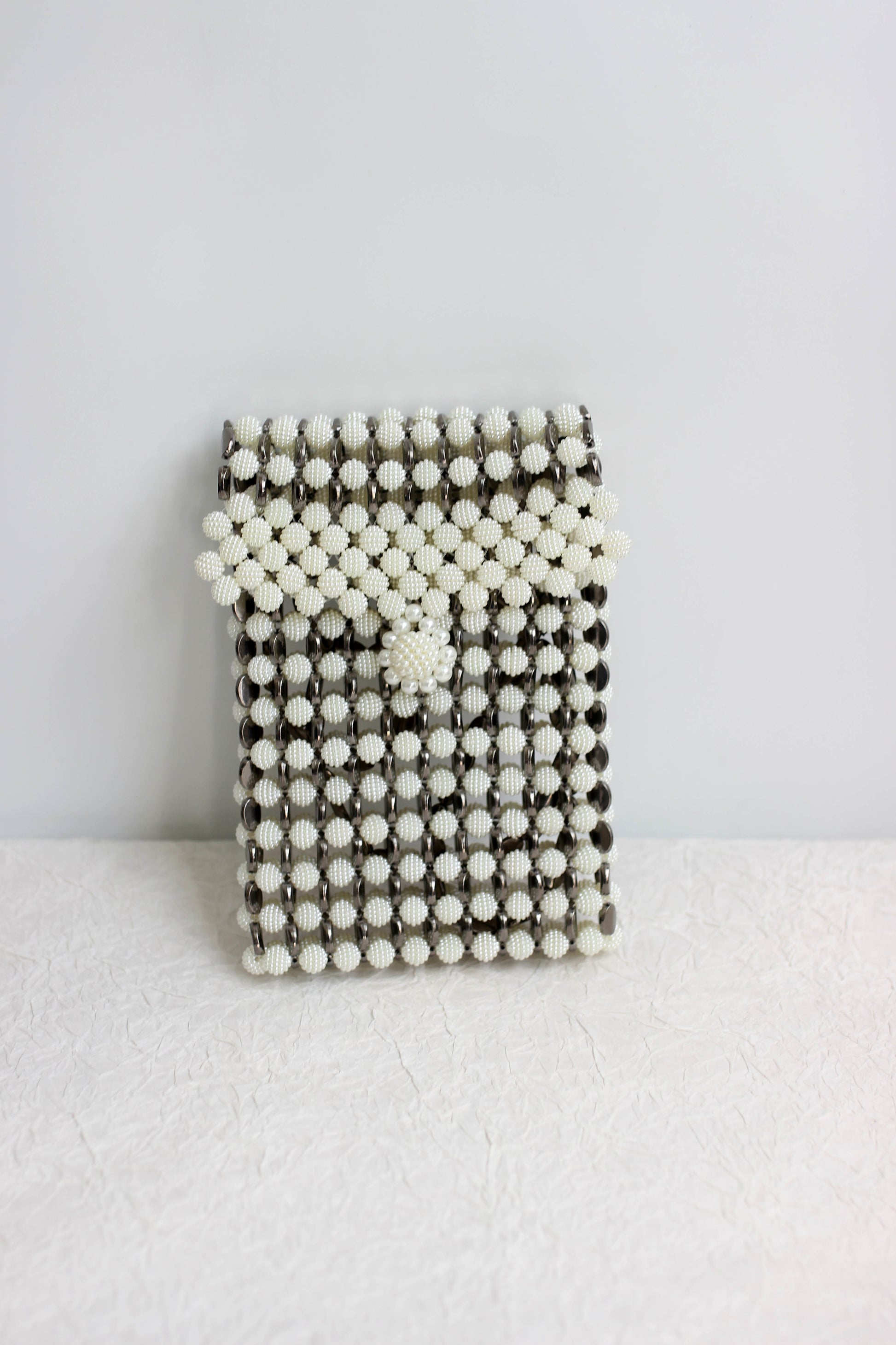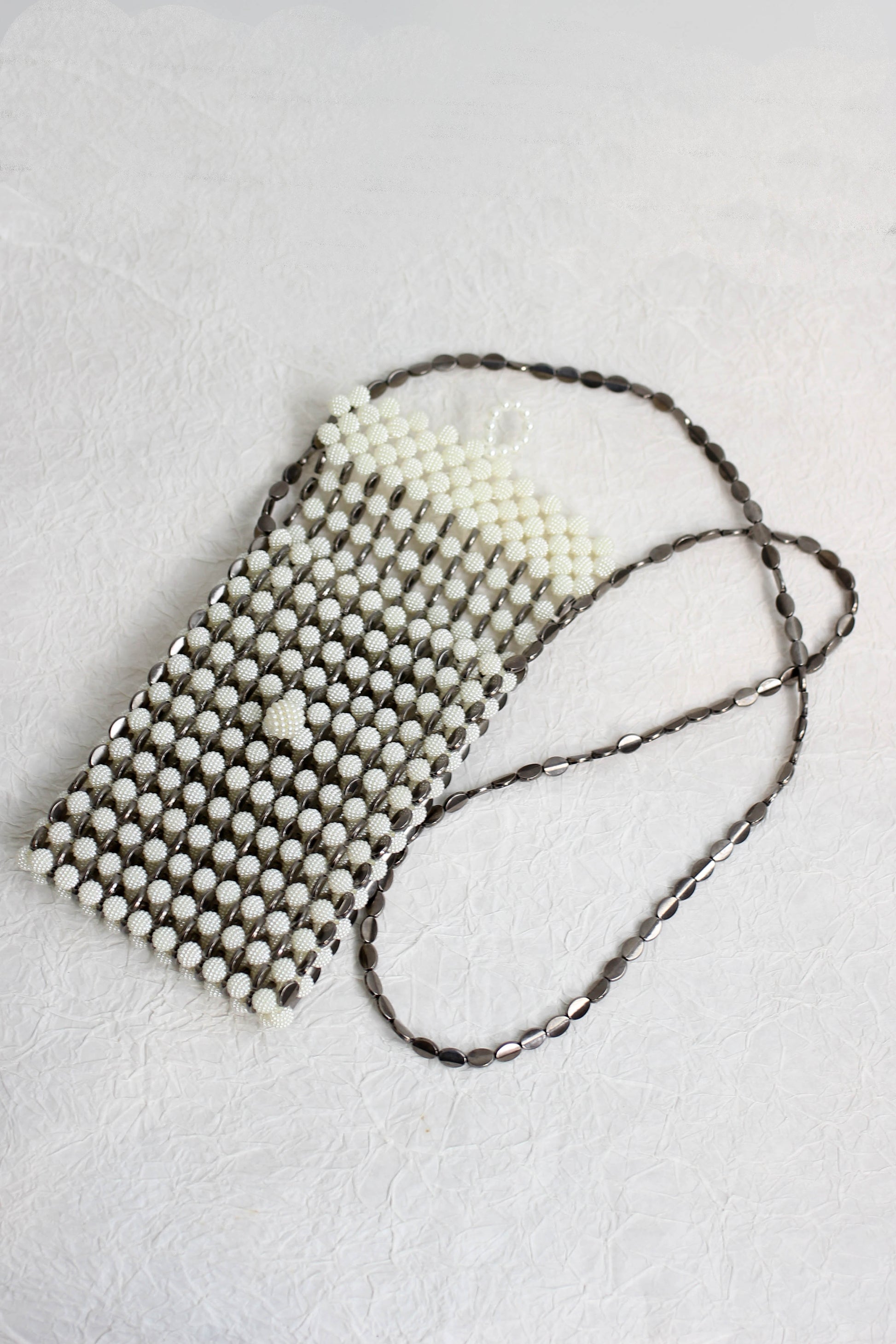 This stylish handmade beaded bag is designed with a bohemian aesthetic, featuring a pearl bead flap closure and a metallic beaded body. The woven pattern combines white pearl beads with gunmetal black beads, creating a vintage yet elegant appeal. The bag comes with a long beaded shoulder strap, making it perfect for crossbody wear. Its small yet functional size is ideal for carrying essentials like a phone, keys, and cards, making it a great choice for evening parties, casual outings, and chic fashion statements.