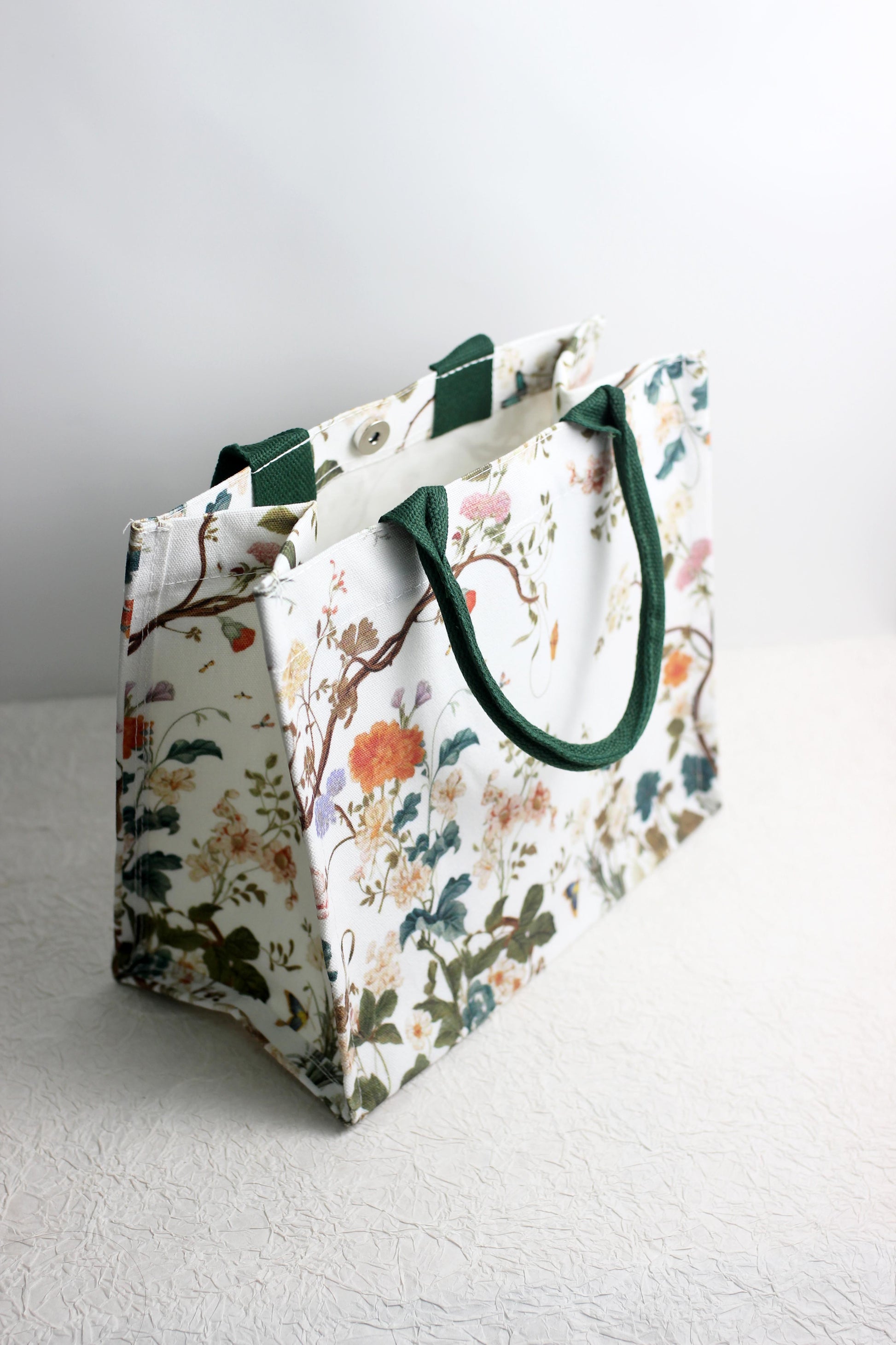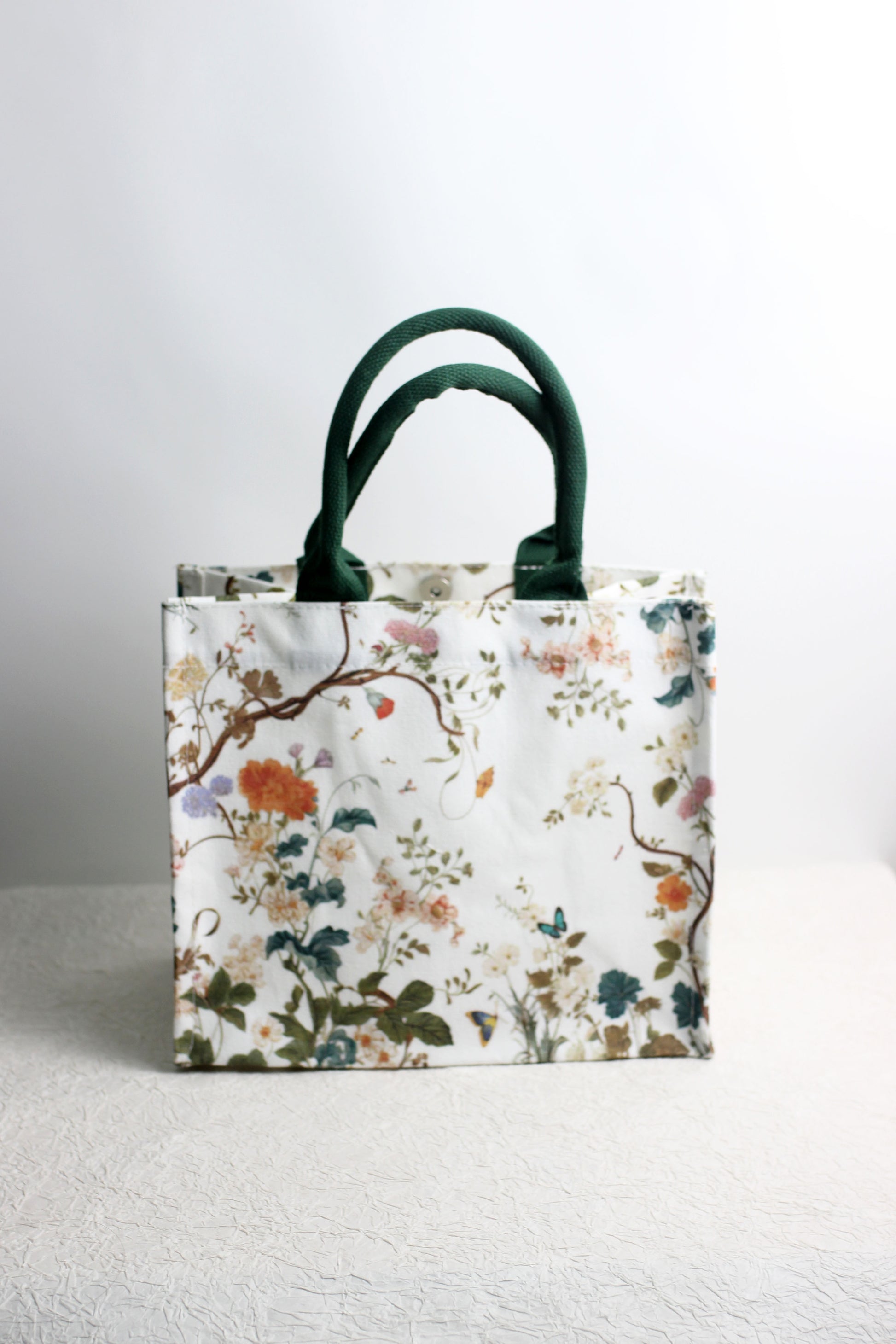 This floral polyester canvas tote bag is both stylish and practical, featuring a botanical print of blooming flowers and leafy vines on a durable white canvas background. The deep green woven handles provide a pop of contrast and ensure a sturdy grip for everyday use. Perfect for shopping, casual outings, or as an eco-friendly reusable bag.
