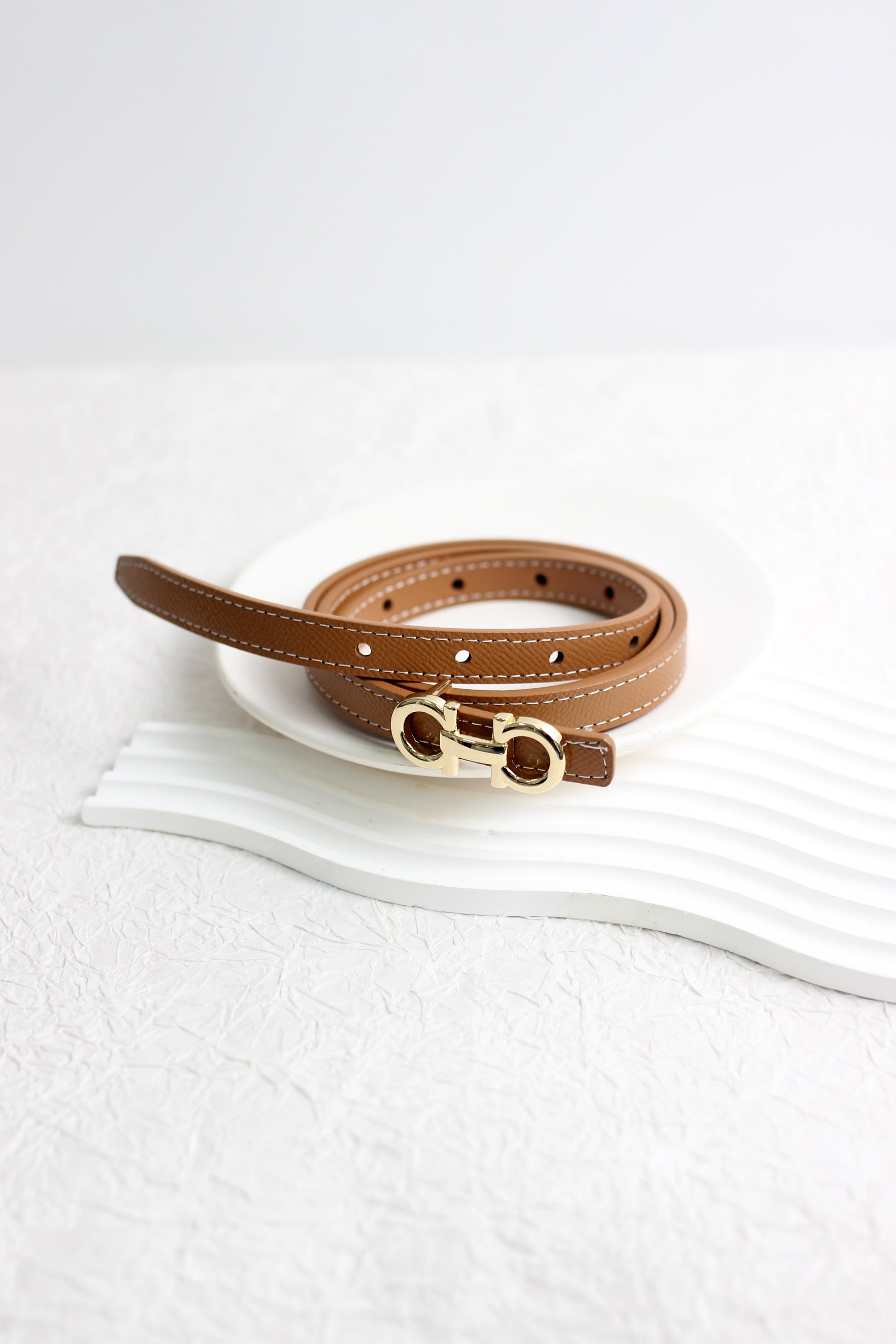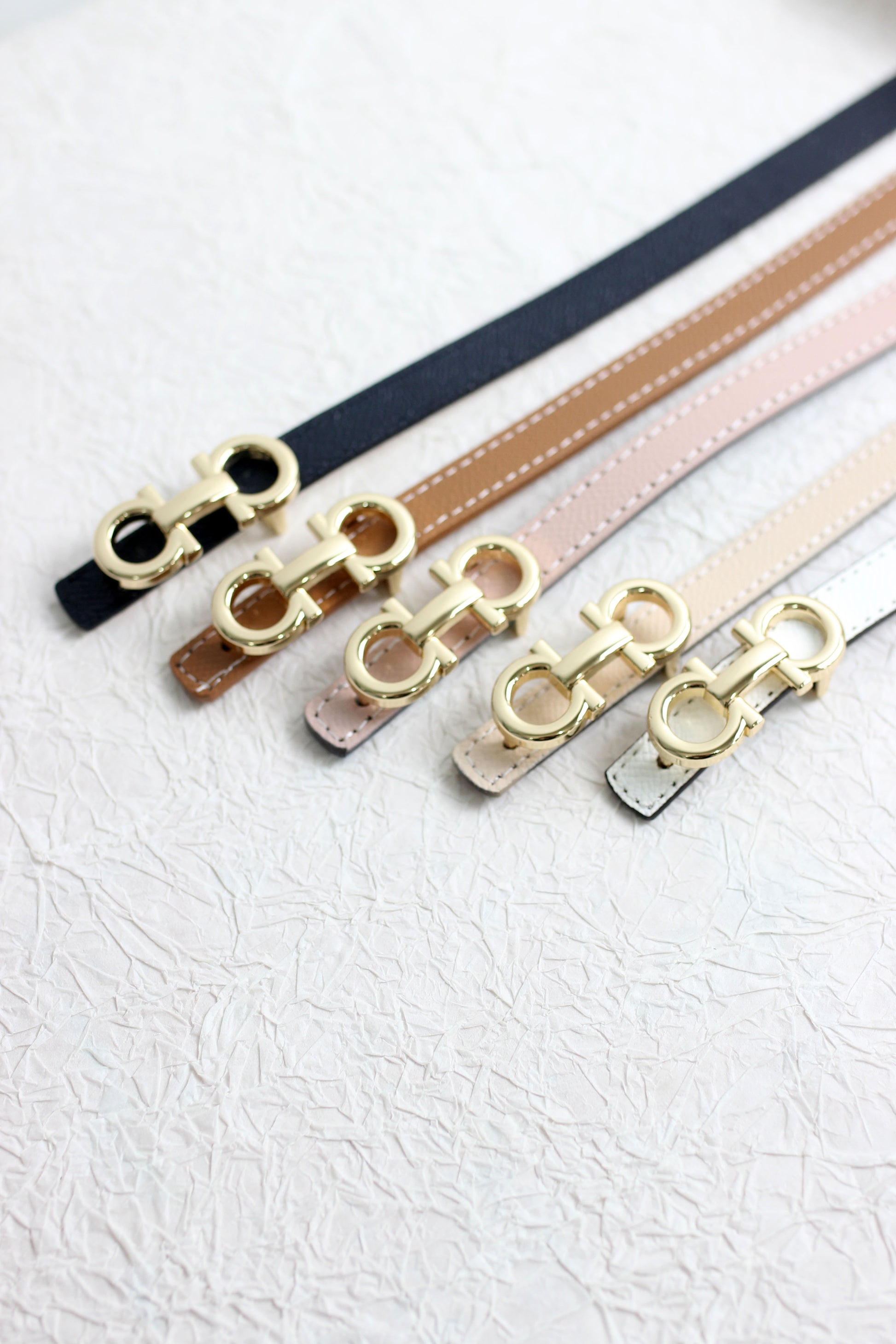 This slim leather belt features a reversible two-tone design with high-quality stitching. The gold-tone buckle adds a luxurious and elegant touch, making it a perfect accessory for both formal and casual outfits. Available in classic neutral colors such as black, beige, tan, and blush pink.