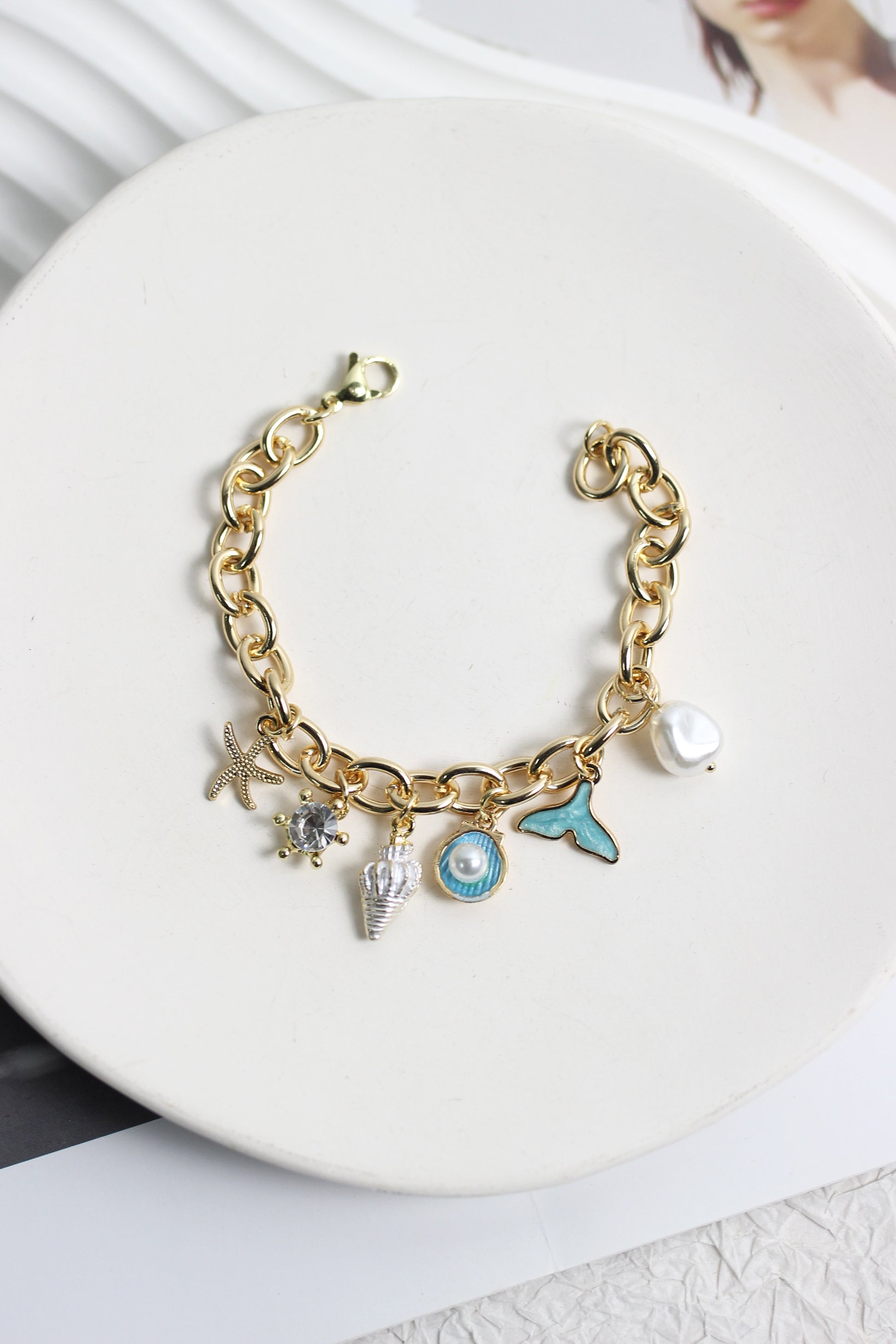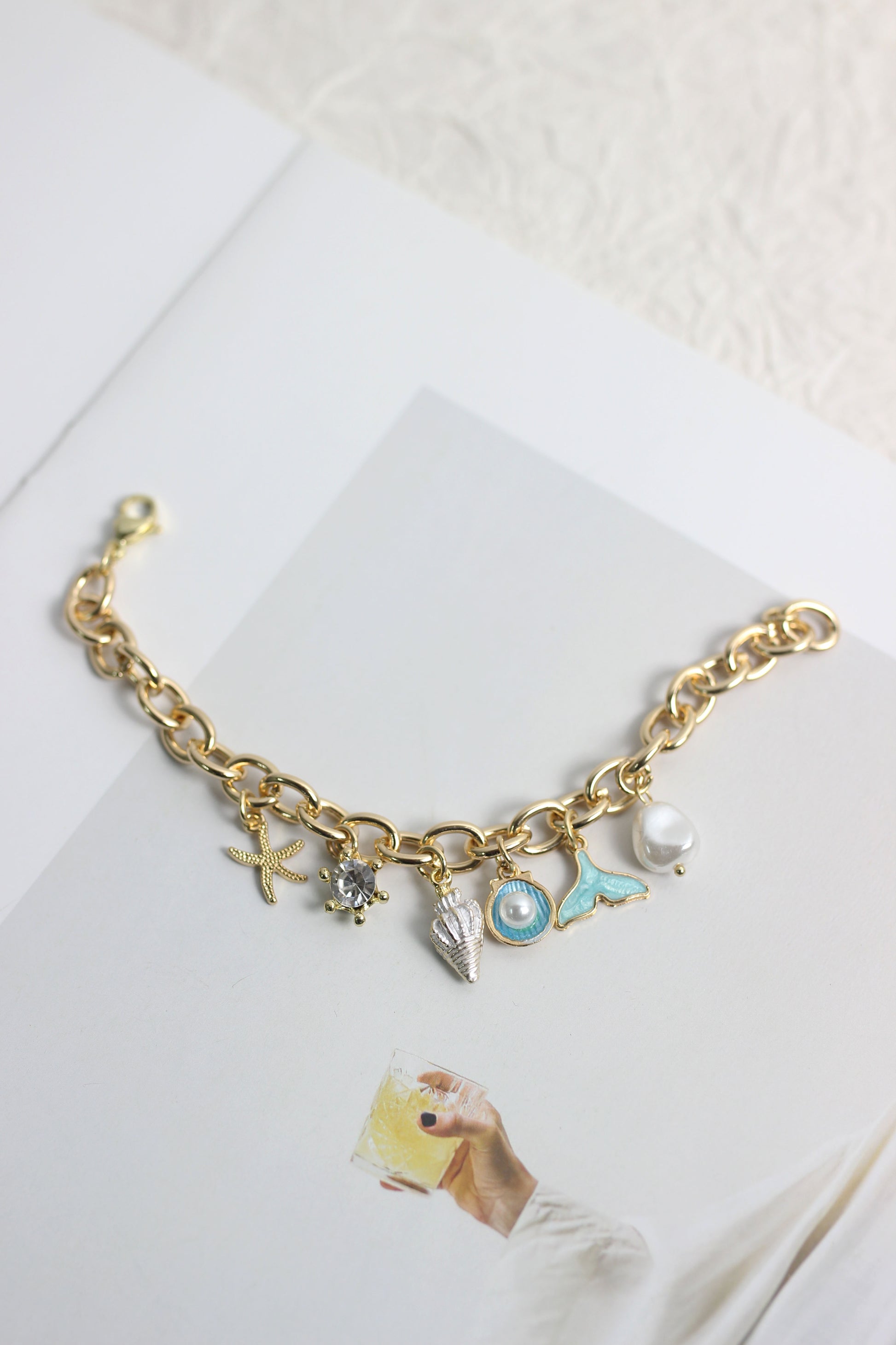 Bring the beauty of the sea to your wrist with this coastal-themed charm bracelet. Crafted with a chunky gold-tone chain, this bracelet features six unique ocean charms?aincluding a starfish, seashell, pearl, whale tail, and crystal sun?aevoking a relaxed, beachy elegance. Perfect for summer outfits, vacations, or gifting to ocean lovers.