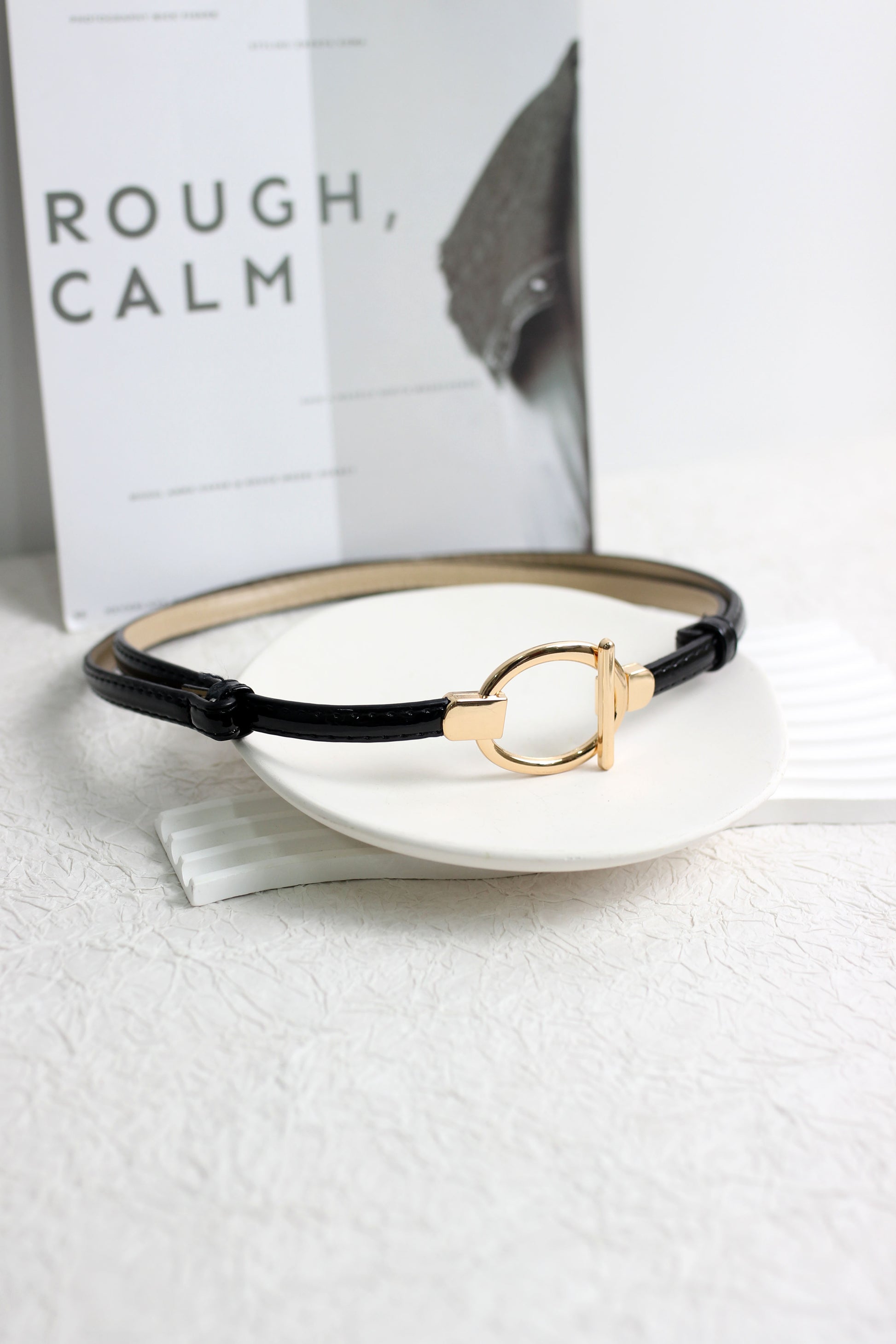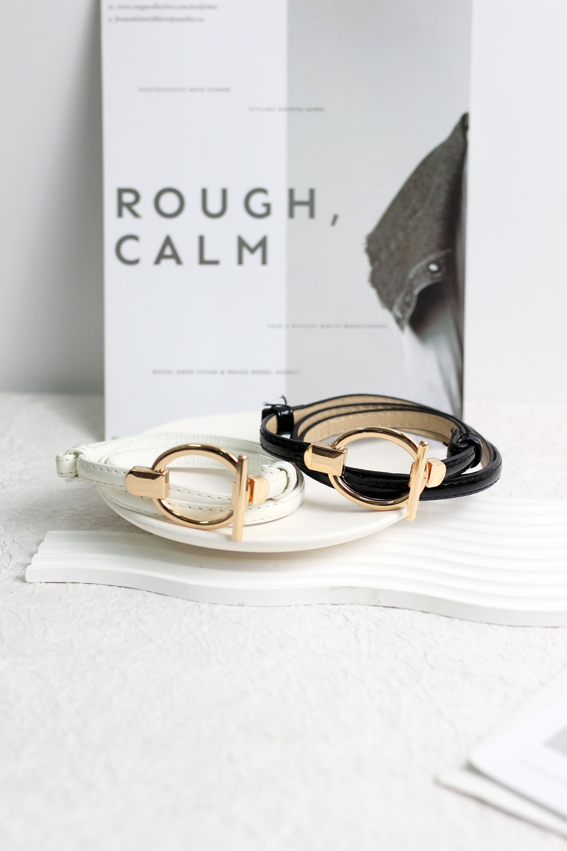 Elevate your outfit with this chic minimalist belt featuring a sleek gold oval buckle and slim profile. Made from faux leather, this adjustable skinny belt adds a polished touch to dresses, blouses, or high-waist trousers. Available in classic white and black, it's the perfect fashion accessory for both casual and dressy looks. The modern circular clasp design brings a contemporary yet elegant vibe, making it a versatile addition to any wardrobe.