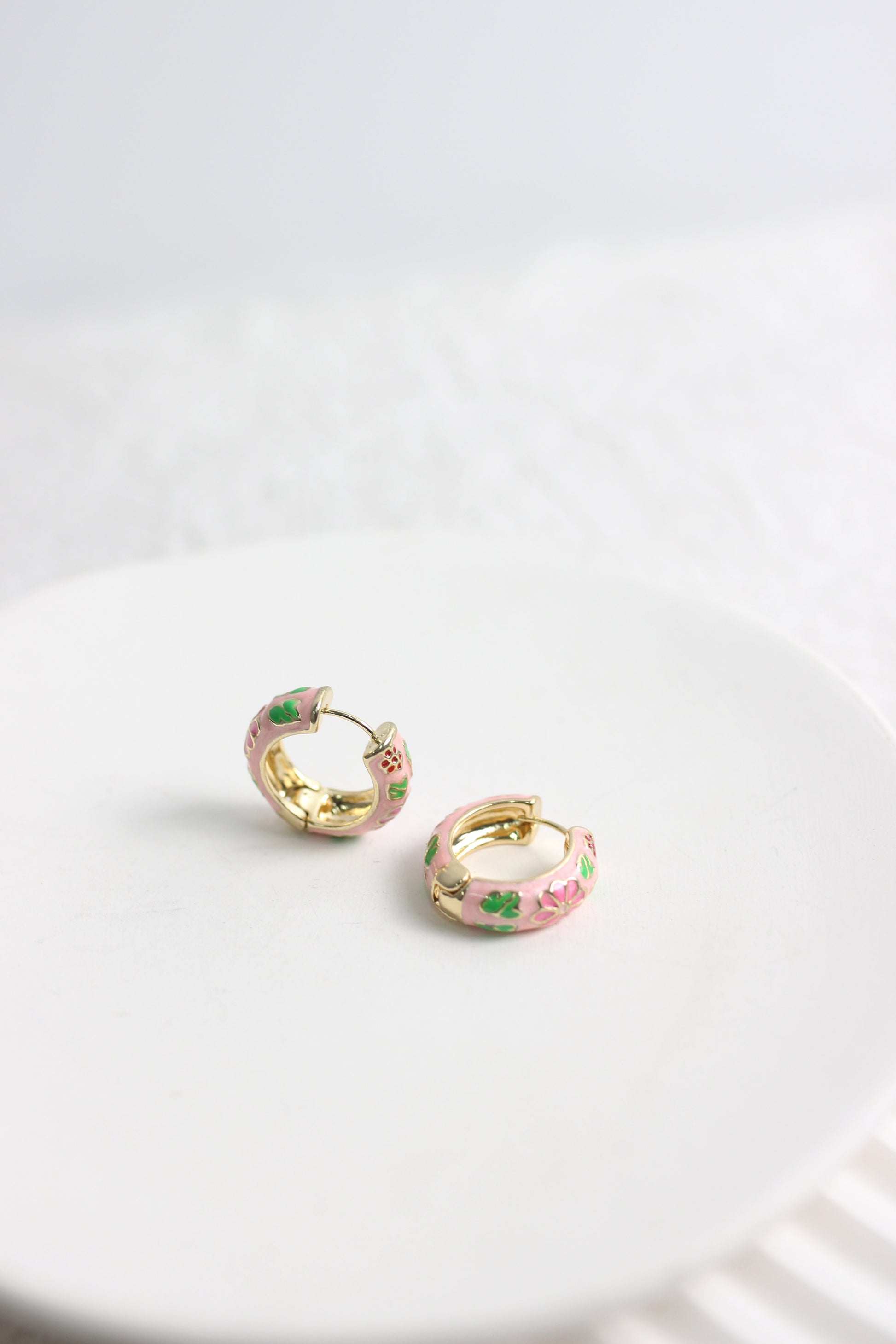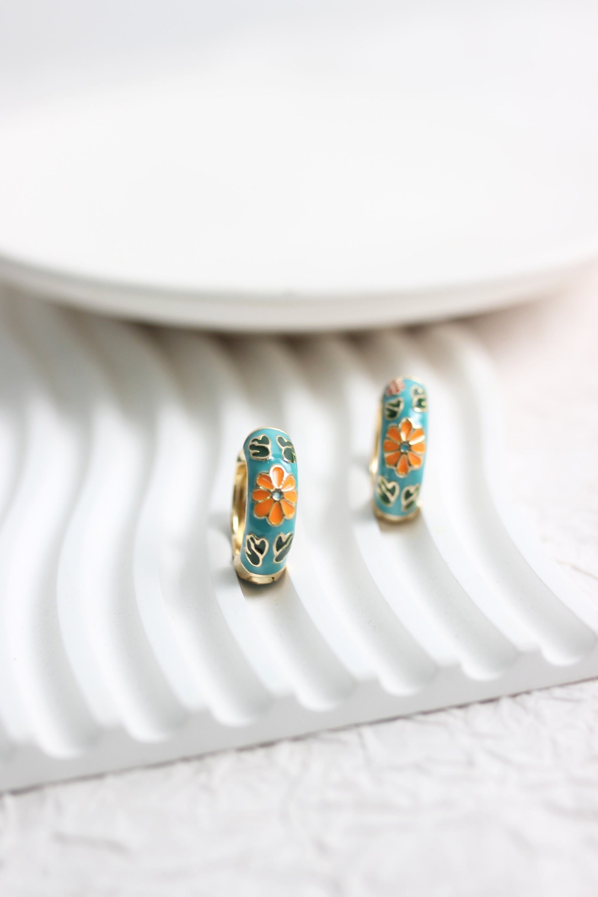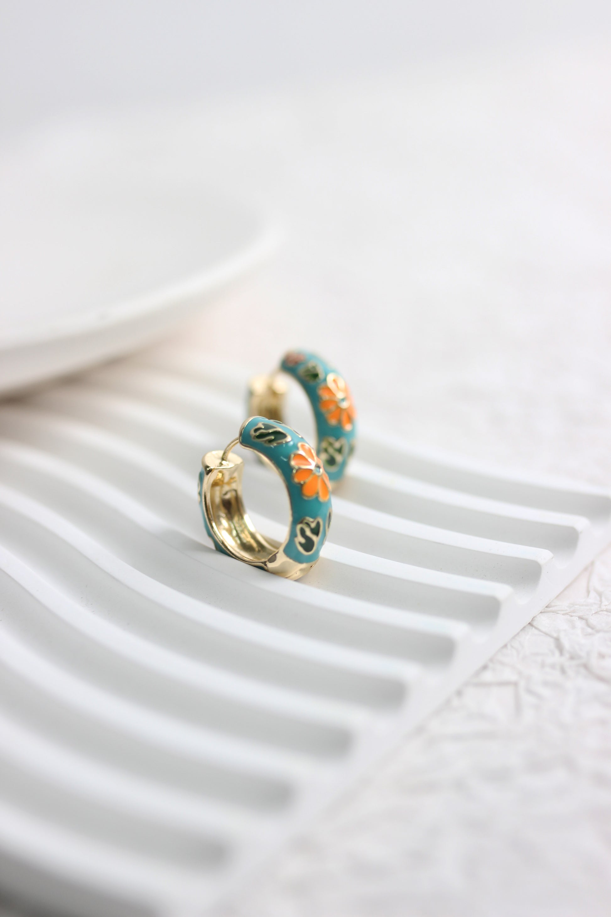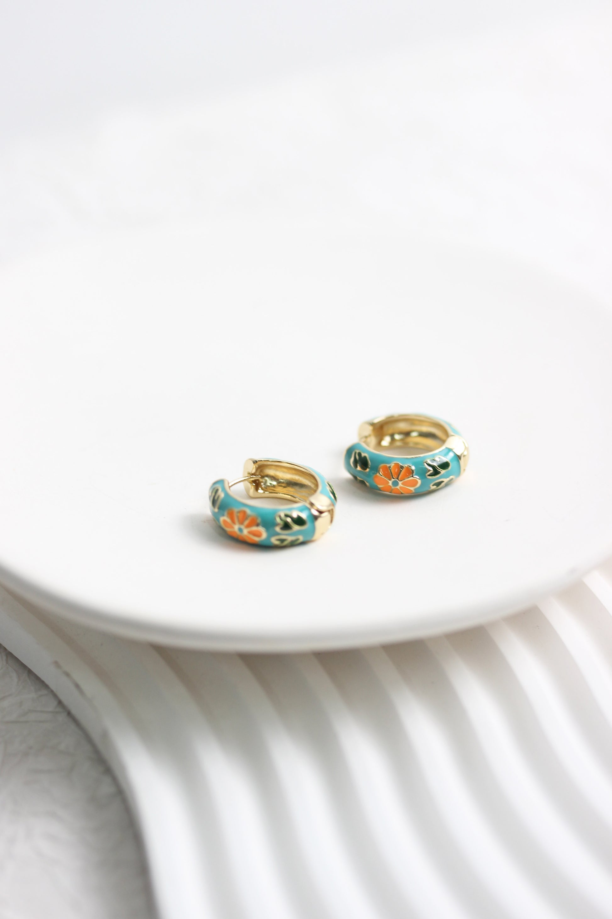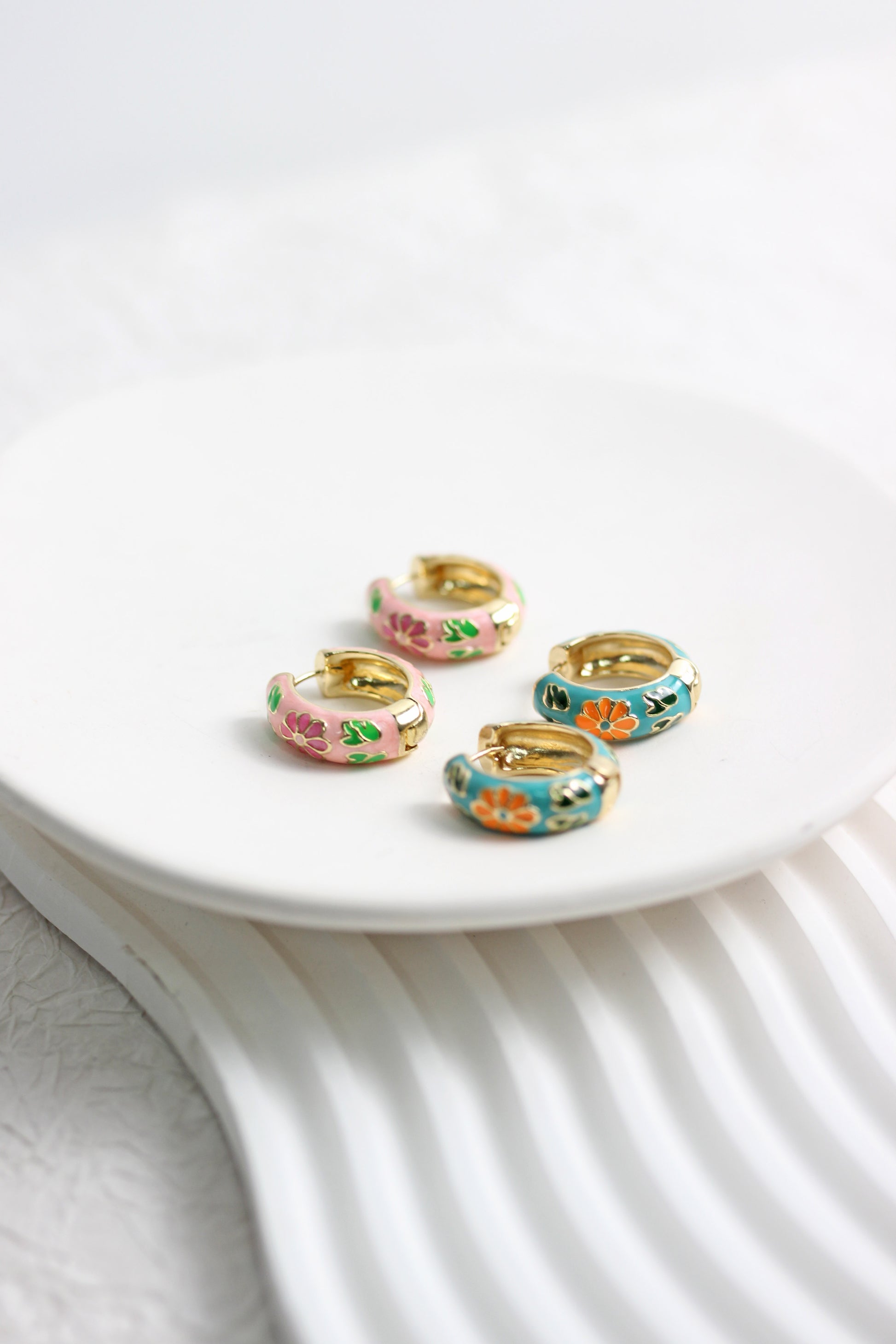 Stylish and elegant huggie hoop earrings with floral enamel detailing, crafted with a gold-tone finish. These small hoop earrings feature vibrant pink and blue enamel with delicate hand-painted flowers, perfect for adding a chic, vintage-inspired touch to any outfit. Lightweight and comfortable for daily wear, these earrings are ideal for women, girls, and fashion lovers who enjoy boho, retro, and minimalist jewelry. A great gift for birthdays, anniversaries, and special occasions.