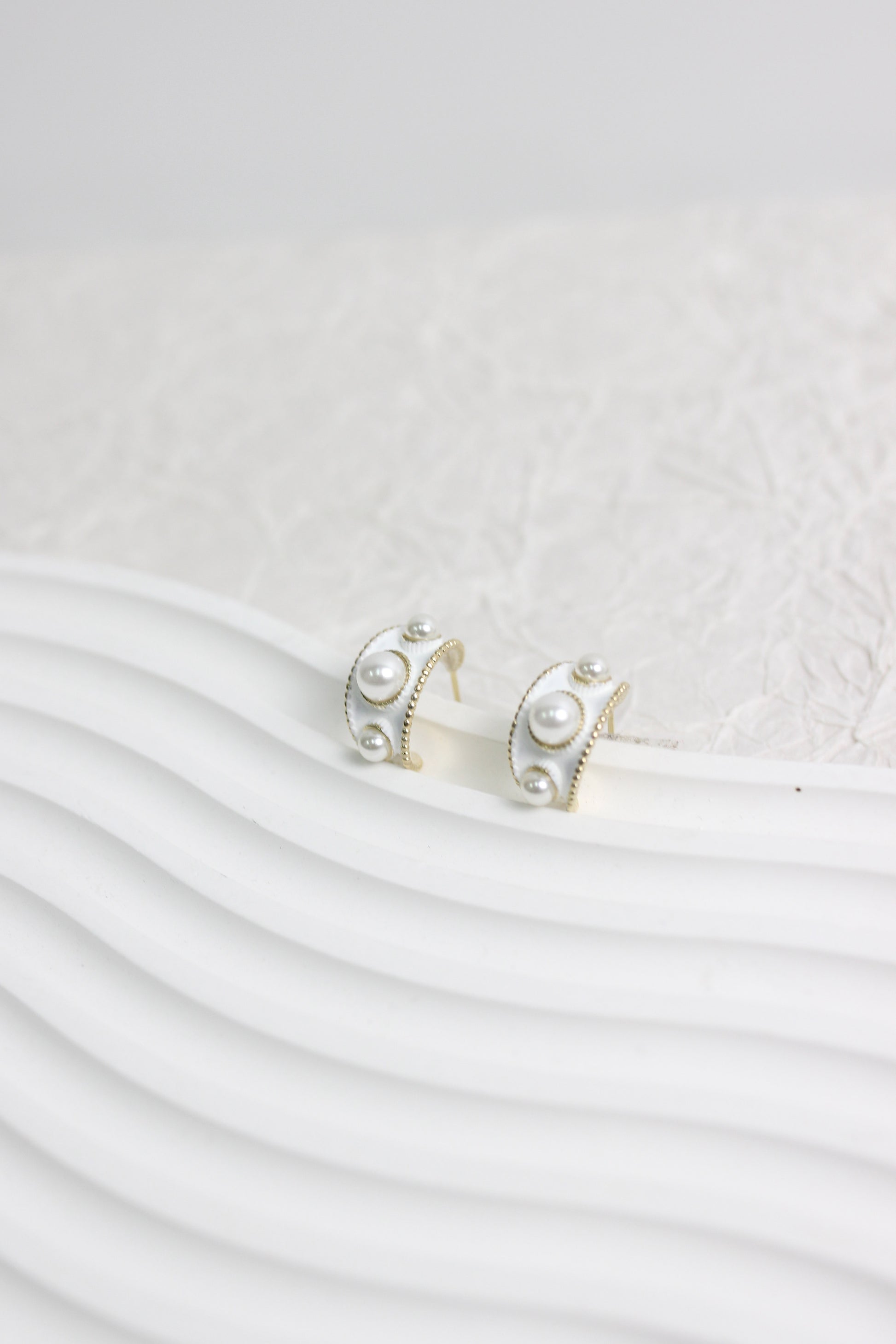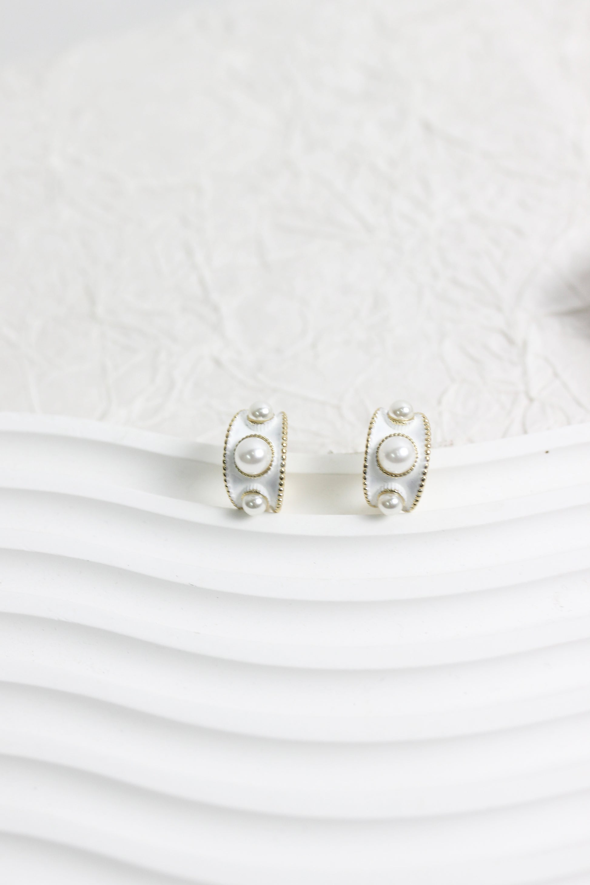 Timeless elegance meets vintage charm with these Half Hoop Pearl Earrings. Designed with a smooth white enamel base, accented by three glossy faux pearls and detailed with delicate gold bead trim, these earrings bring sophistication to any outfit.