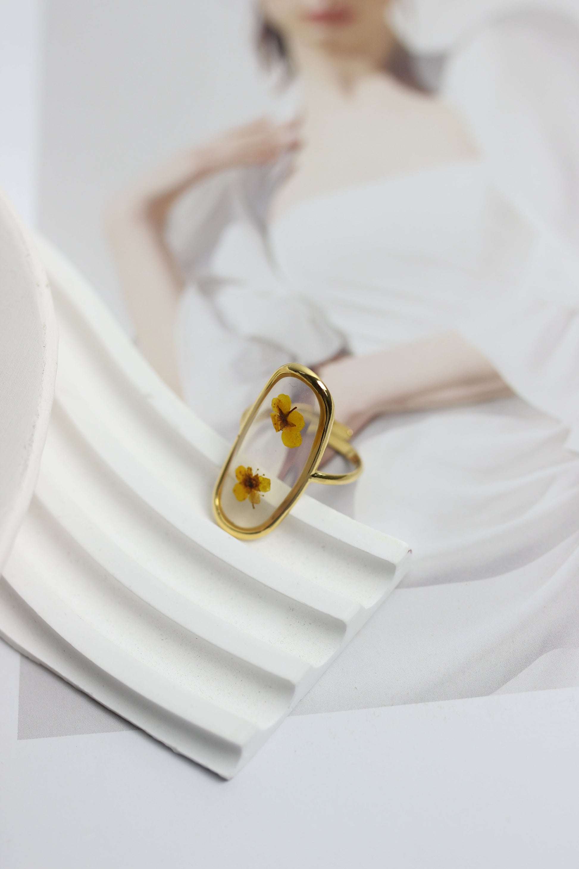 This elegant open ring features real dried flowers encased in clear acrylic, framed by a sleek gold-tone stainless steel band. The floral design adds a natural, delicate charm to your outfit, while the adjustable open band ensures a comfortable fit for most sizes. Perfect for nature lovers and minimalist jewelry enthusiasts alike.