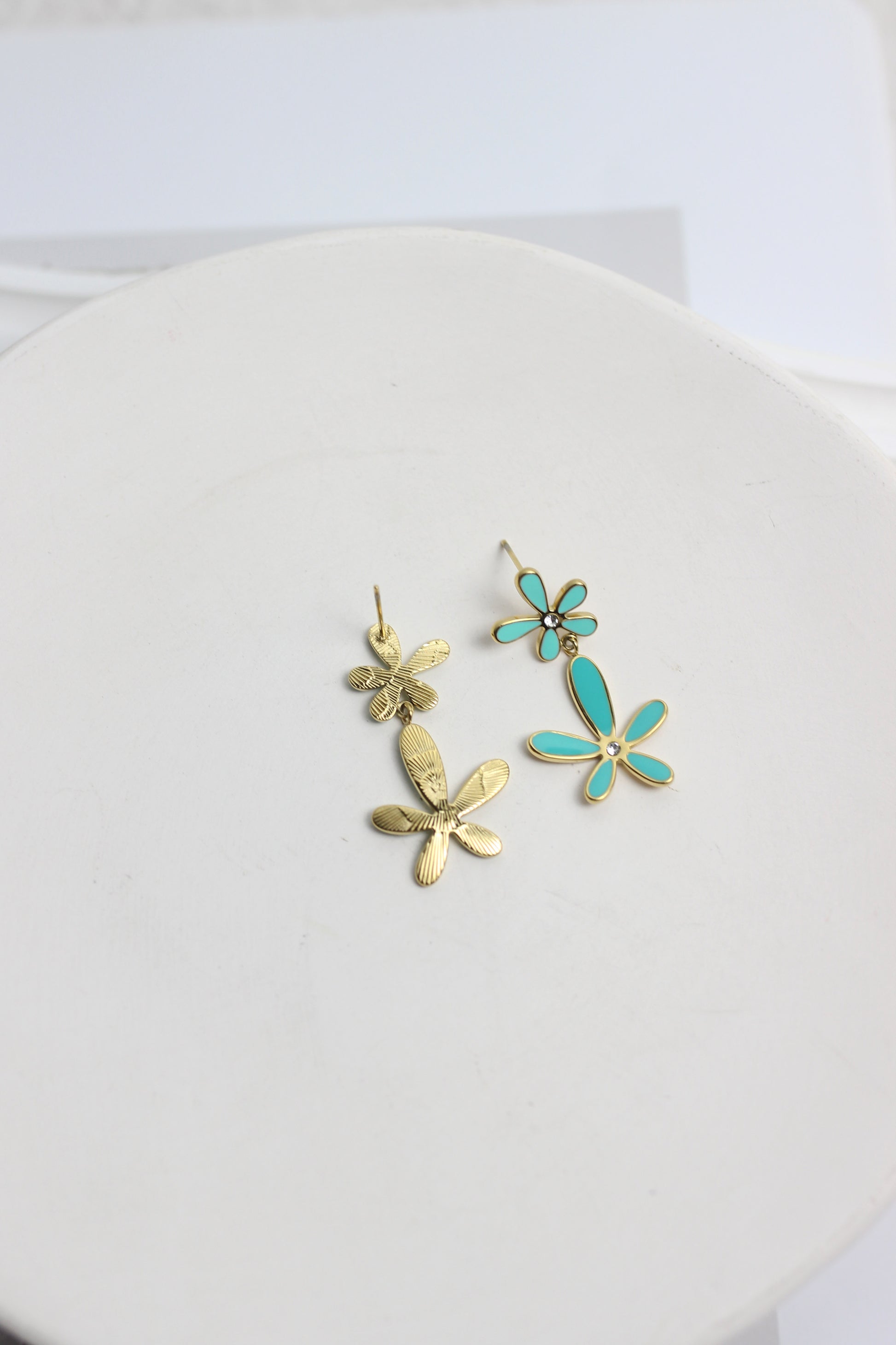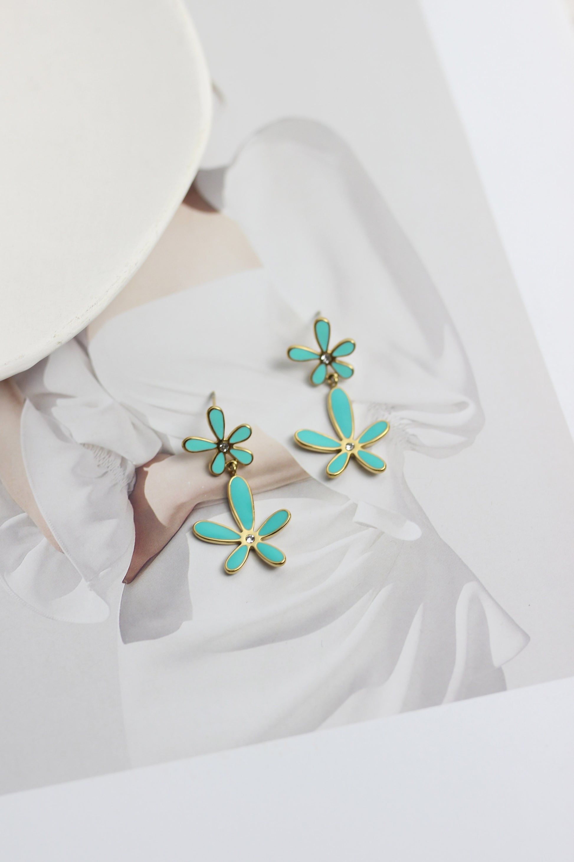 Add a pop of playful elegance to your look with these double daisy drop earrings. Featuring turquoise enamel petals outlined in gold-tone stainless steel, each earring showcases two daisy flowers linked vertically for a layered floral effect. Lightweight yet eye-catching, these earrings are perfect for spring outfits, summer dresses, or a cheerful everyday statement.