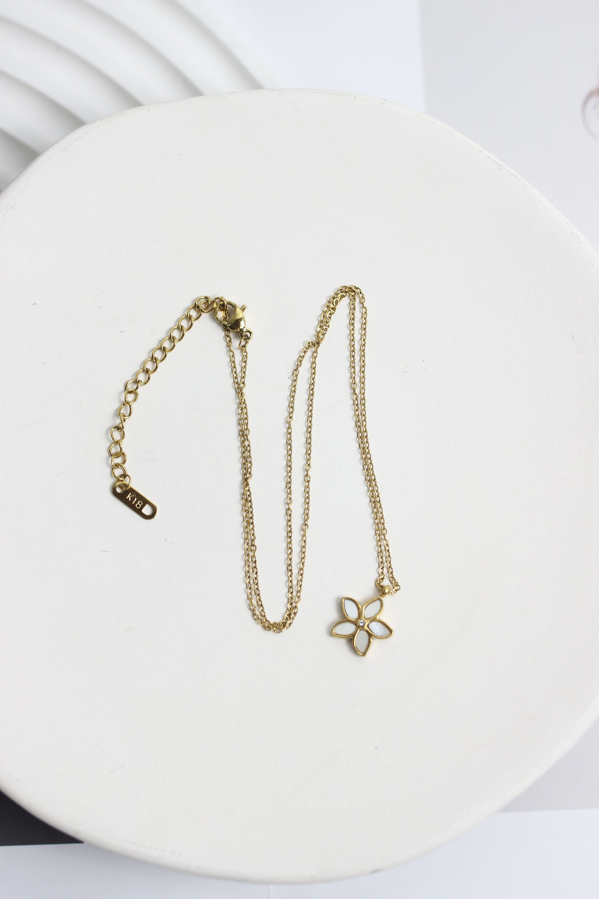 This elegant flower pendant necklace is crafted from durable stainless steel with a luxurious 18K gold plating. The delicate open-petal design is accented with a sparkling center crystal, making it a timeless piece for any outfit. The fine chain includes an adjustable extender for a perfect fit. Hypoallergenic and tarnish-resistant, this necklace is perfect for everyday wear or as a thoughtful gift for her.