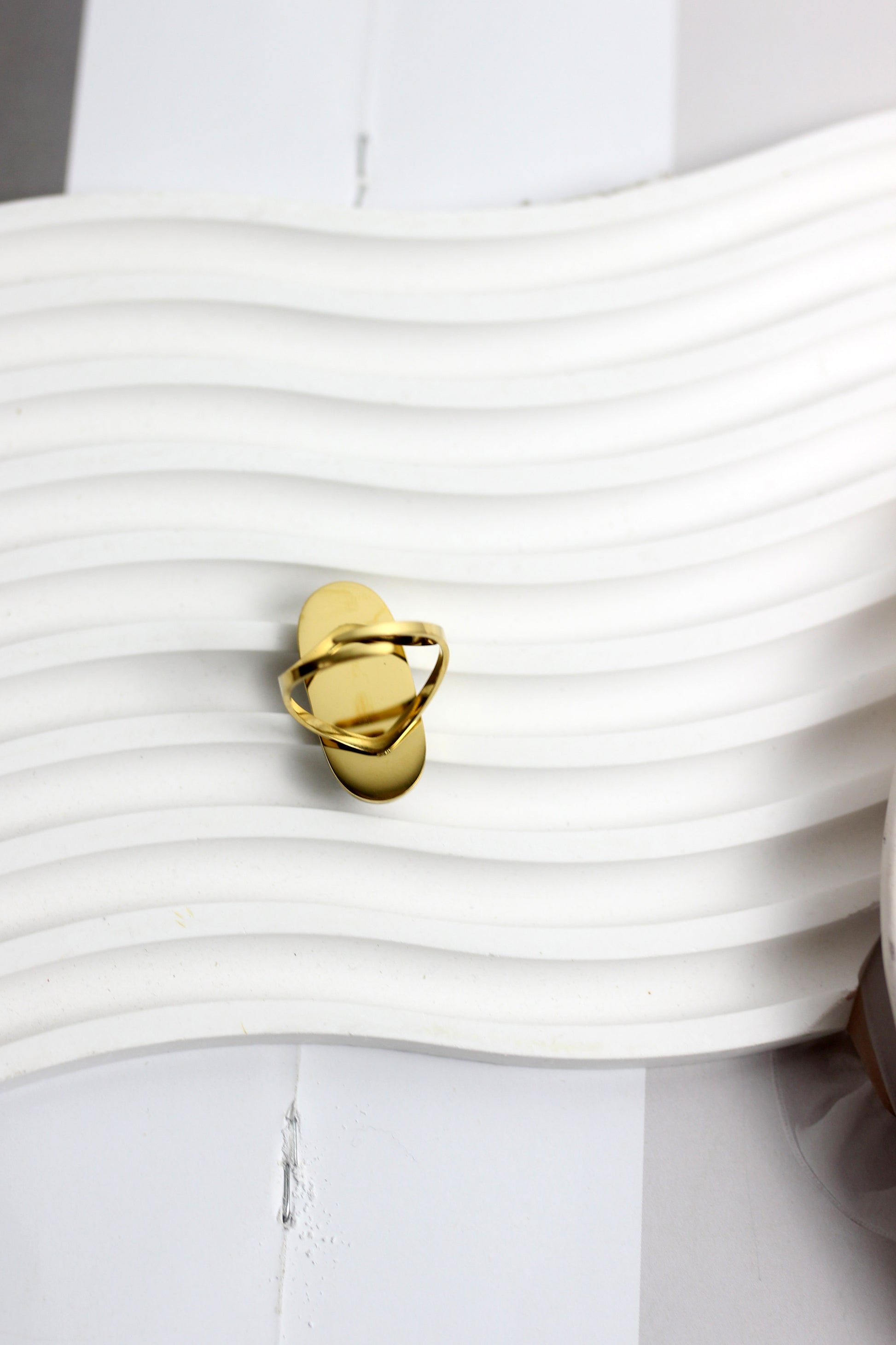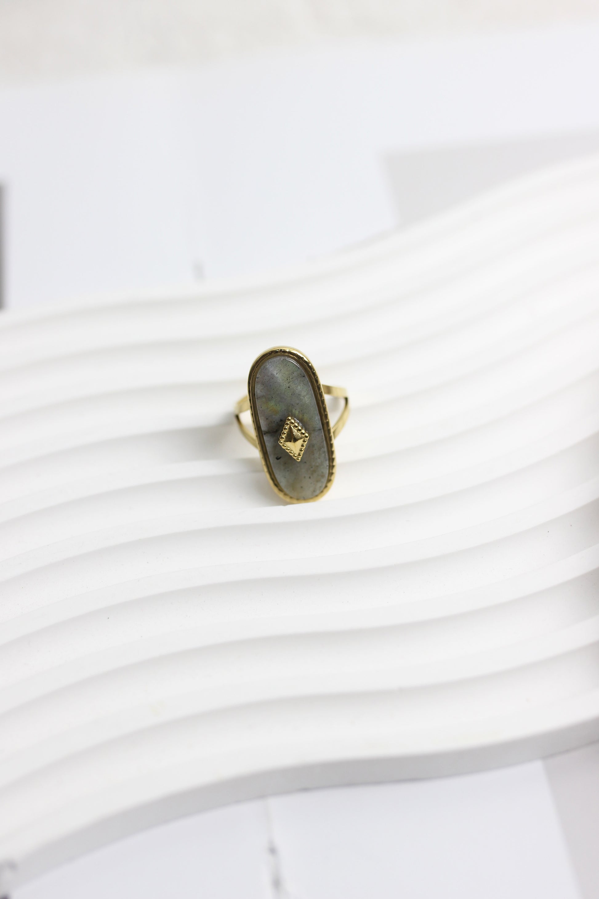This elegant statement ring features a smooth oval-cut labradorite stone set in a sleek gold-tone bezel. The subtle iridescence of the stone is accented by a minimalist square gold charm, creating a modern, artistic look. With an open adjustable band, this ring offers a comfortable fit for most finger sizes. Perfect for everyday sophistication or layering with other pieces.