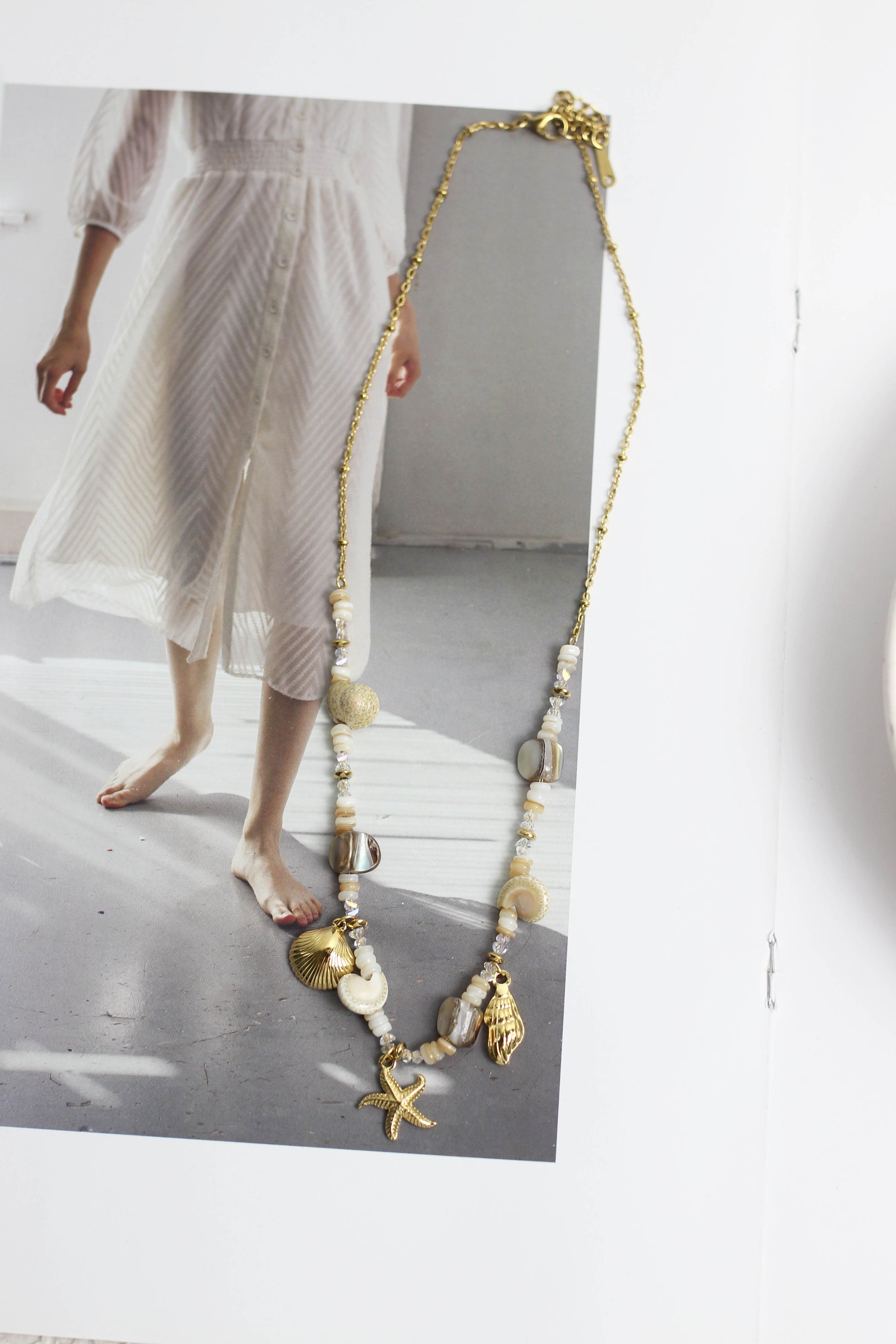 Capture coastal charm with this beach-inspired necklace featuring synthetic shell beads, textured stone-like accents, and playful gold-plated ocean charms¡ªincluding a starfish, scallop, and conch shell. The beads are artfully arranged along a sturdy 18K gold plated stainless steel chain, creating a balanced, natural look. Lightweight and stylish, this boho necklace is perfect for summer outfits, seaside vacations, or adding a relaxed vibe to any look.
