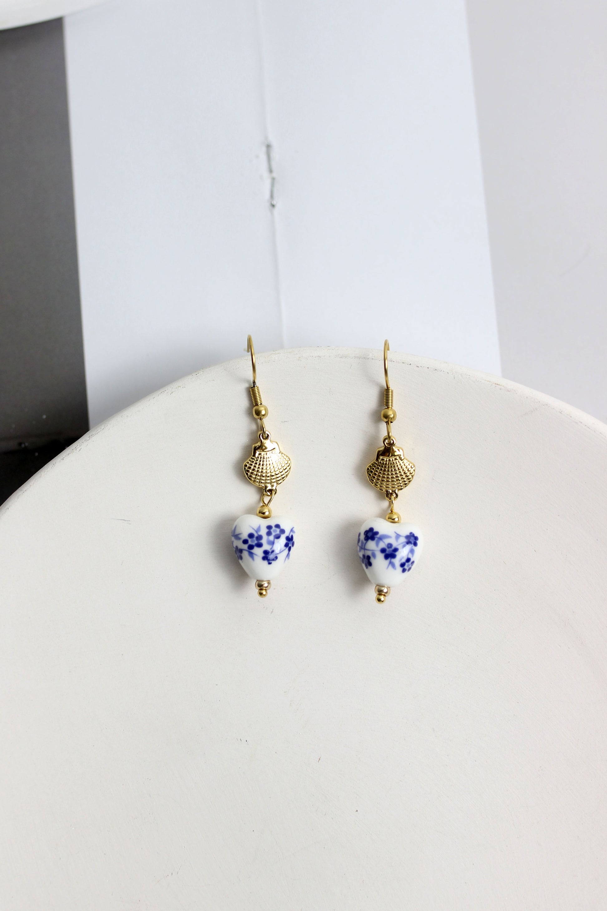 These delicate drop earrings feature hand-painted porcelain heart charms adorned with blue floral motifs, reminiscent of classic Chinese ceramic art. Accented with textured gold-tone shell connectors and elegant fish hook ear wires, they bring together vintage charm and modern elegance. Lightweight and eye-catching, perfect for both everyday wear and special occasions.