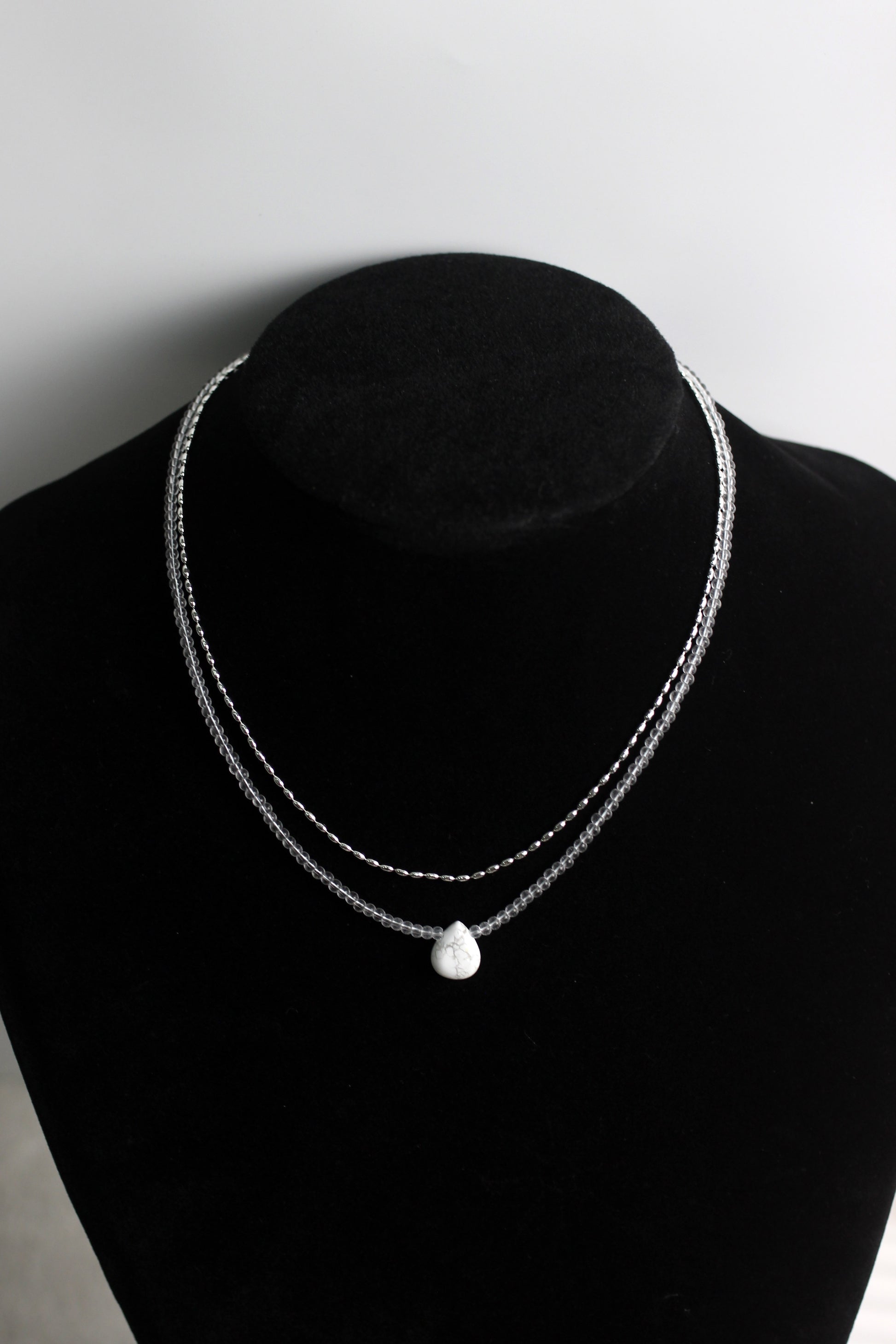 Elegant and minimalist, this layered choker necklace features a white howlite teardrop pendant suspended from a transparent beaded chain, paired with a twisted silver-tone metal chain. The combination of semi-precious stone and dainty layers makes it perfect for boho fashion, casual wear, or layering with other pieces. Adjustable clasp allows a customized fit for all necklines.