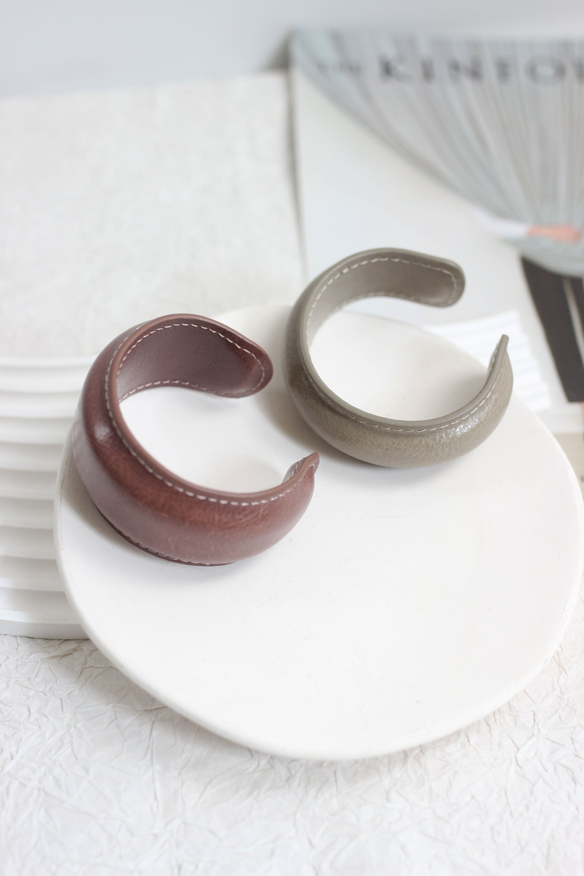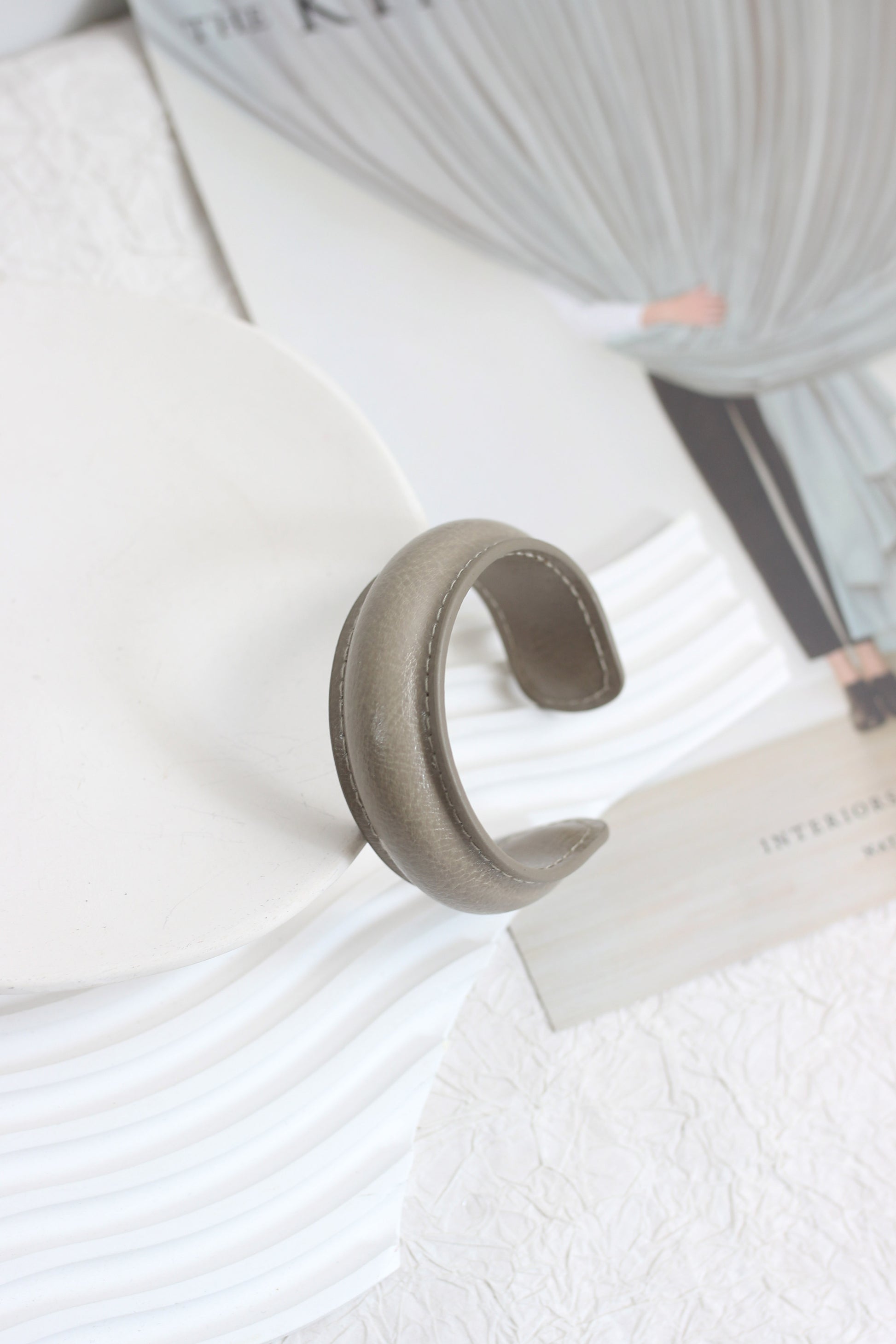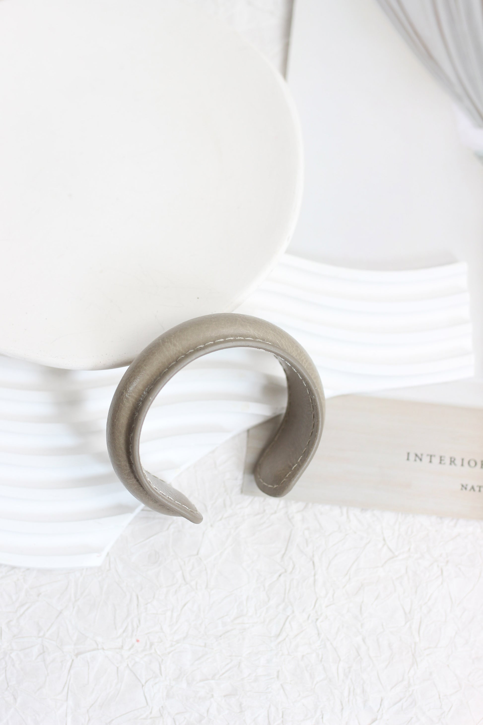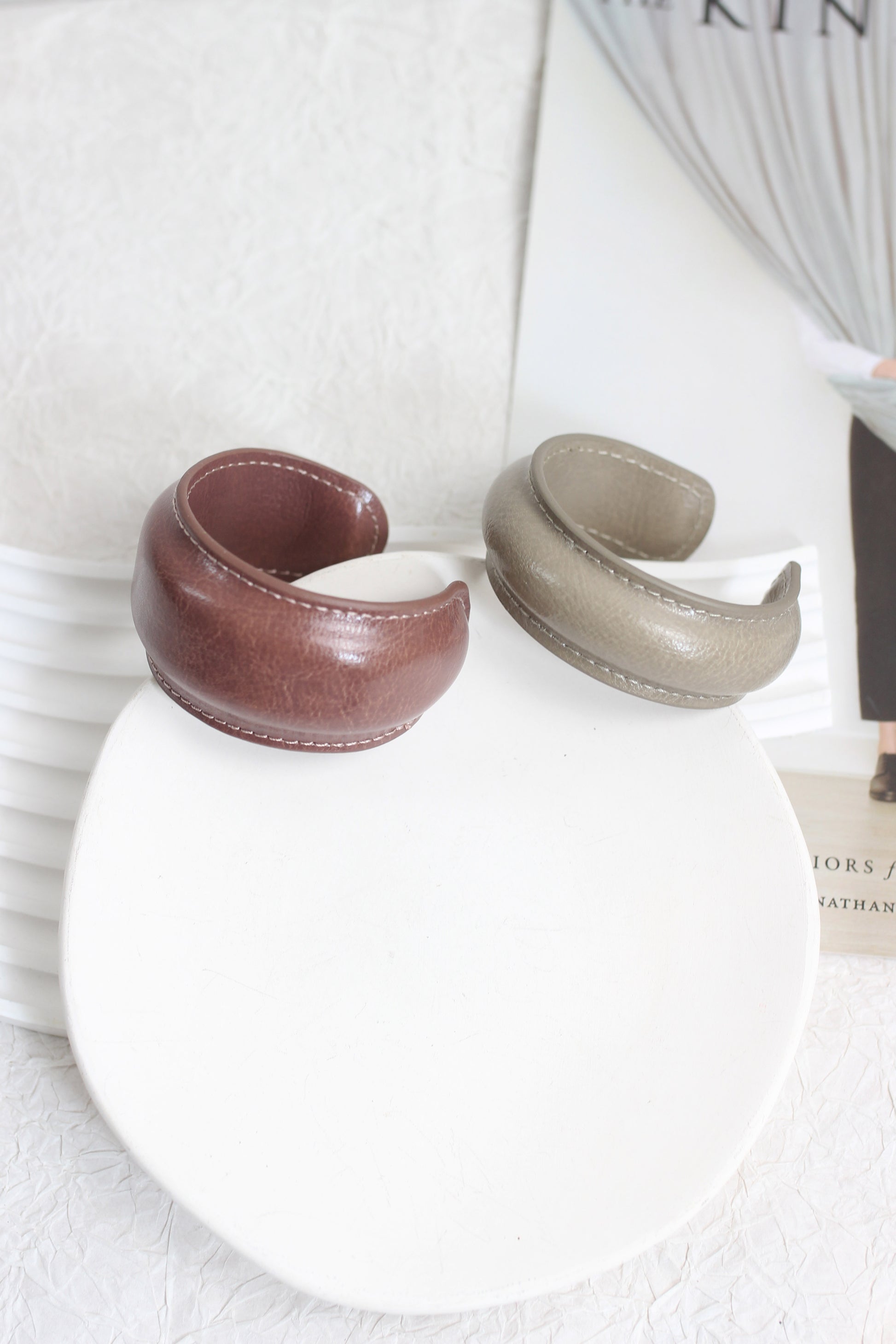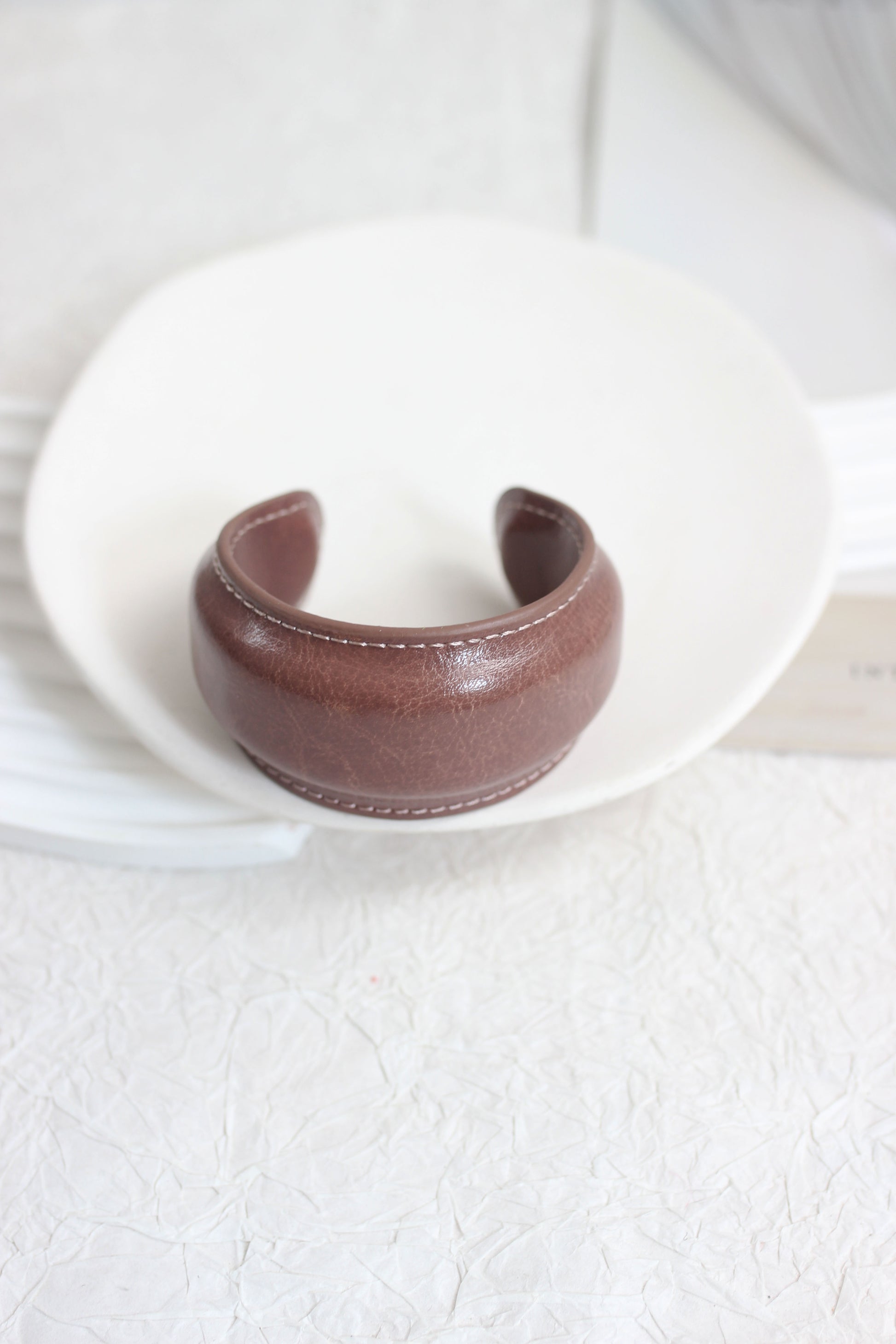Make a bold yet refined statement with this vintage-inspired leather cuff bracelet, available in rich dusty pink and elegant sage. Crafted with a wide, padded band and finished with visible topstitching, this?open bangle bracelet offers a comfortable fit and timeless appeal. Perfect for pairing with both casual and minimalist outfits, this piece brings a soft, structured edge to your look.
