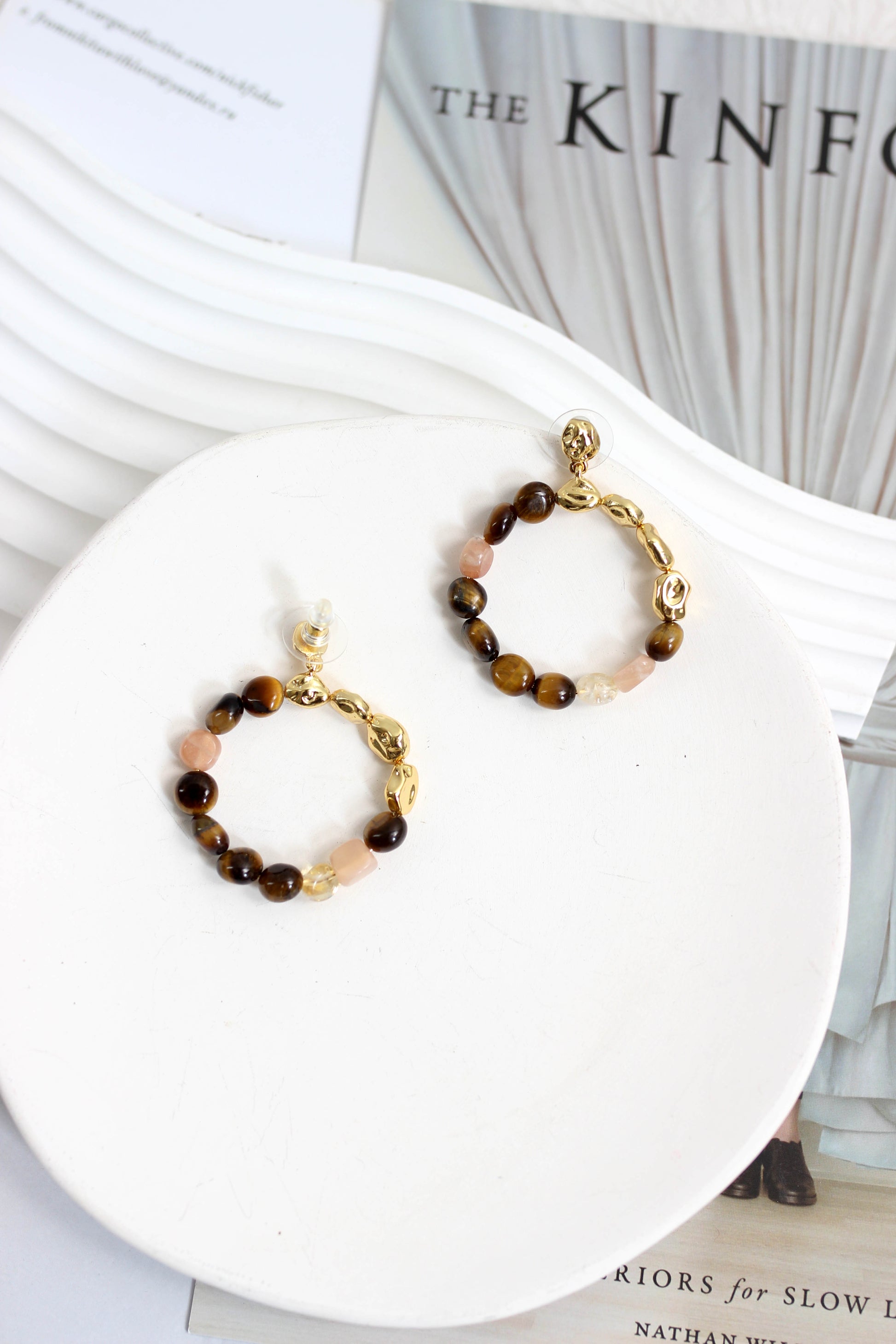 Elevate your accessory game with these handcrafted natural stone hoop earrings featuring a stunning mix of Tiger Eye, Rose Quartz, and Citrine-like quartz beads, paired with gold-plated copper accents. These lightweight, elegant earrings add a boho-chic flair to any look¡ªperfect for both casual and formal styles.