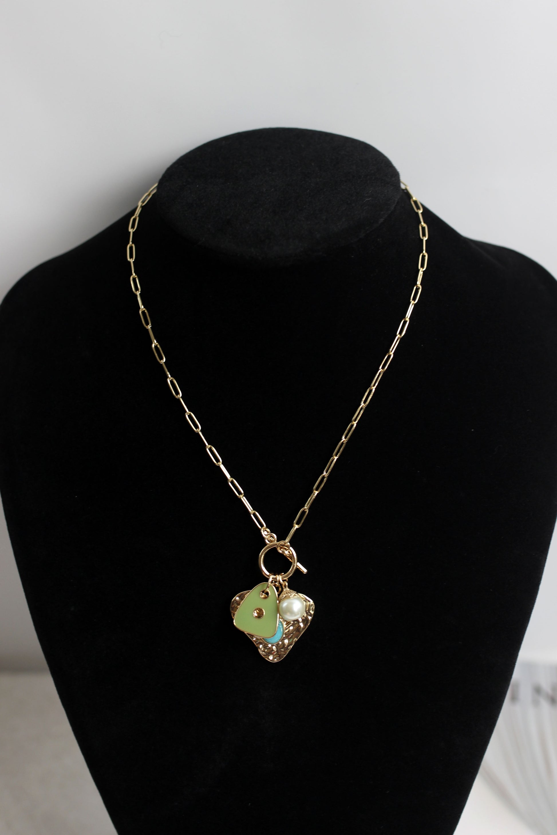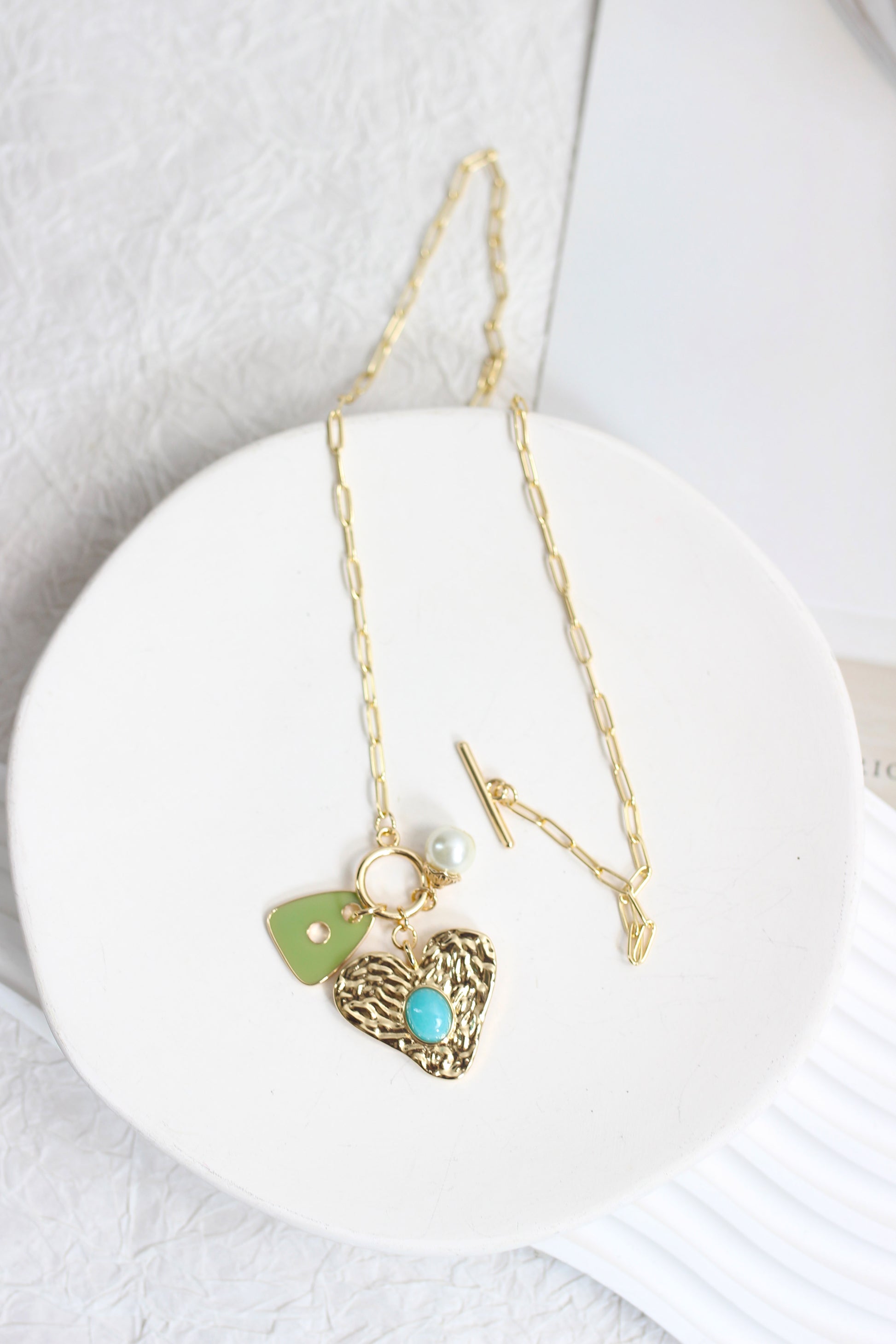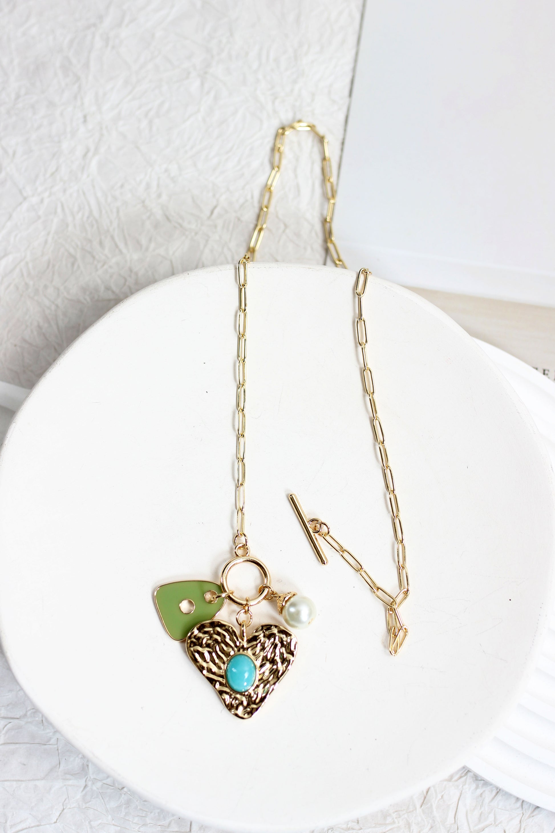 Add a bold and artistic flair to your look with this chunky gold chain necklace featuring a textured heart-shaped pendant in hammered gold finish. The heart charm is adorned with a turquoise stone, complemented by a faux pearl bead and a modern green enamel tag for a stylish contrast. The T-bar toggle clasp adds both security and elegance to this statement piece. Perfect for boho chic, retro, or minimalist layering looks, this necklace elevates both casual and dressy outfits.