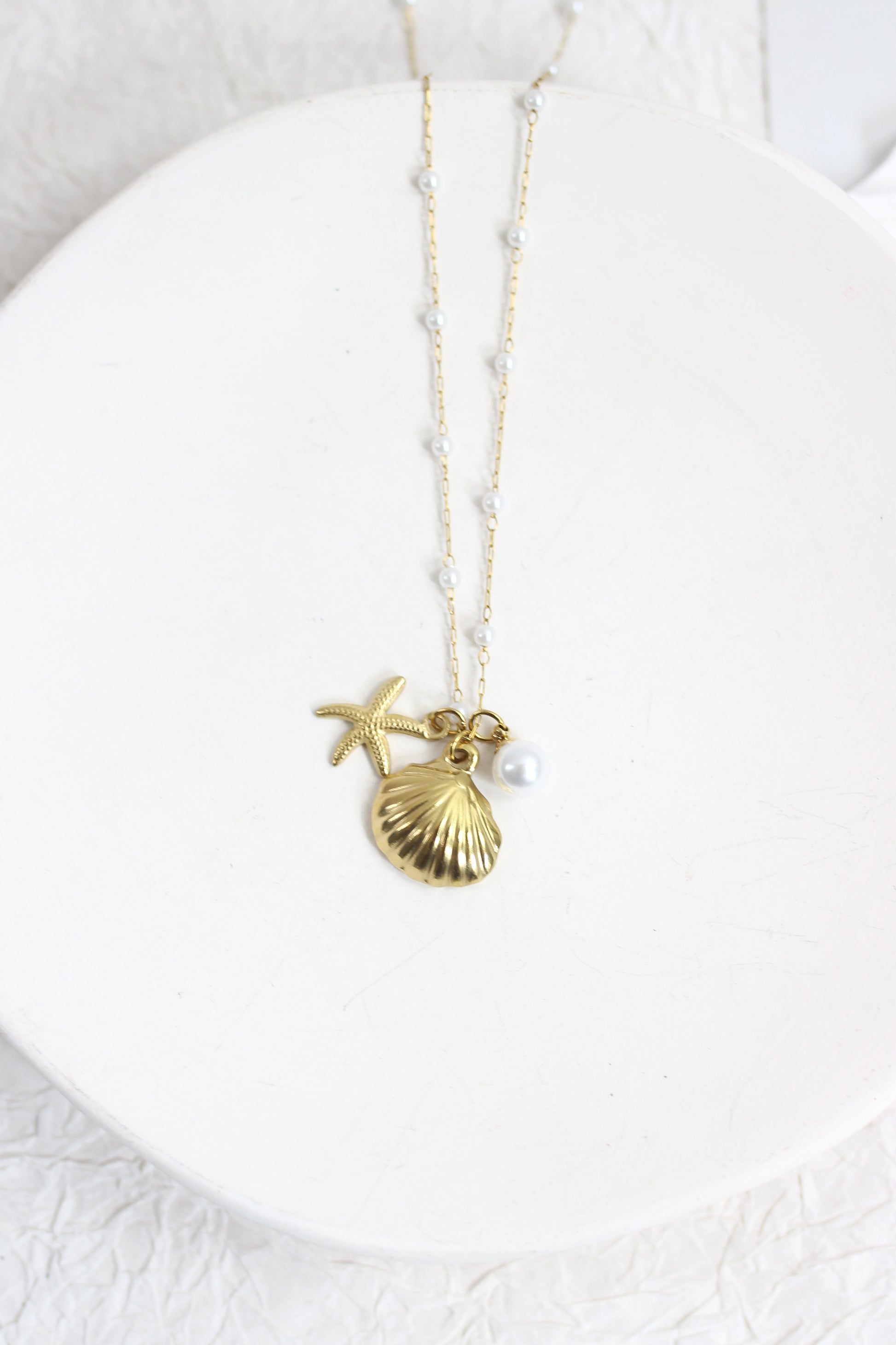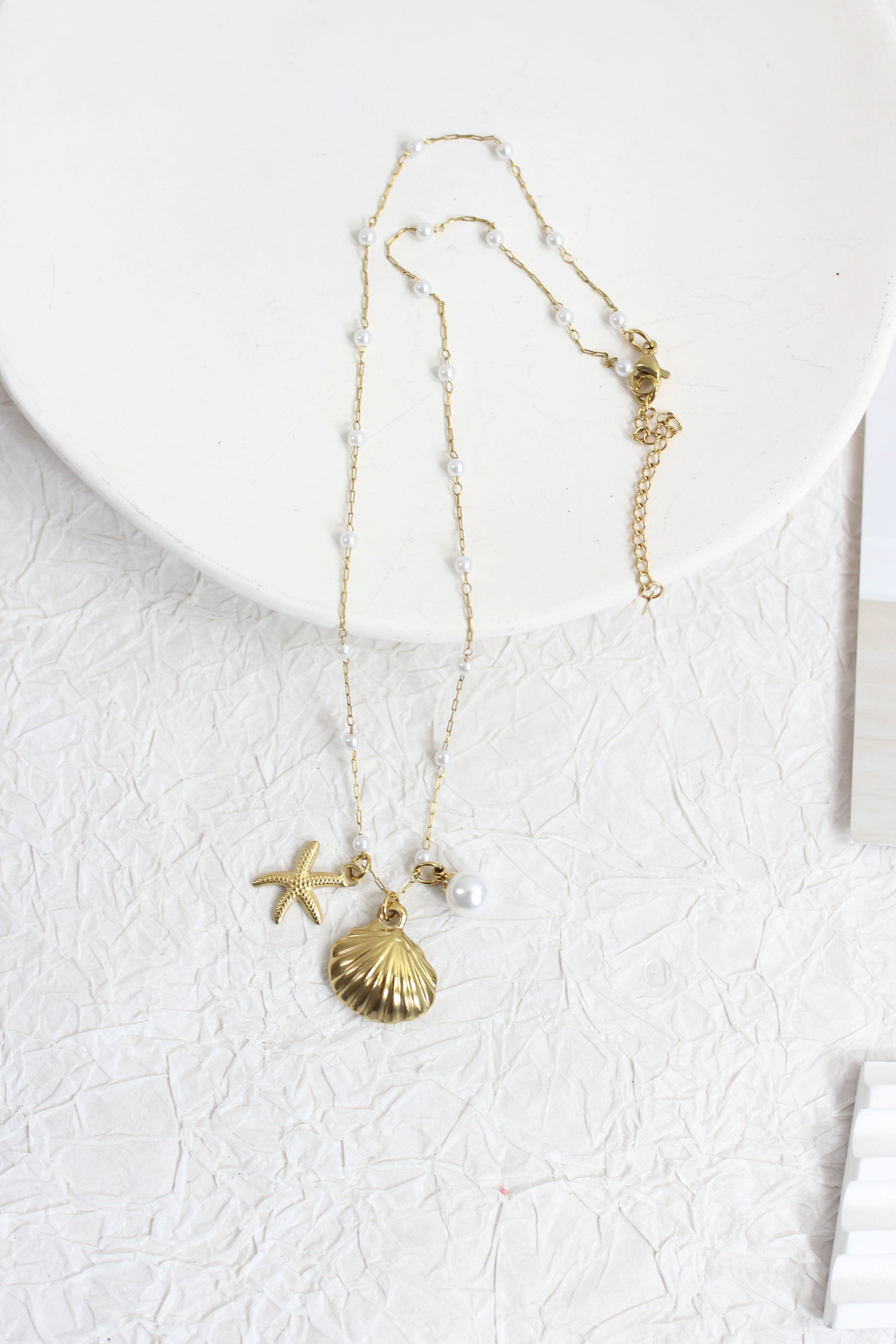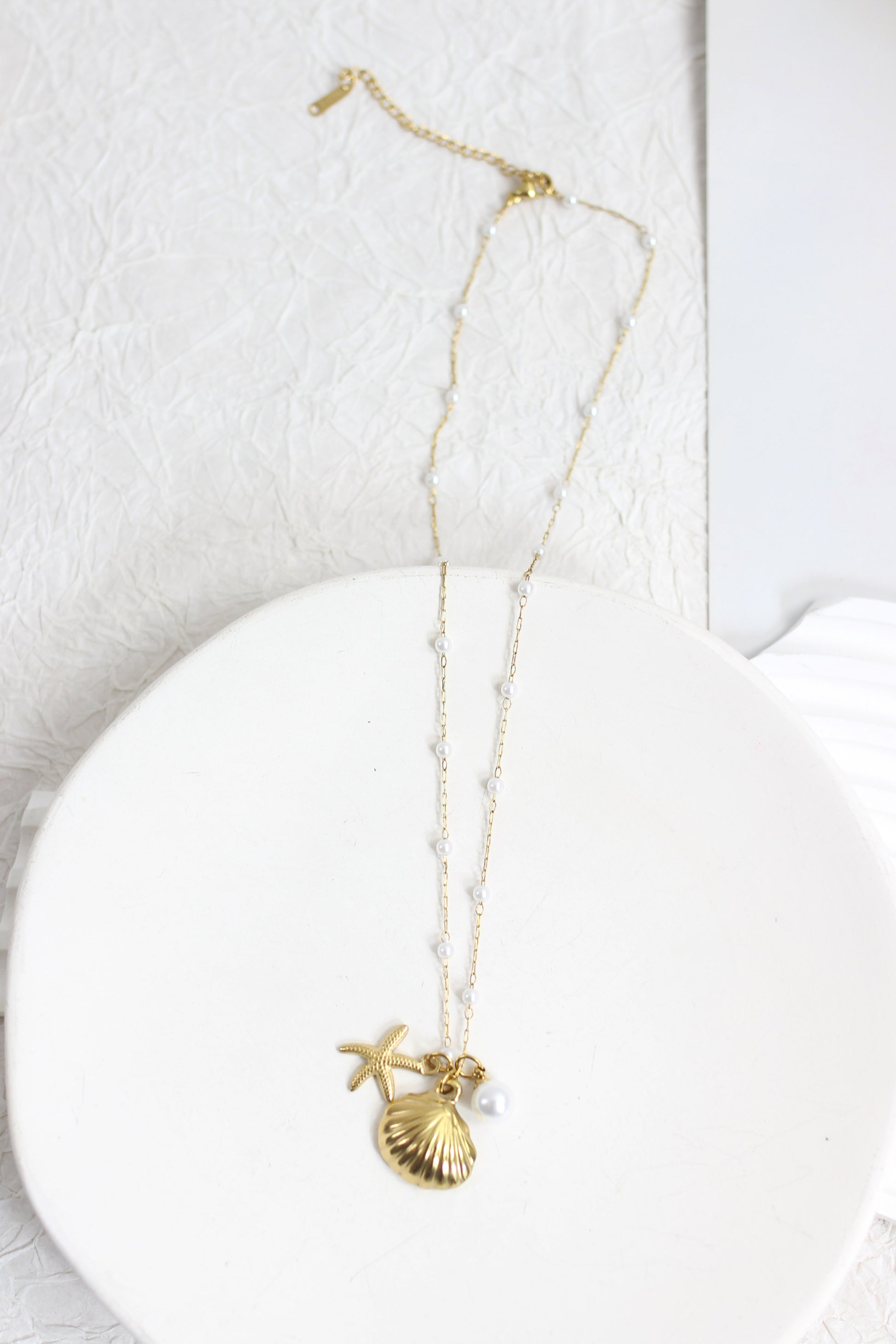Bring the charm of the ocean to your everyday style with this gold stainless steel necklace featuring a dainty pearl-accented chain and three elegant charms: a textured starfish, a polished scallop shell, and a lustrous faux pearl bead. The necklace is crafted from durable stainless steel and finished in shiny gold plating for long-lasting wear without tarnishing or fading.