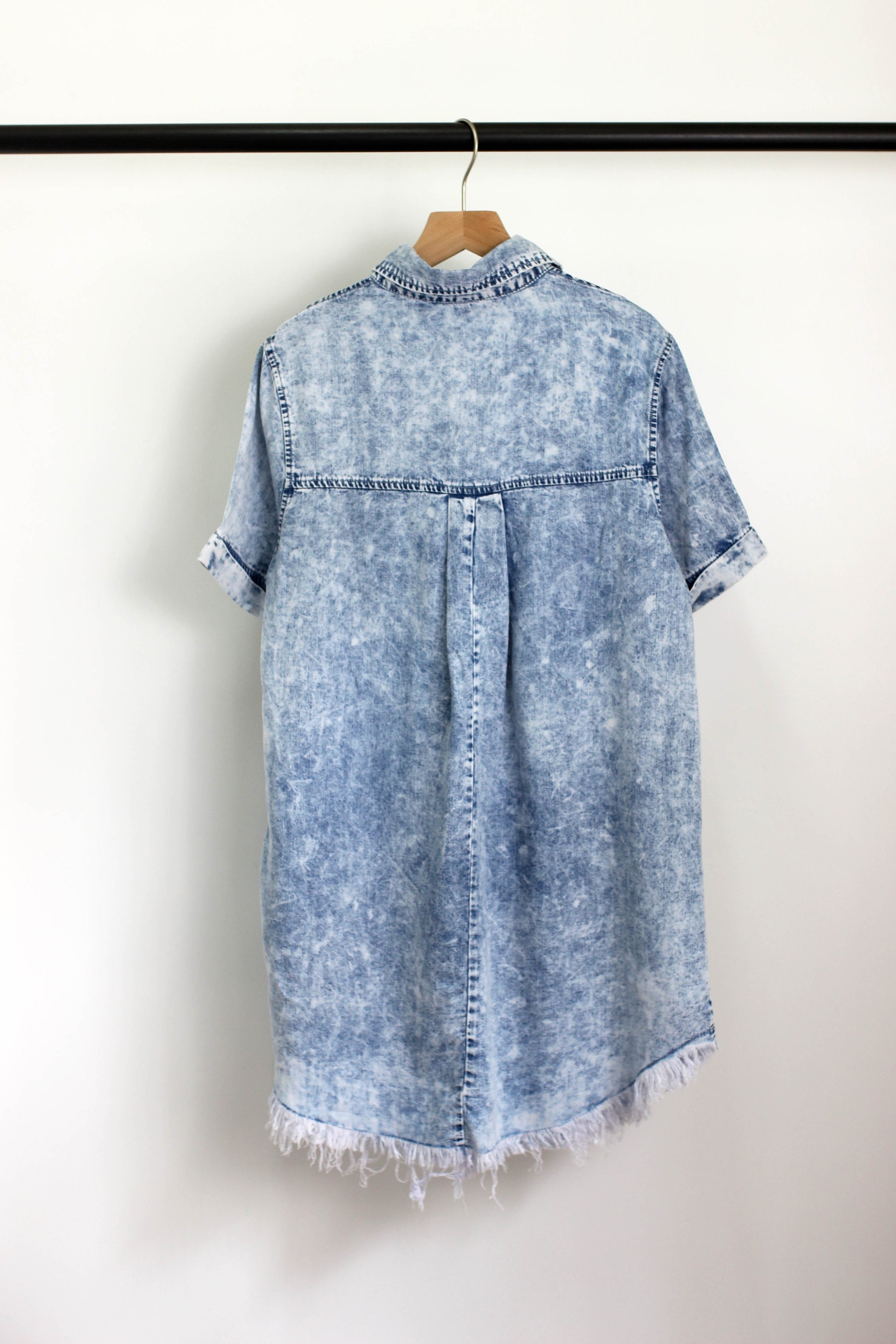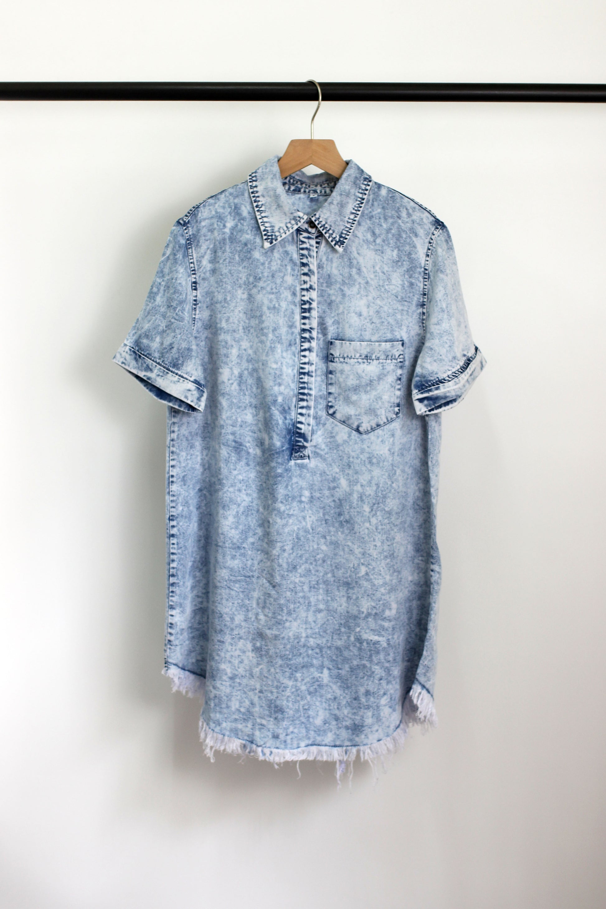 Be fashionably undecided with our Simple Moments Blue Midi Dress! This dress features a playful button front design and chest pocket, short sleeve, raw bottom detail, perfect sand washed, making it perfect for any occasion.