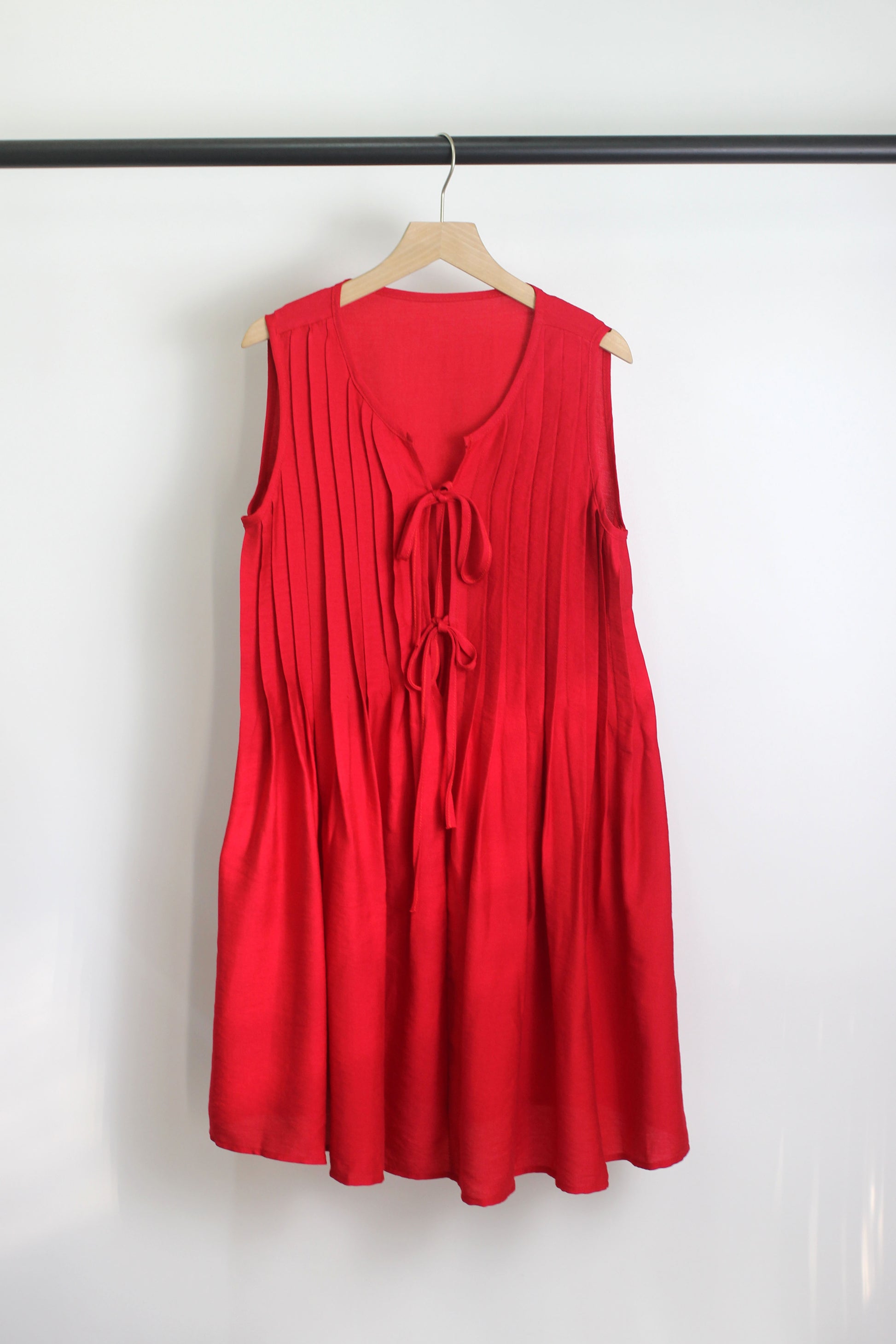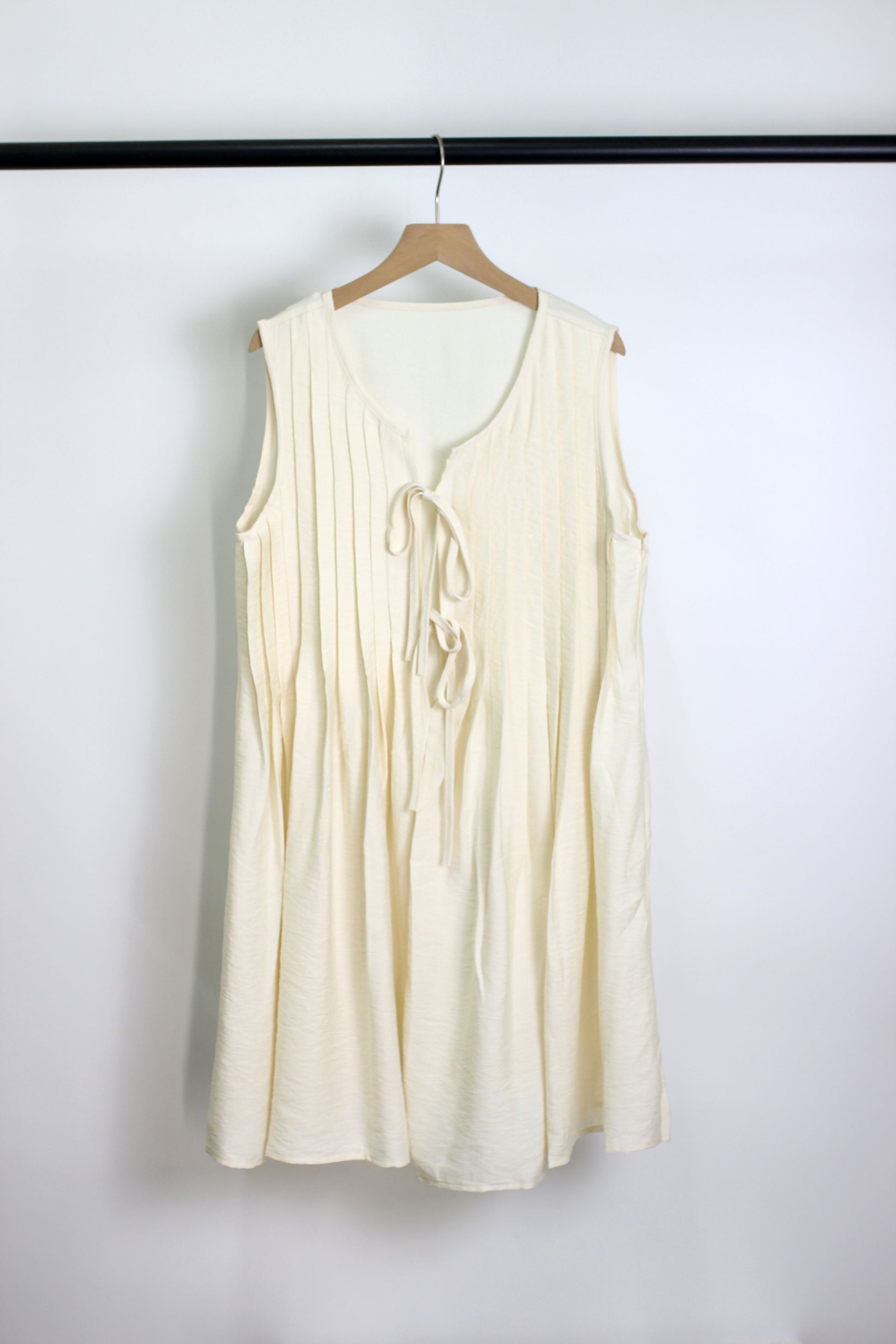 A lightweight and breezy sleeveless dress featuring delicate pleats and a chic front tie detail. The flowy silhouette offers a relaxed and comfortable fit, perfect for warm weather and casual outings. Designed with a soft and breathable fabric, this dress ensures all-day comfort while maintaining an effortlessly elegant and feminine look. Available in multiple vibrant colors, it pairs well with sandals, sneakers, or heels for a versatile style. No lining.