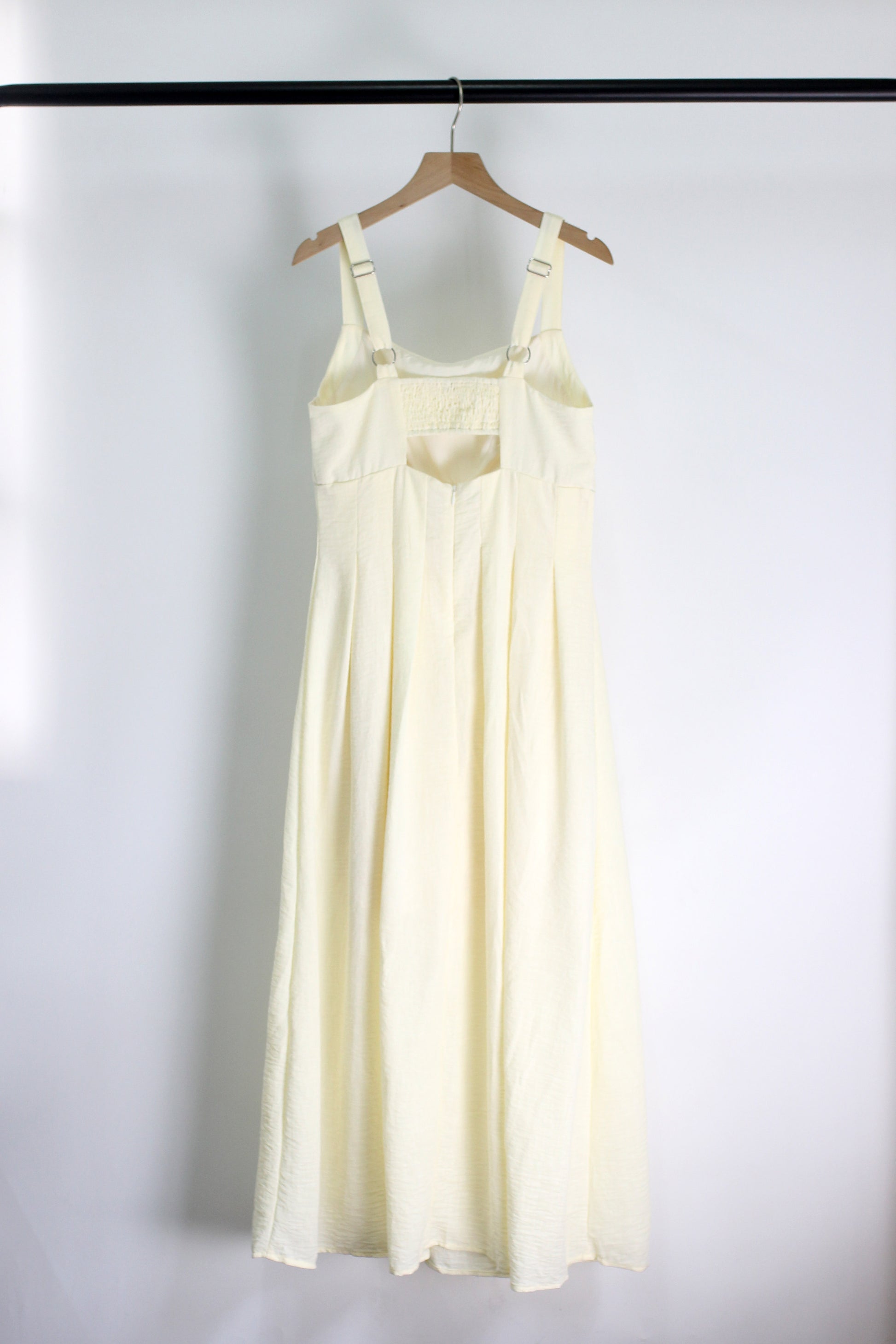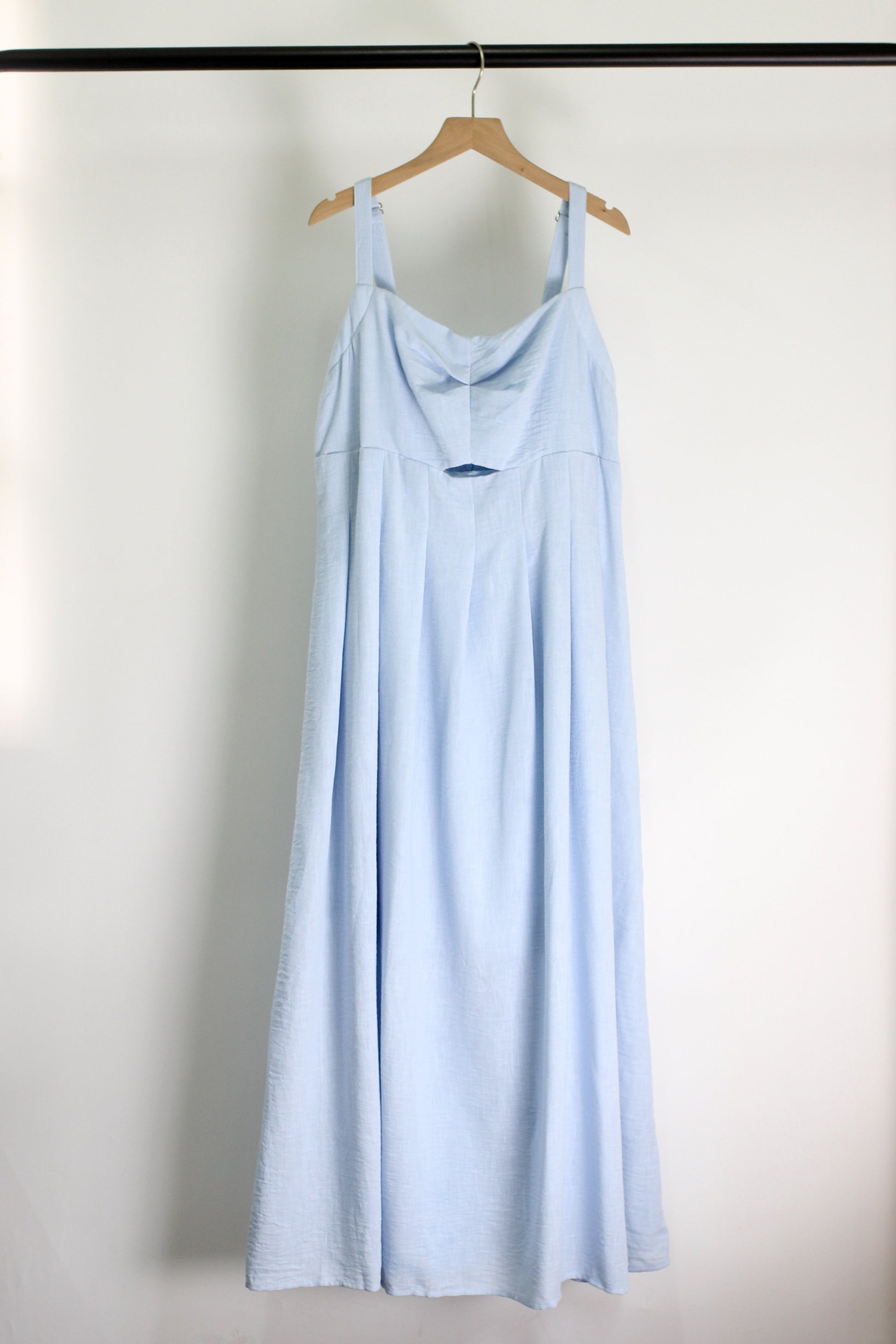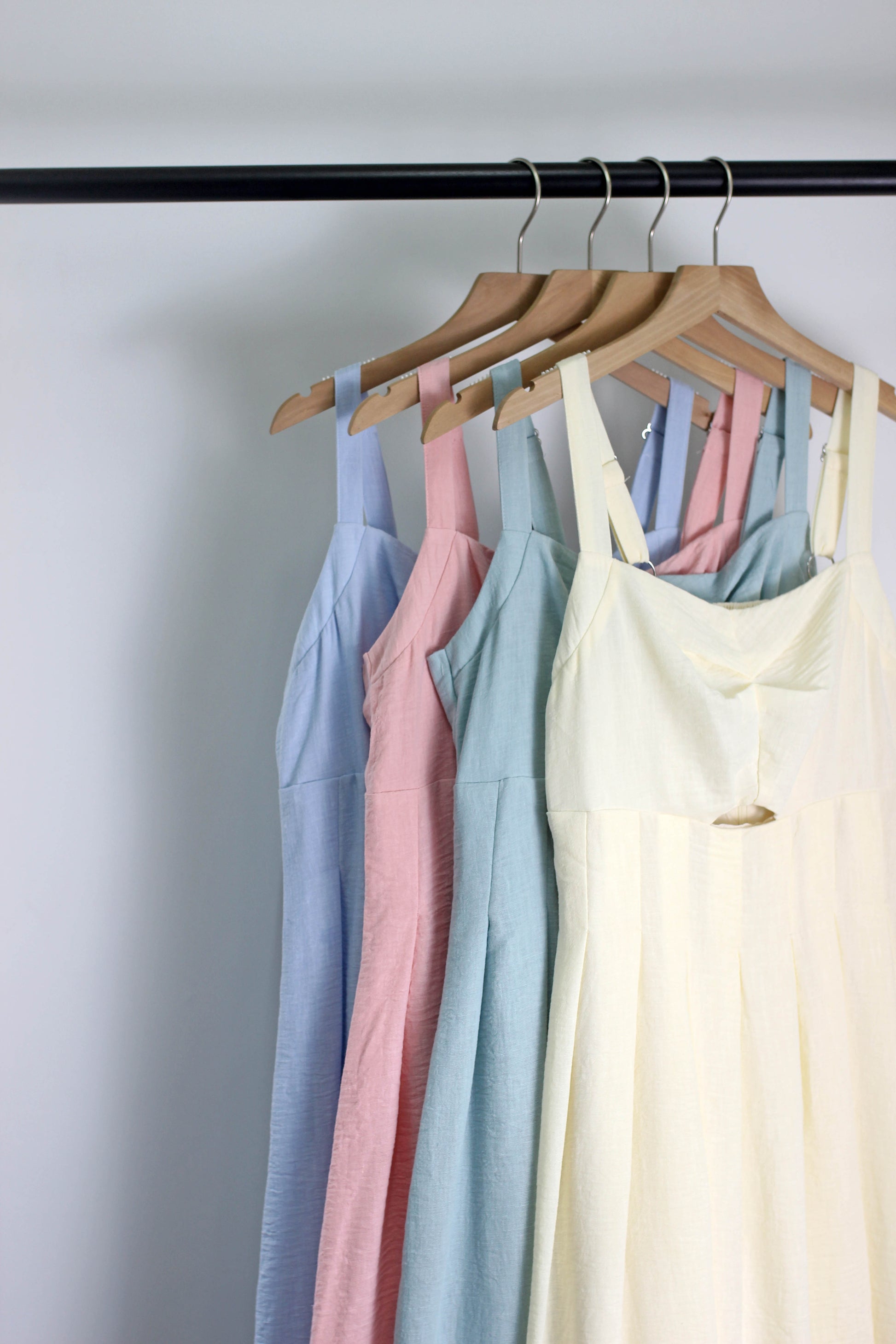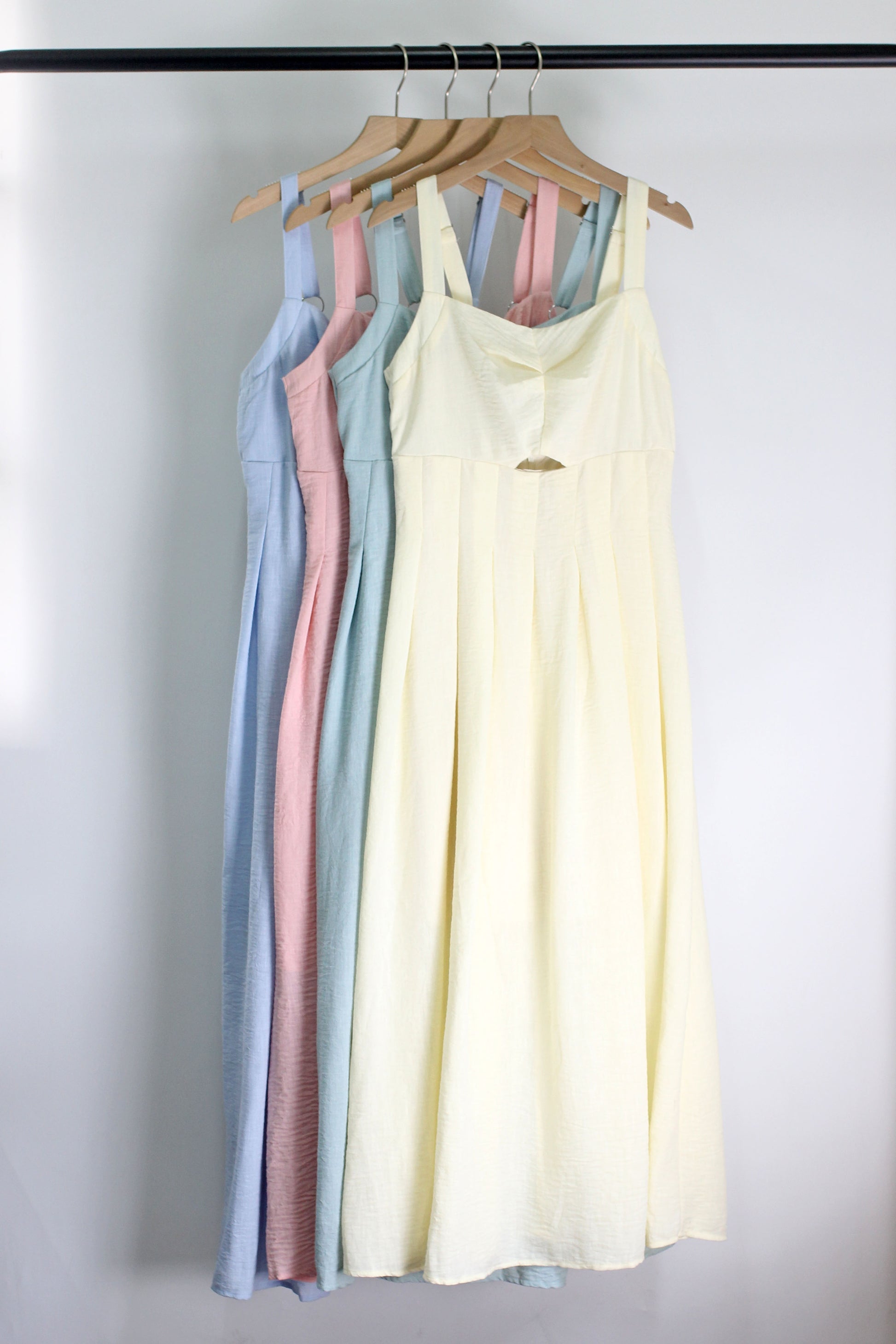 This breezy and feminine sleeveless midi sundress is perfect for warm-weather days. Made from a lightweight, breathable linen-blend feeling texture fabric, it features a flattering pleated A-line silhouette, adjustable shoulder straps, and stylish cut-out details at the front and back for added flair. The midi length and soft pastel color options?alight blue, blush pink, sage green, and buttery yellow?amake it ideal for spring and summer outfits, beach vacations, casual brunches, or garden parties. Pair with sandals and a woven bag for a chic, effortless look. Skirt part half lined.