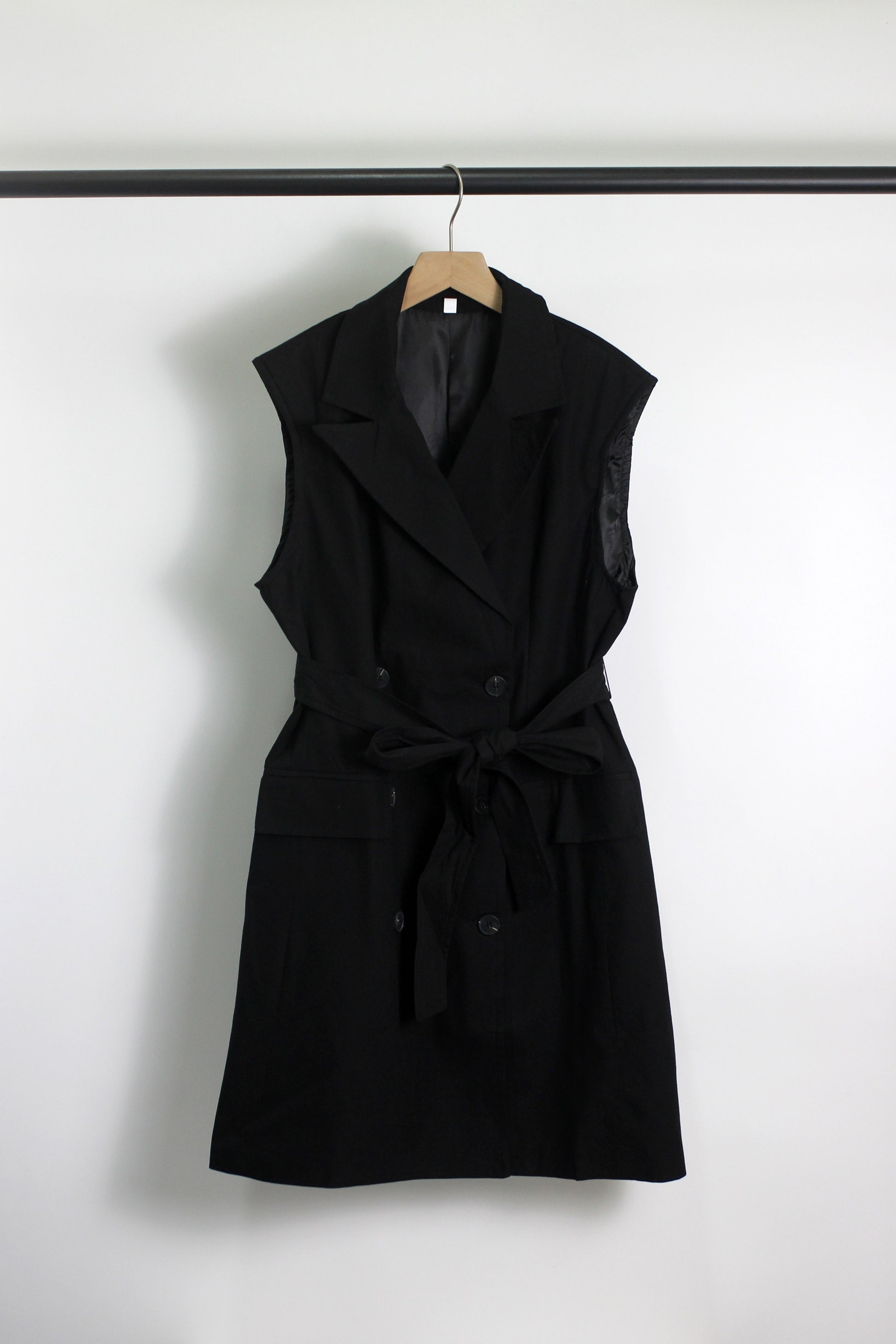 Step into effortless elegance with this sleeveless blazer dress featuring a sharp double-breasted design, tailored lapel collar, and a flattering waist tie belt. Crafted from smooth polyester-blend fabric, this structured piece transitions seamlessly from workwear to weekend brunch. Style it solo as a minimalist summer dress, or layer over a blouse as a chic vest coat.