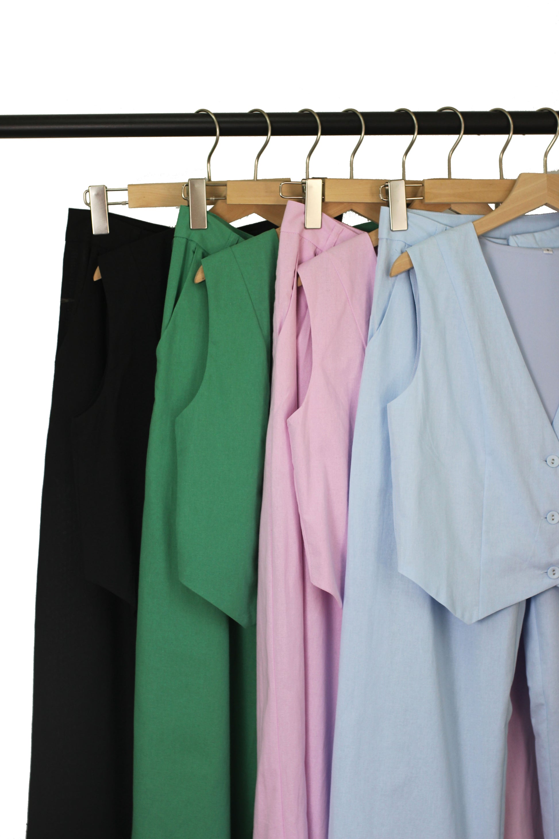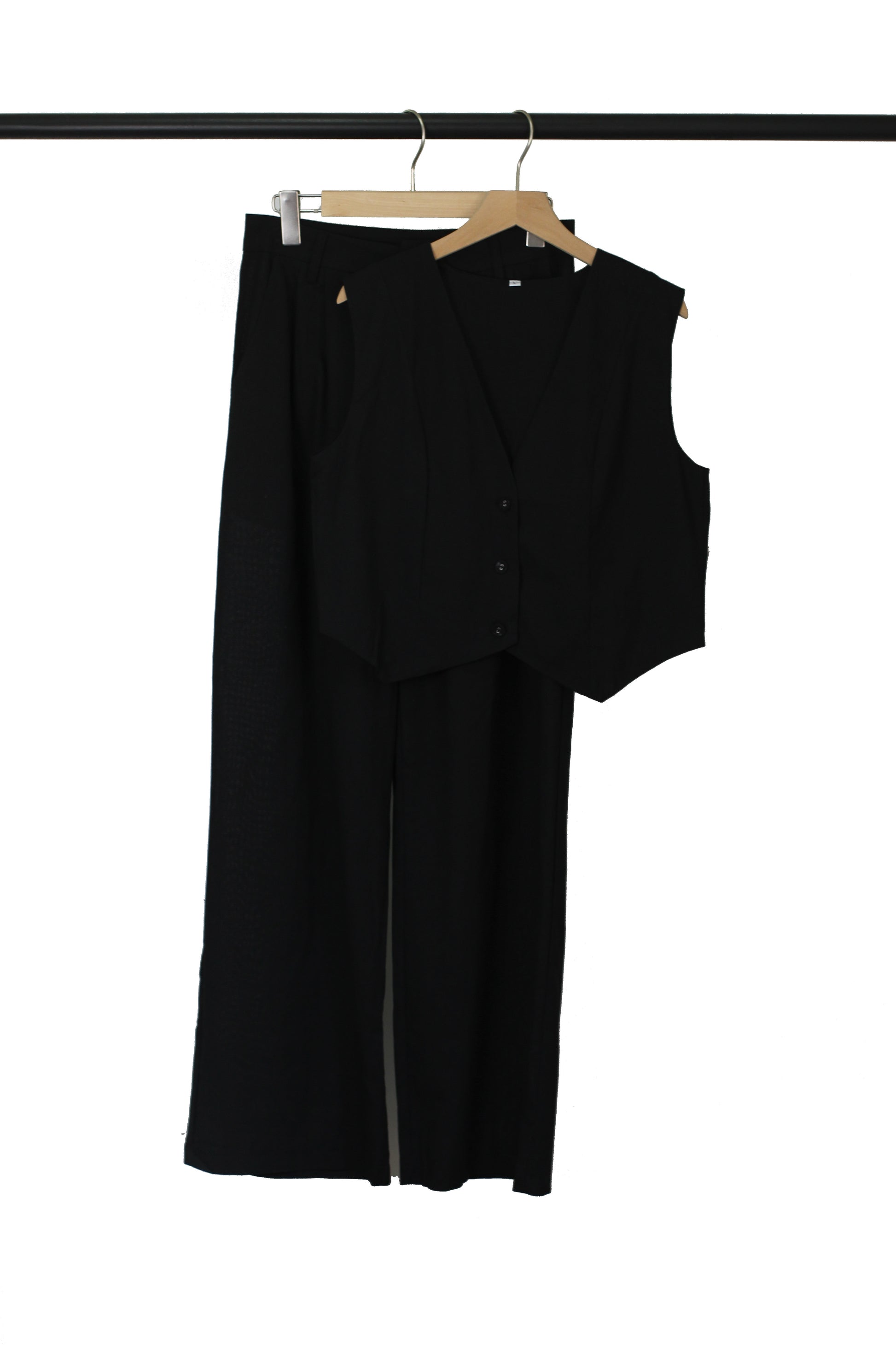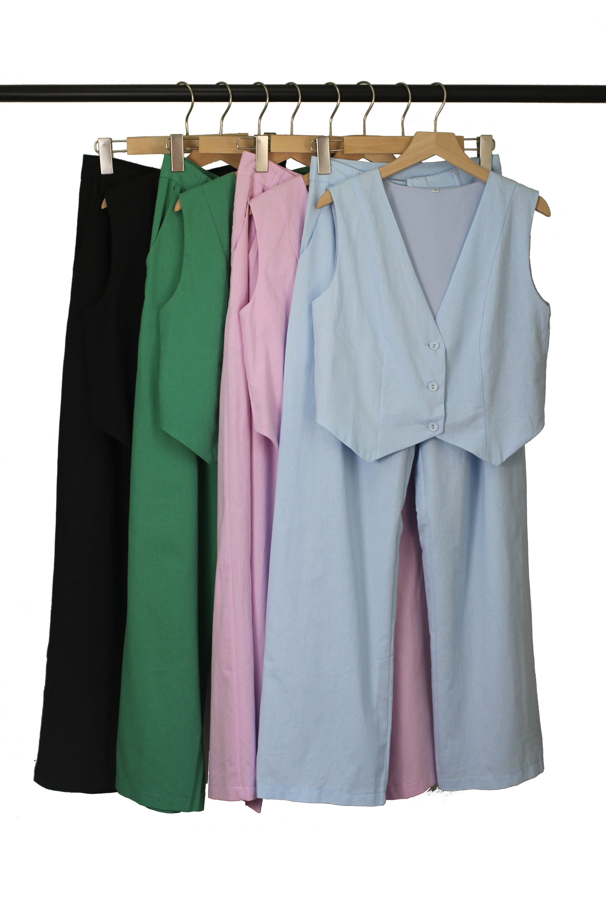 Women vest set, top with v-neck, sleeveless, front buttons closure, pants with wide leg, side pocket, front with zippler and hook closure.?