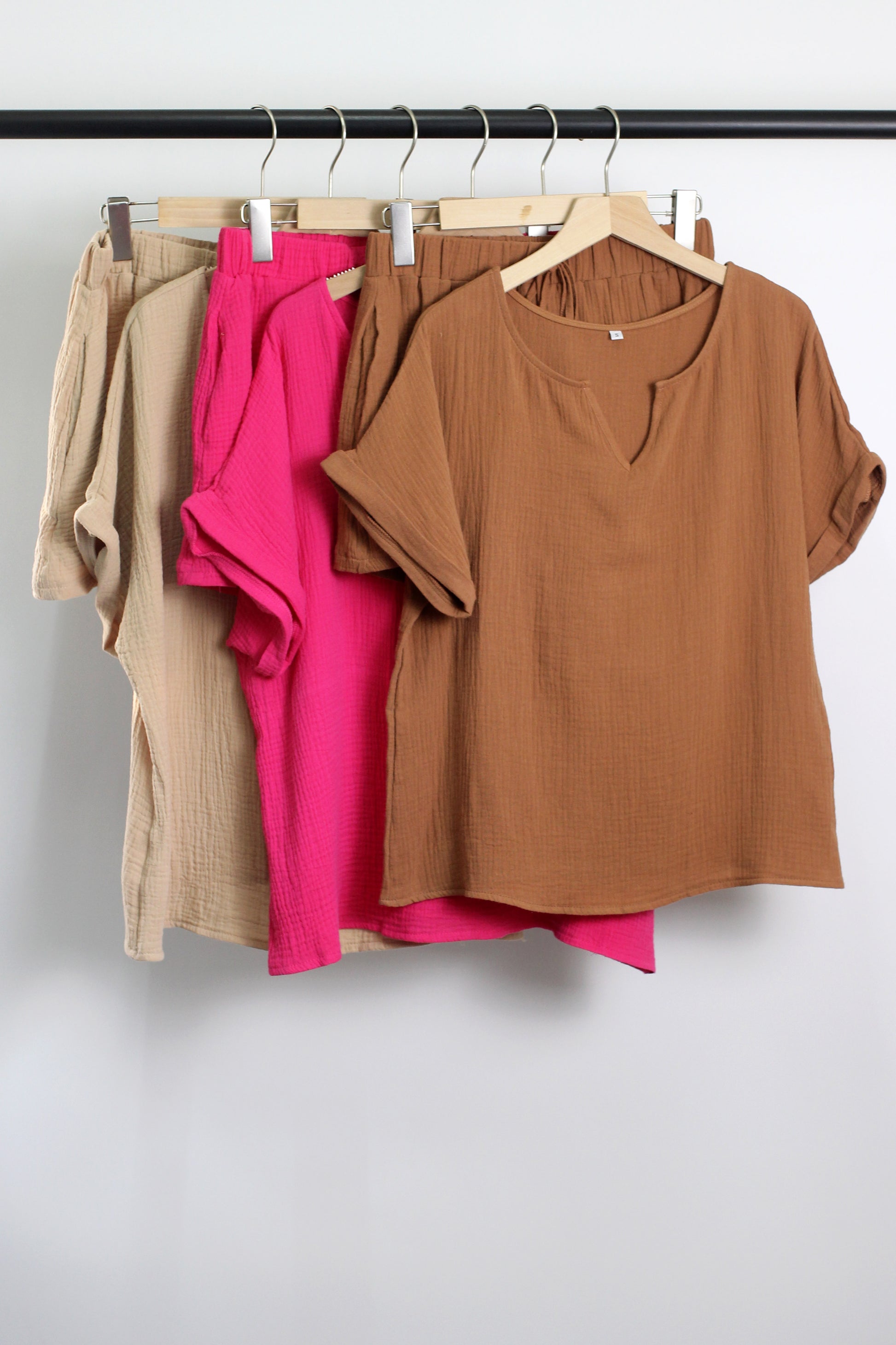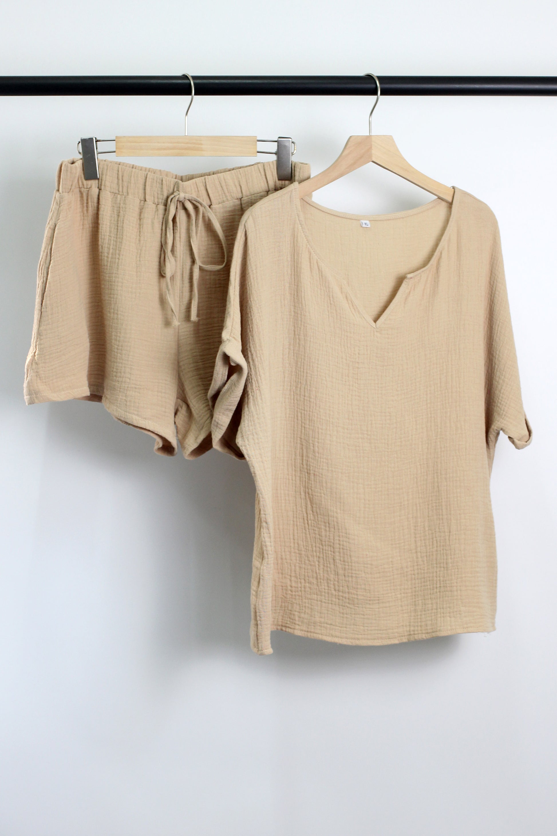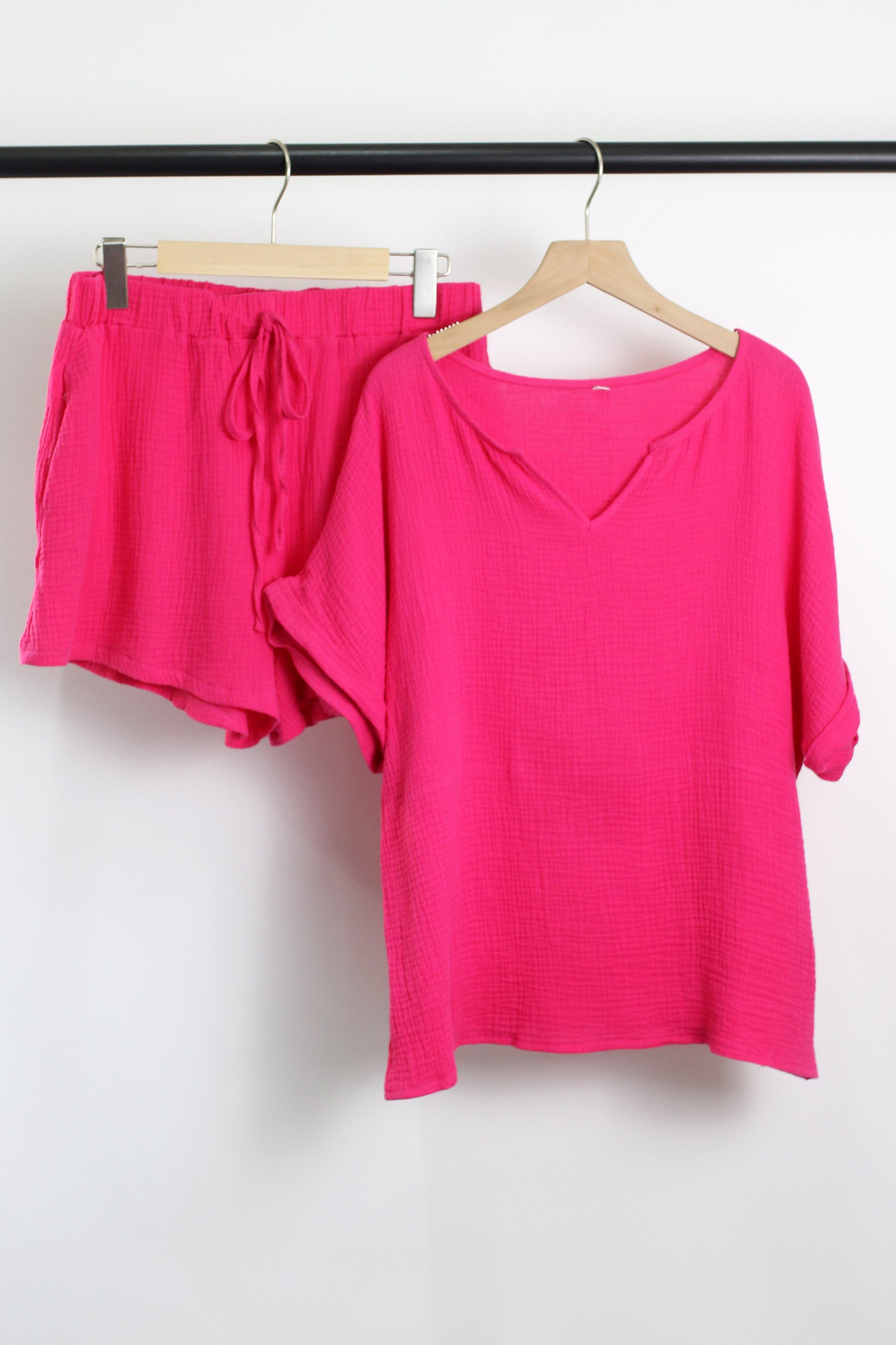 V-neck top with short sleeve and folded cuff, elastic wasitband with drawstring shorts, side pockets.?