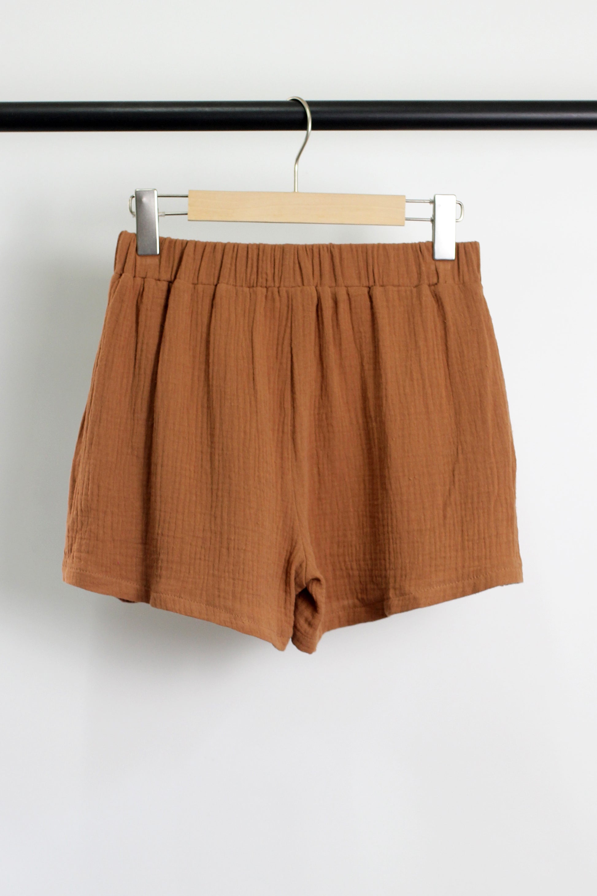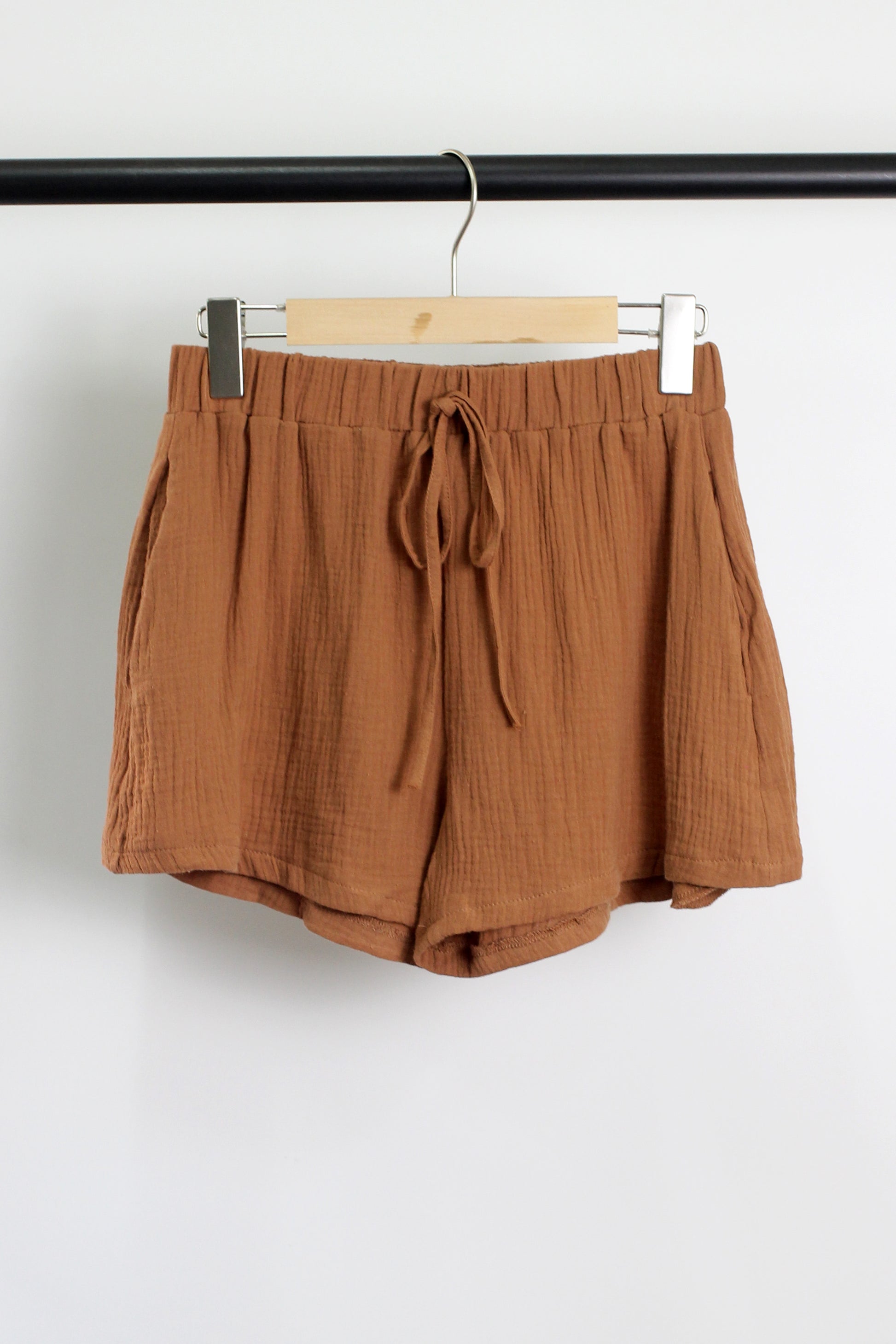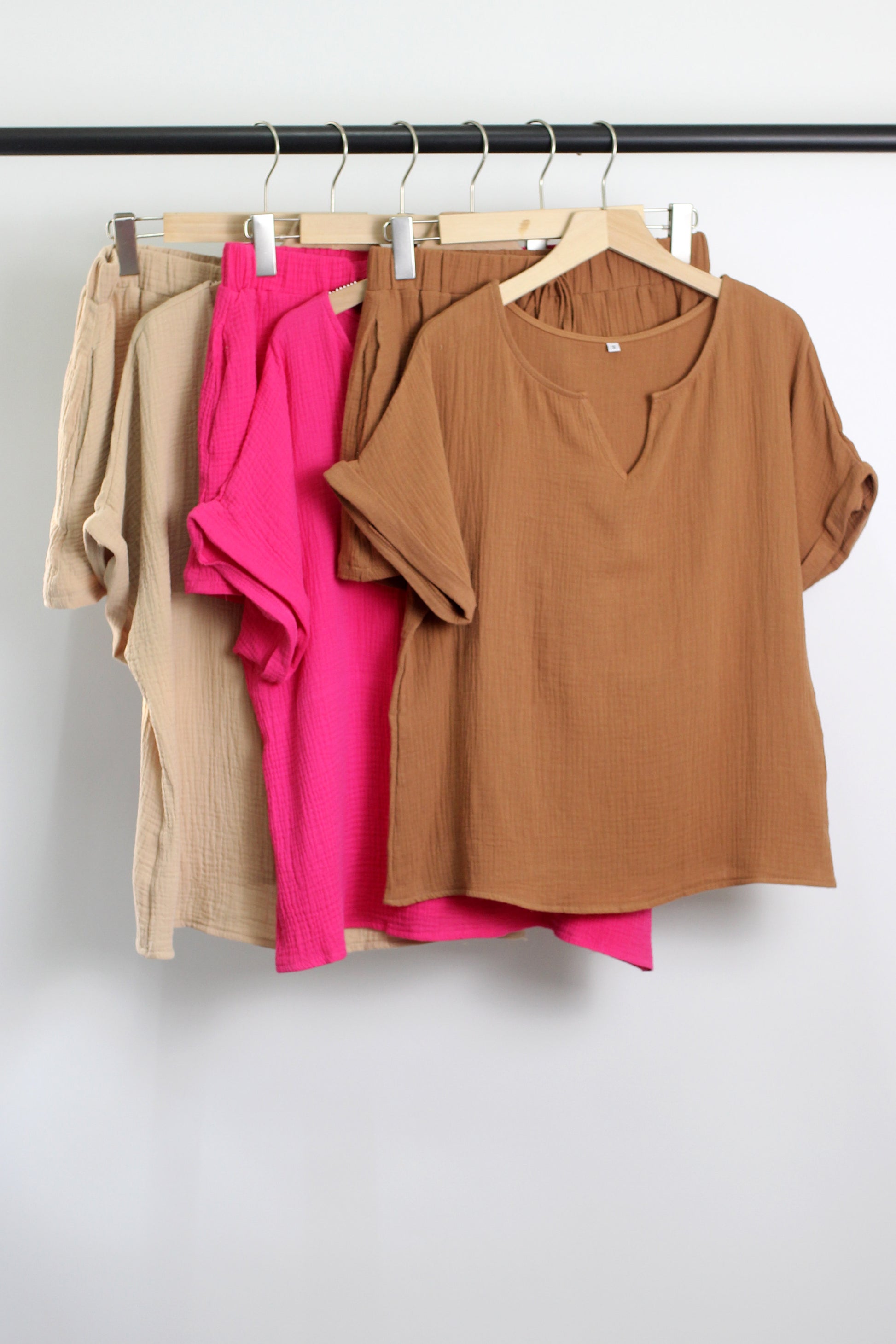 V-neck top with short sleeve and folded cuff, elastic wasitband with drawstring shorts, side pockets.?