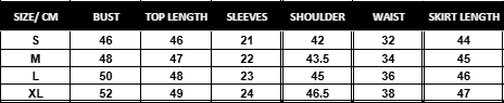 - Skirt: High-waisted, elastic waistband, A-line fit