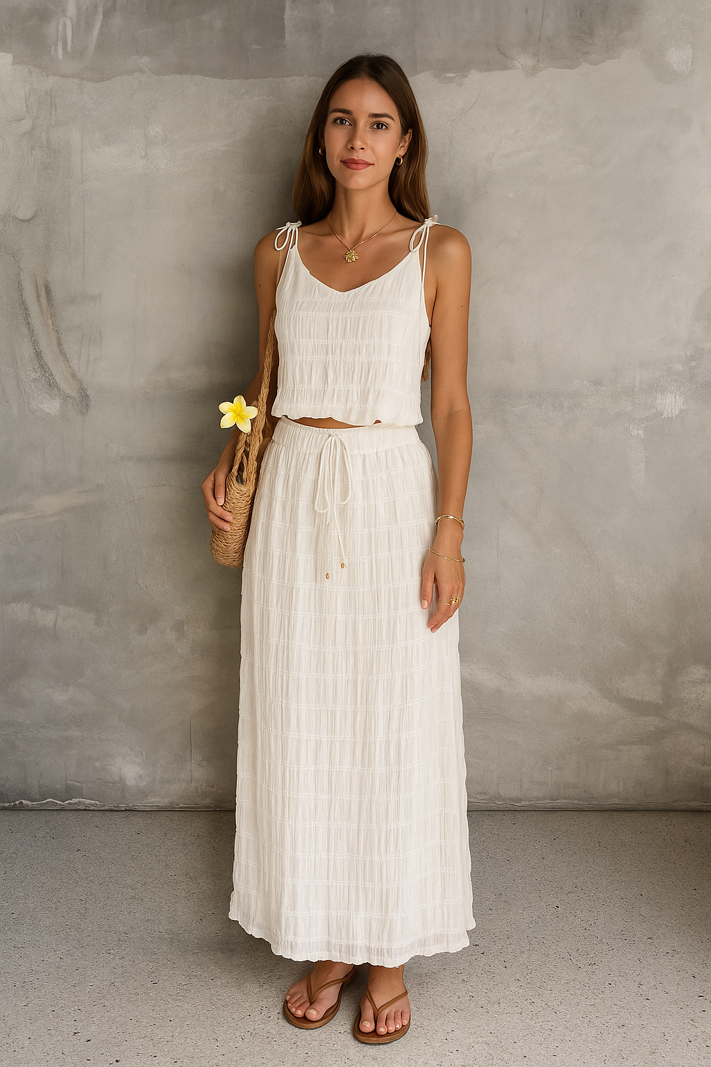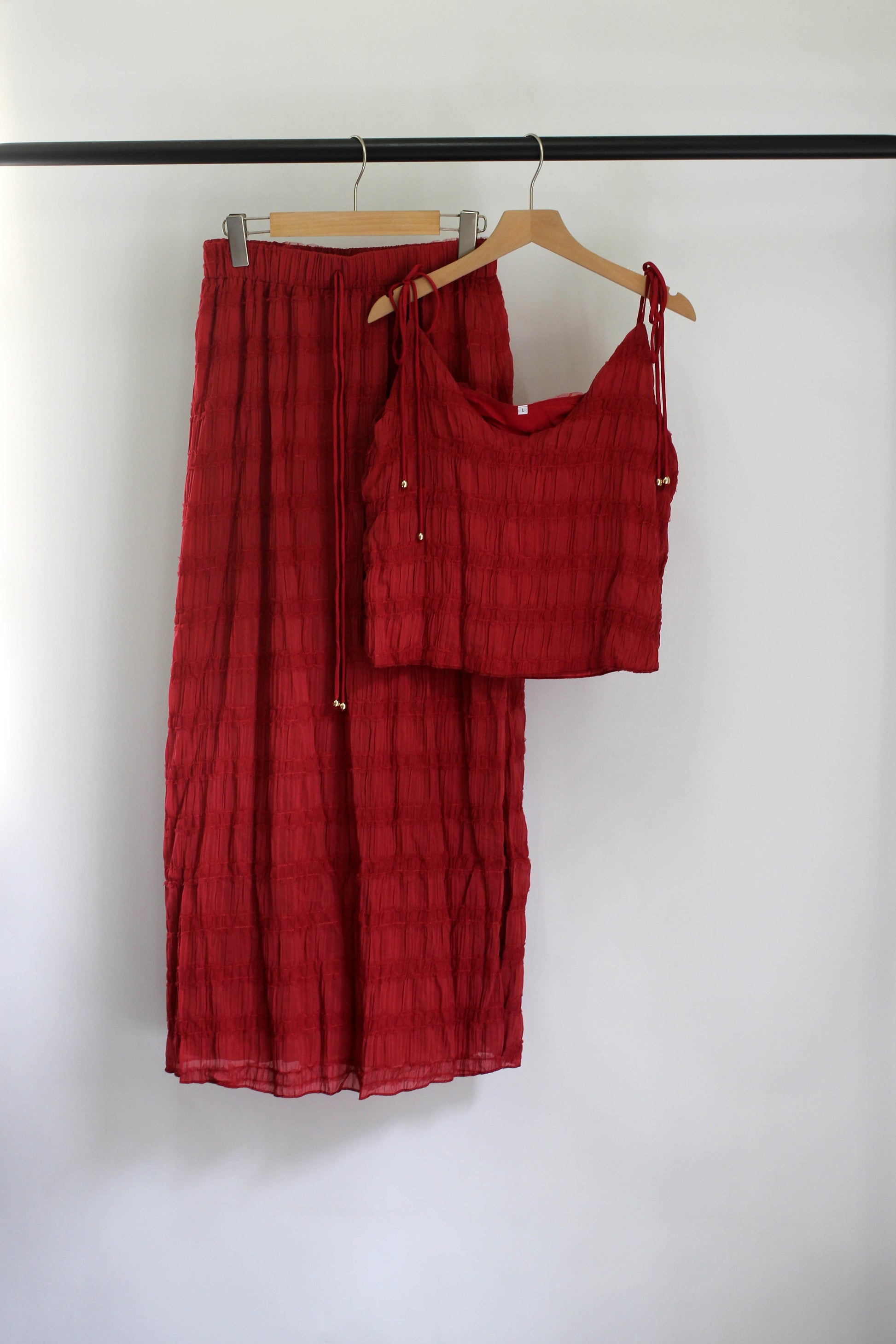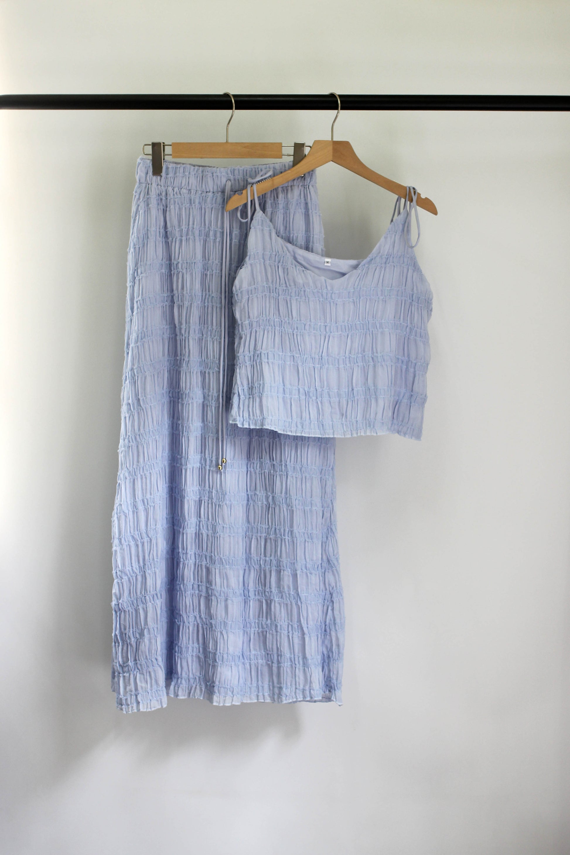 Elevate your summer wardrobe with this lightweight crinkled two-piece set, crafted from 100% polyester. The outfit features a sleeveless V-neck cami top with adjustable tie straps and a high-waisted drawstring maxi skirt. Designed with a relaxed silhouette and breezy fabric, this matching set delivers effortless elegance for vacations, resort wear, beach outings, or casual brunches. Available in multiple colors including sky blue, ivory, black, wine red, and pastel purple. Ideal for those who love boho style, chic loungewear, or travel-friendly outfits.