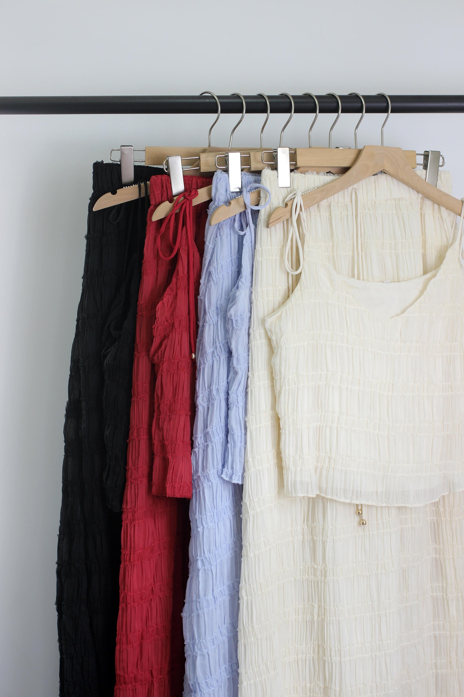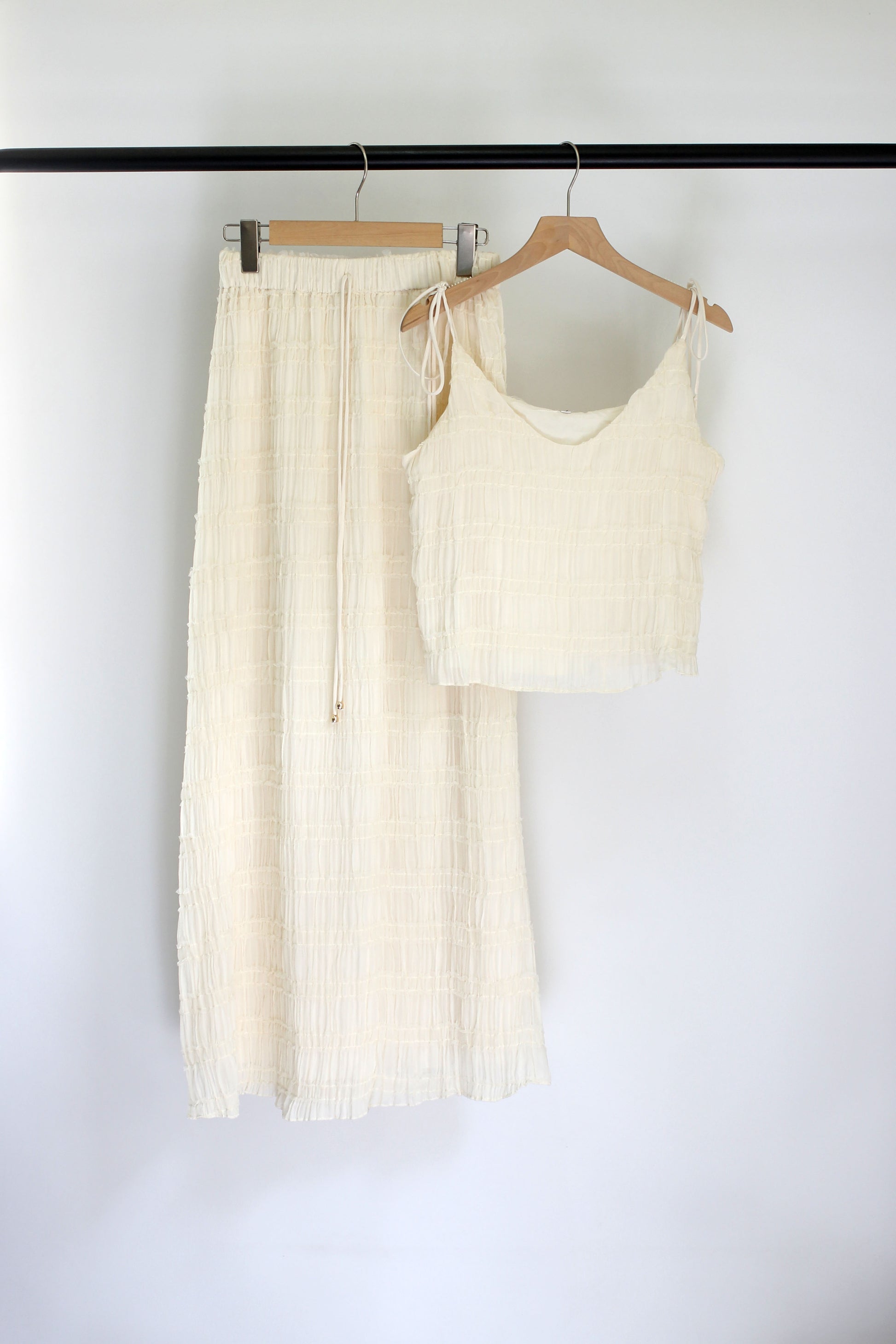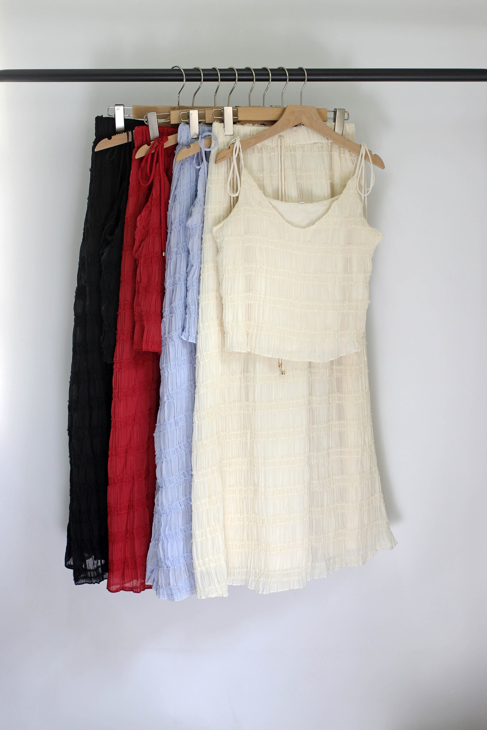 Elevate your summer wardrobe with this lightweight crinkled two-piece set, crafted from 100% polyester. The outfit features a sleeveless V-neck cami top with adjustable tie straps and a high-waisted drawstring maxi skirt. Designed with a relaxed silhouette and breezy fabric, this matching set delivers effortless elegance for vacations, resort wear, beach outings, or casual brunches. Available in multiple colors including sky blue, ivory, black, wine red, and pastel purple. Ideal for those who love boho style, chic loungewear, or travel-friendly outfits.