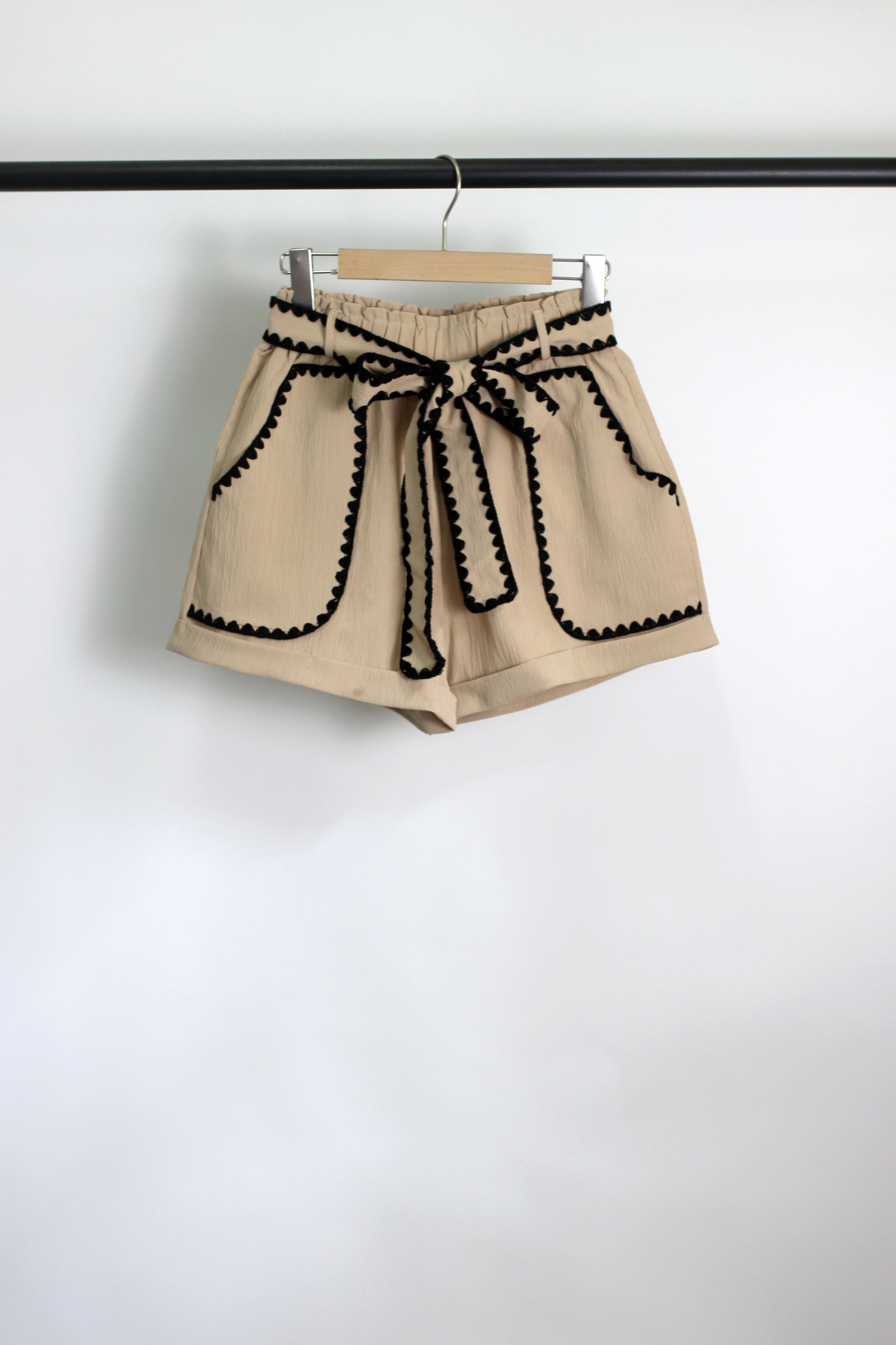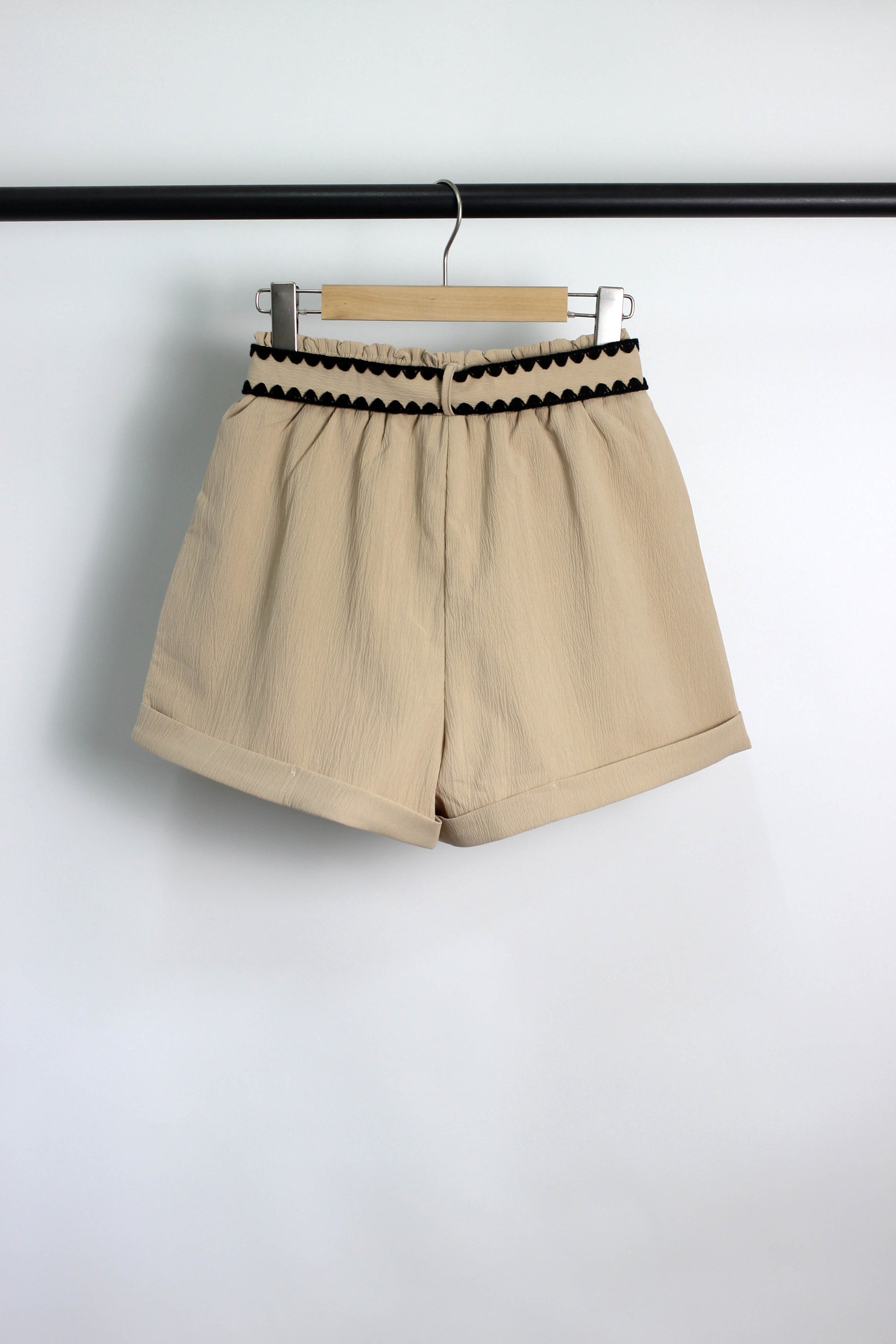 Add a playful yet polished touch to your summer wardrobe with these beige high-waisted shorts. Featuring a charming black scallop trim along the waist, pockets, and hem, these shorts come with a matching sash belt for a cinched silhouette. Made from lightweight fabric with a textured finish, they¡¯re perfect for brunch dates, vacations, or city strolls.