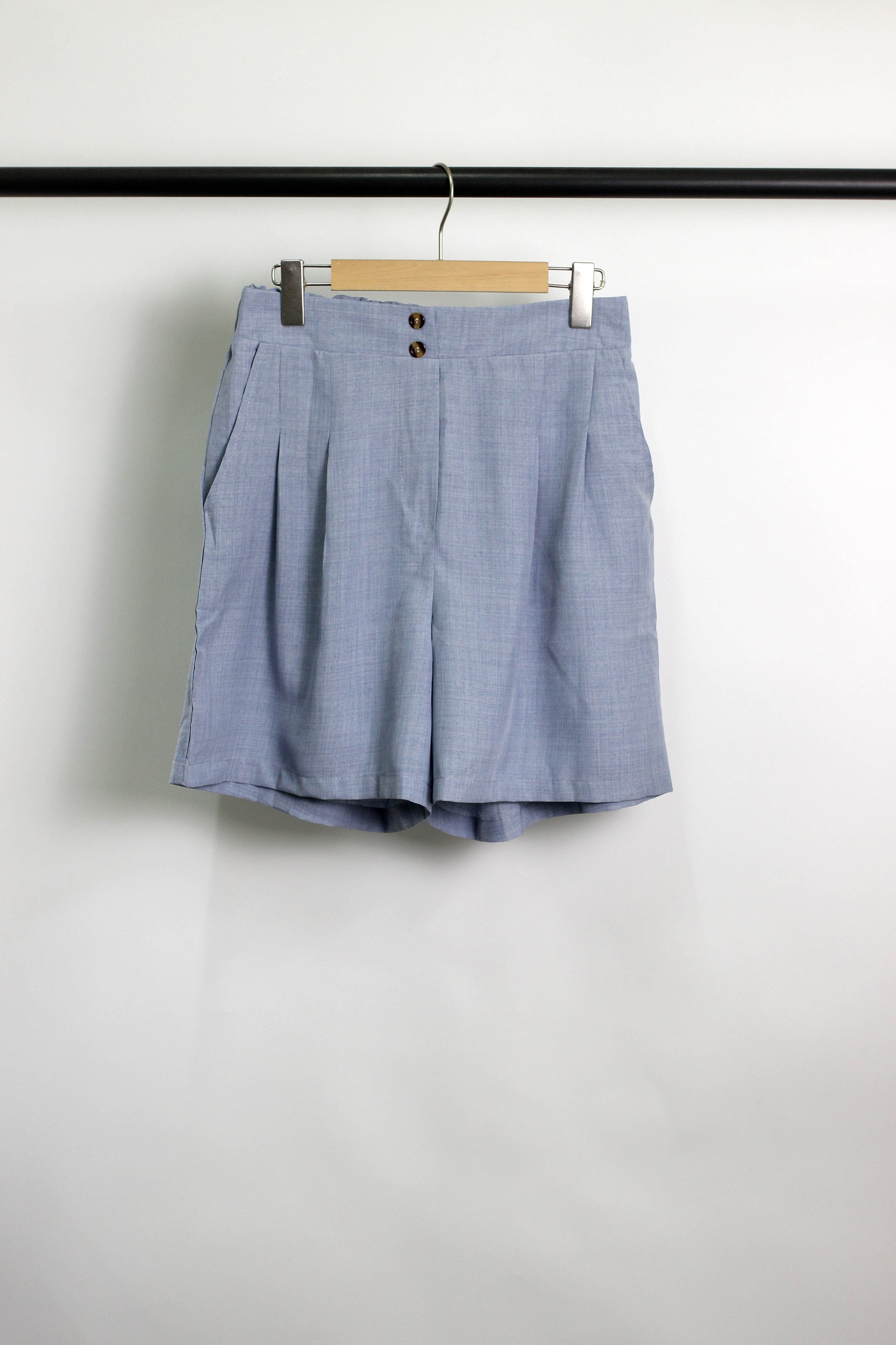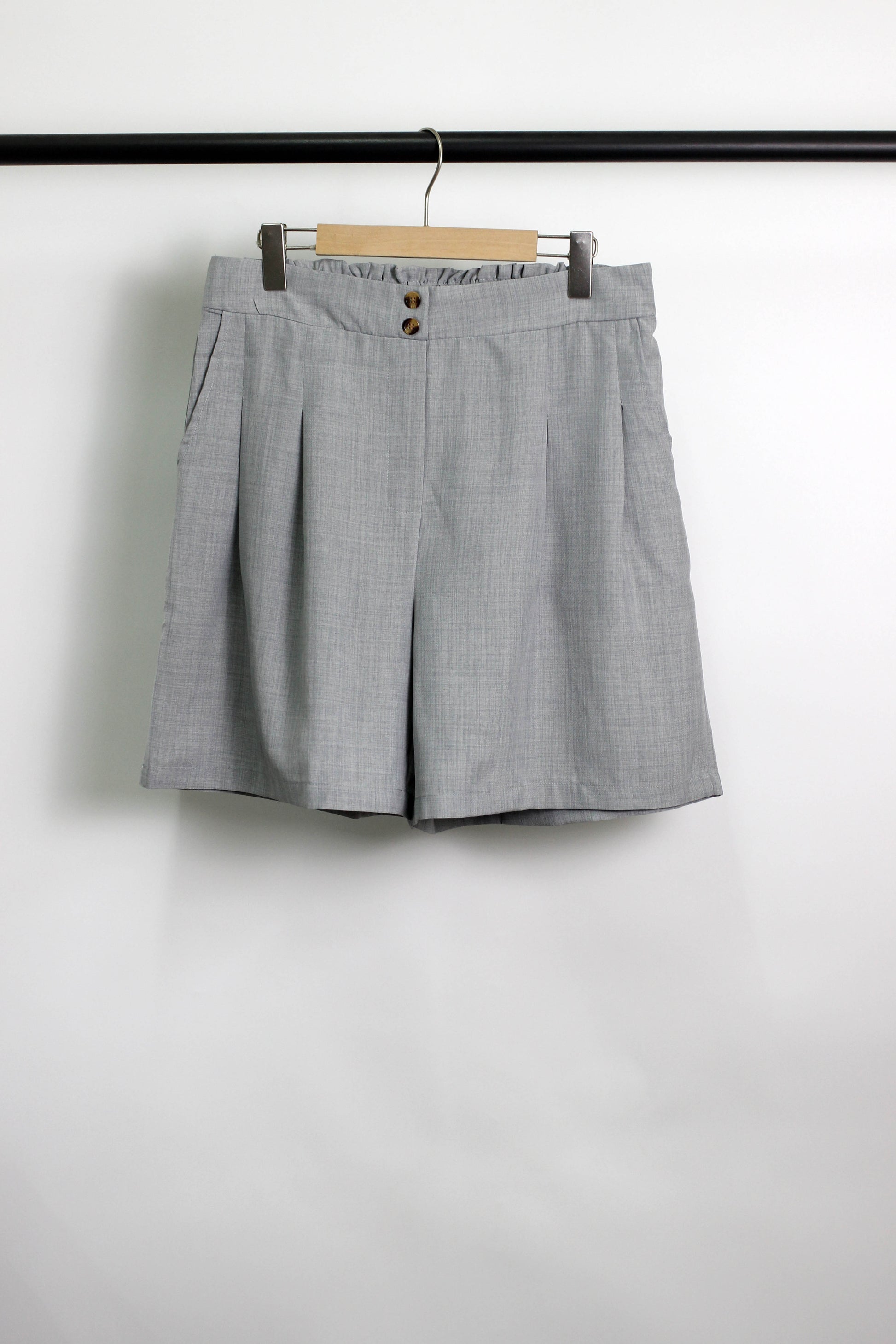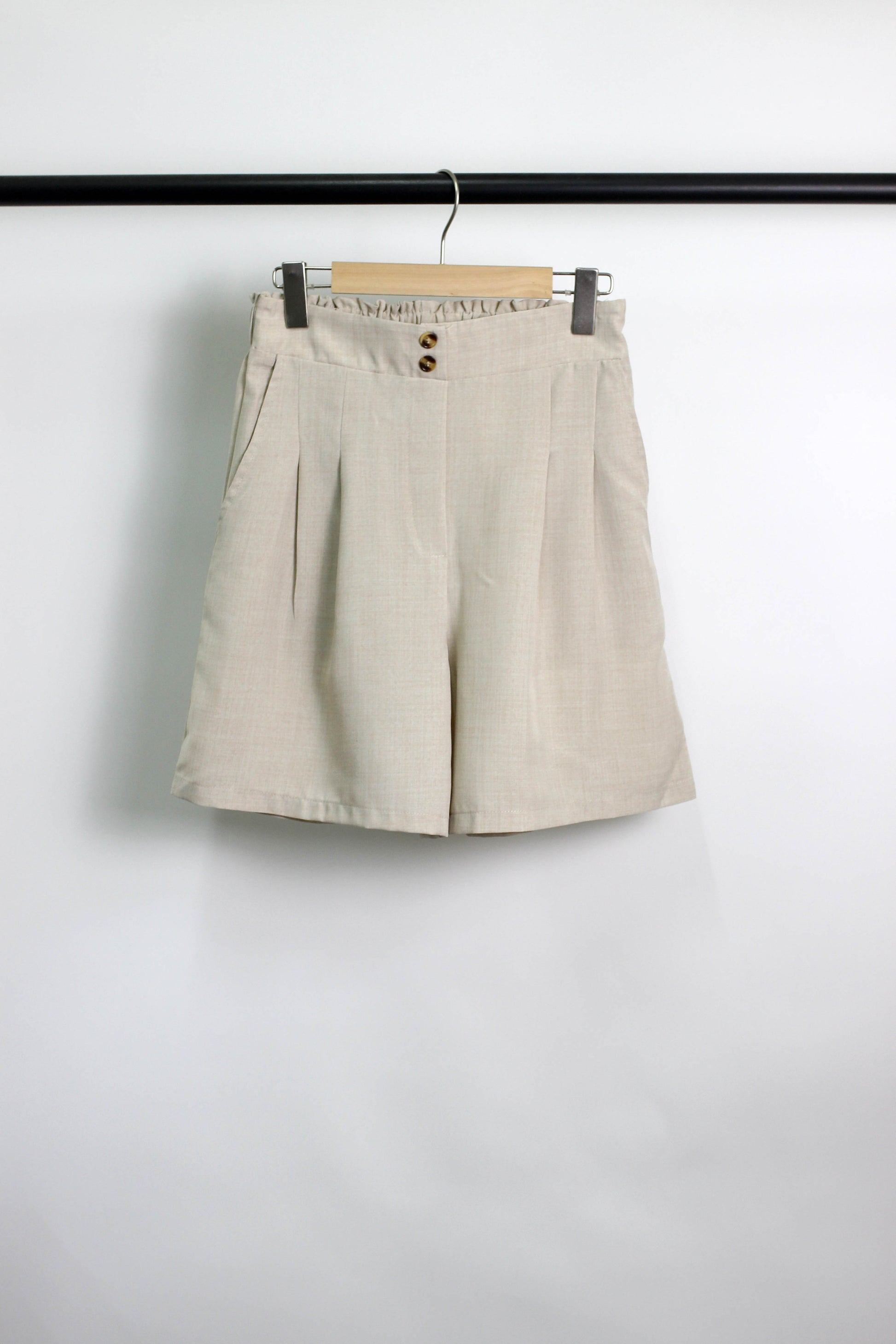Elevate your summer style with these chic high-waisted pleated shorts. Made from lightweight 100% polyester, these tailored shorts feature front pleats, side pockets, a button-front closure, and a comfortable elastic back waistband. Perfect for office wear or casual weekend looks, these shorts combine structure and softness for all-day wear.